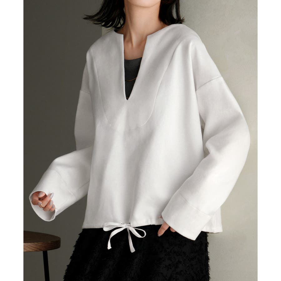 胸元が深く開いているのでインナーを合わせたレイヤードスタイルがオススメ。