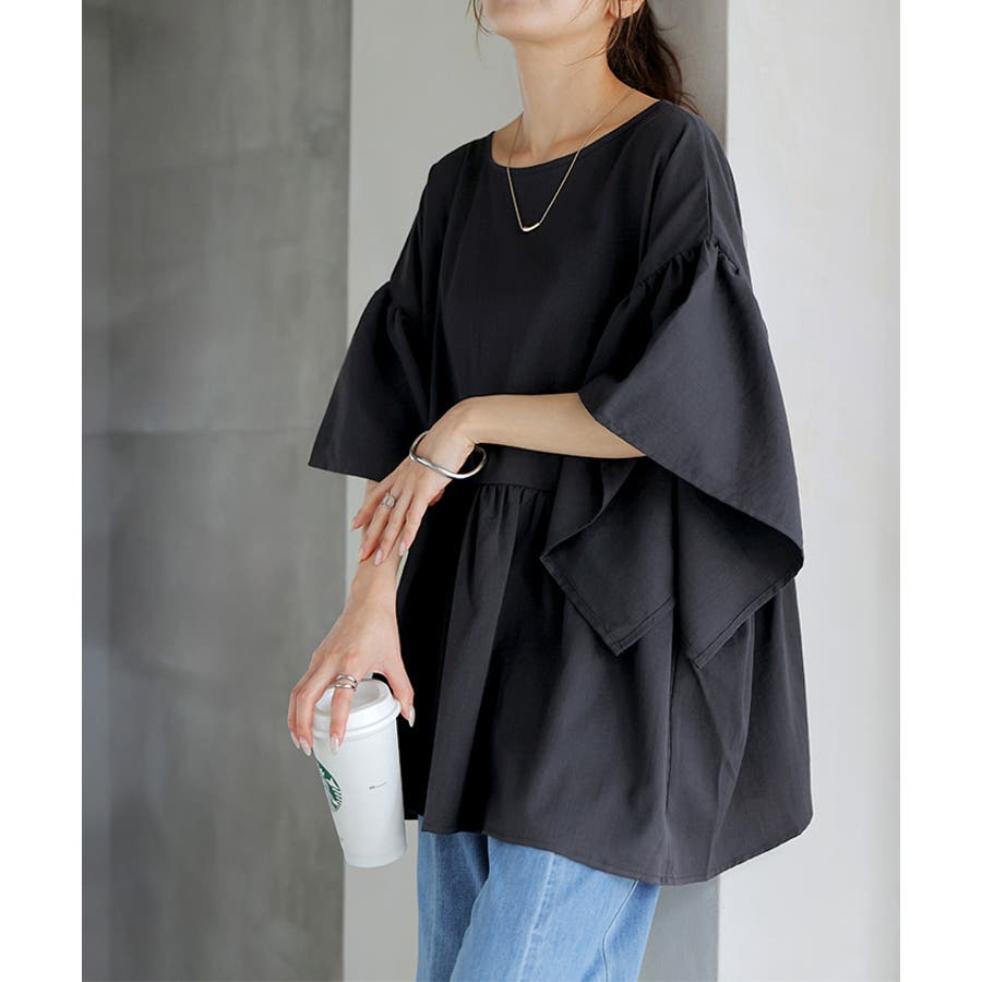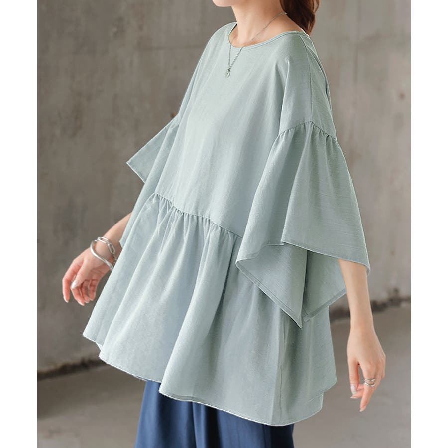 軽やかなフリルスリーブが女性らしさを引き立てるブラウスです。