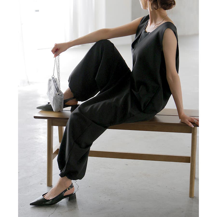 体のラインを拾わないシルエットで楽ちんなのにお洒落な雰囲気。太めの肩ストラップと深Vネックの組み合わせでキレイめカジュアルなスタイリングに。