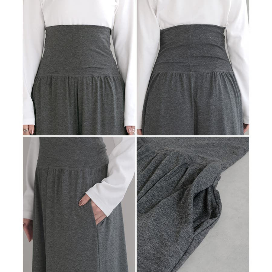 腹巻き一体型でお腹を冷えから守るデザインのワイドパンツです。
