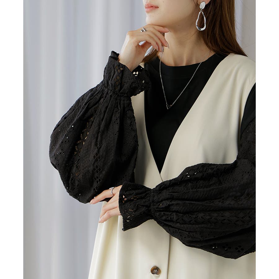 レースのキャンディスリーブがフェミニンさを高めるトップスです。