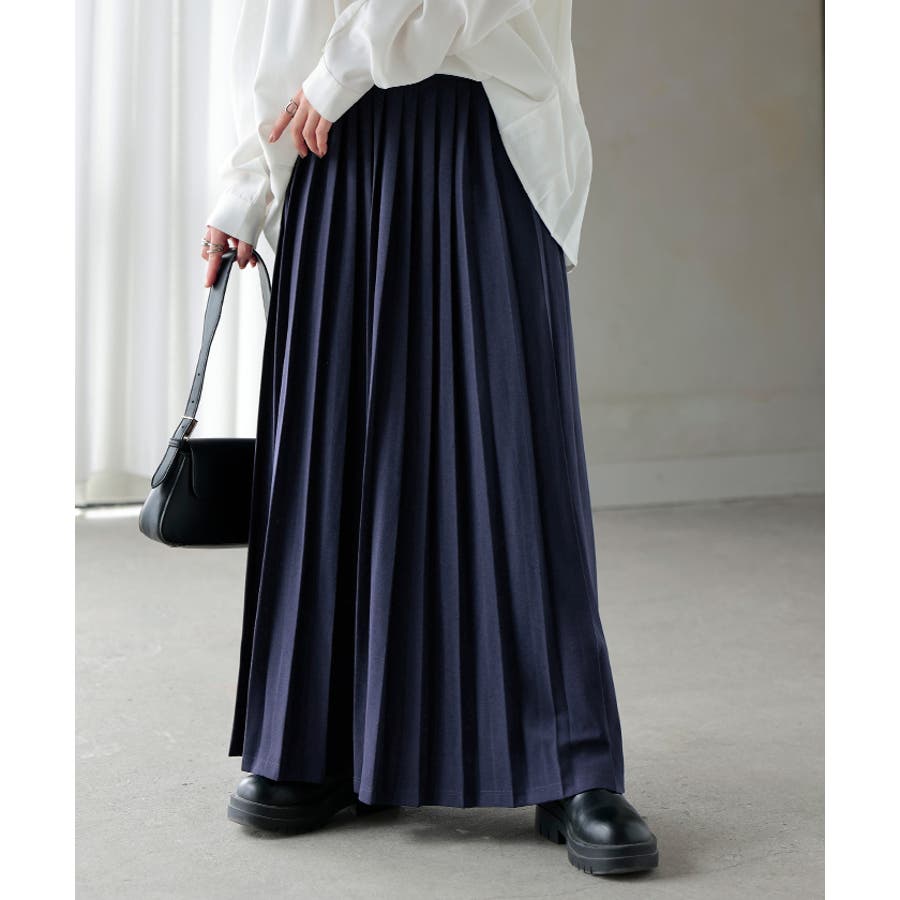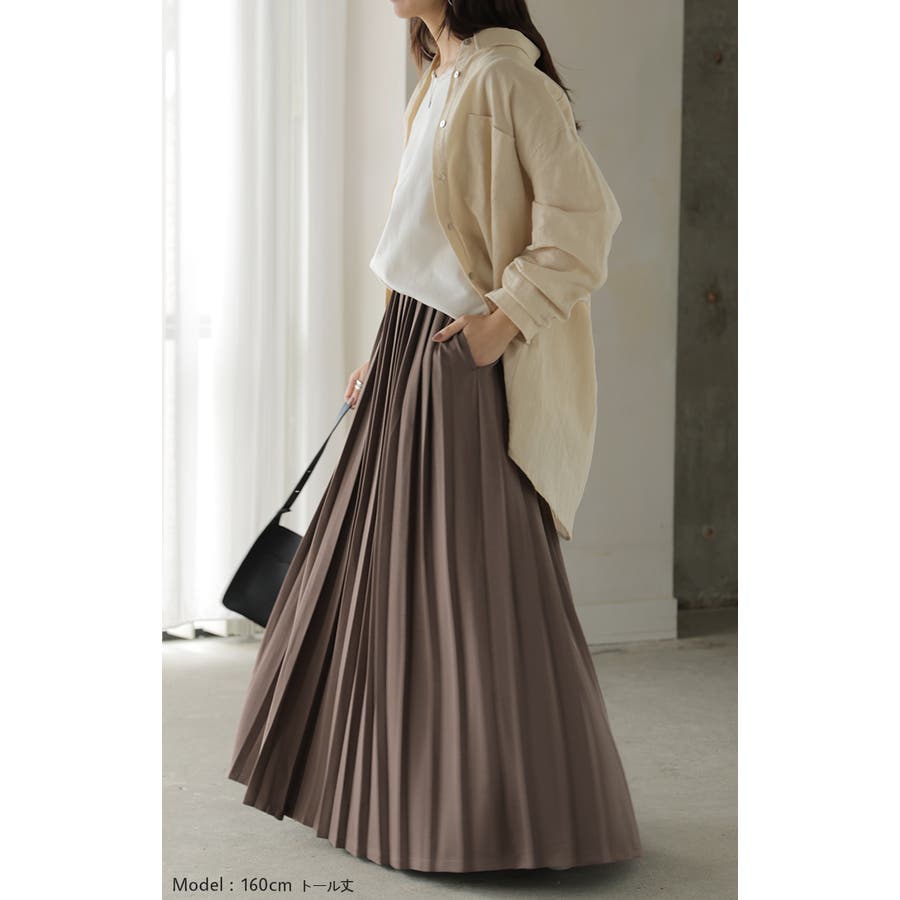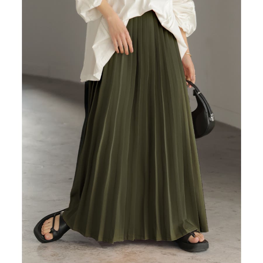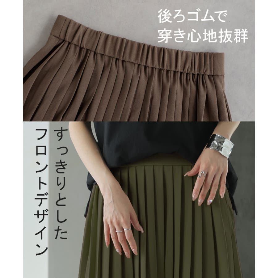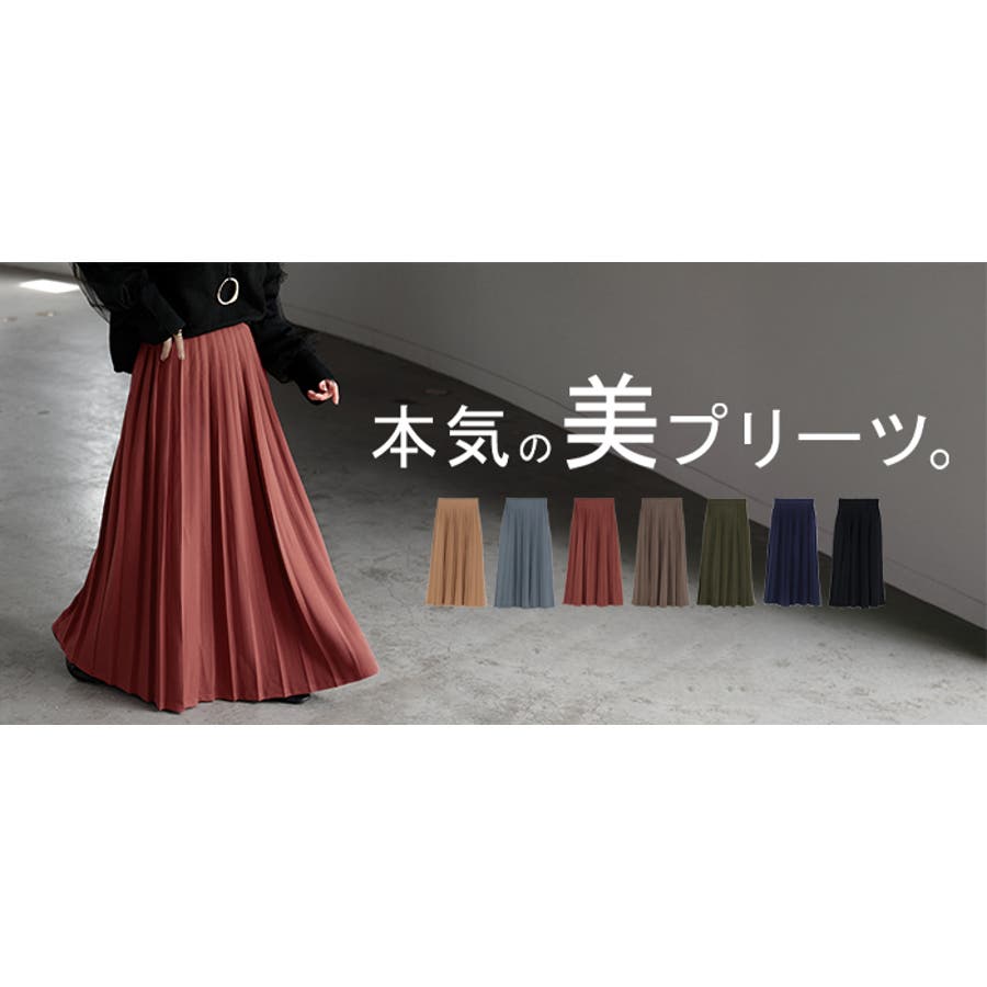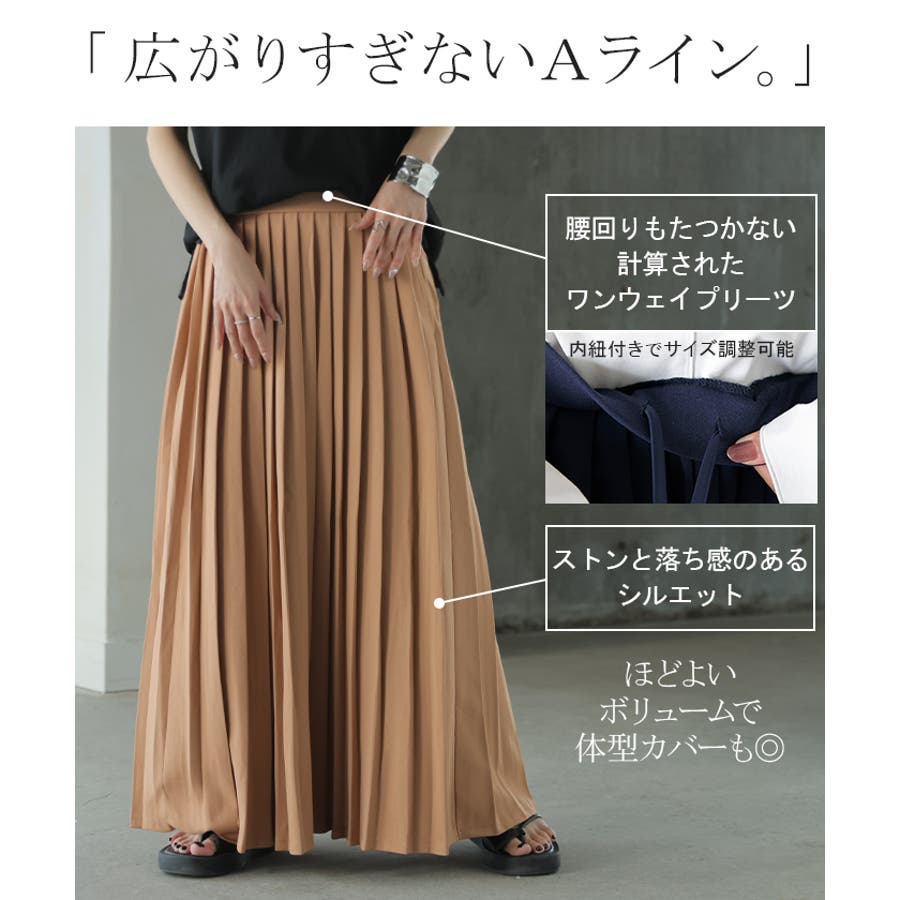 広がり過ぎないシルエットと立体感のある太めのプリーツ効果ですっきり体型カバー。