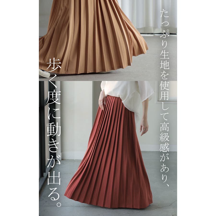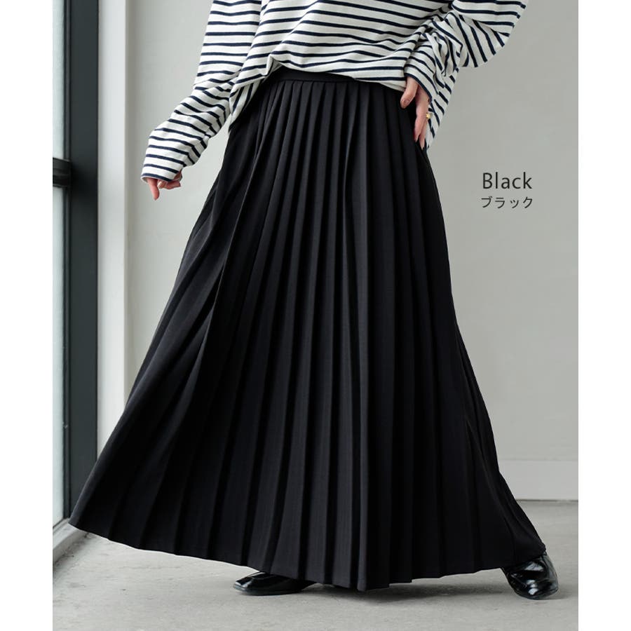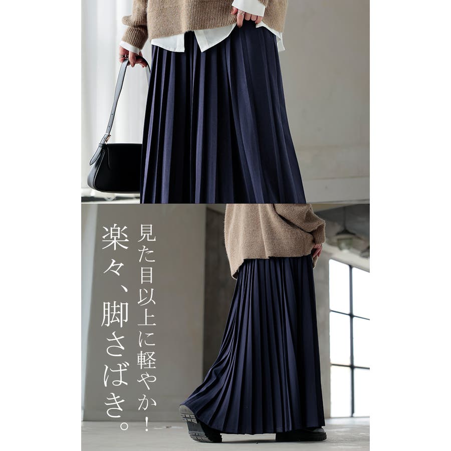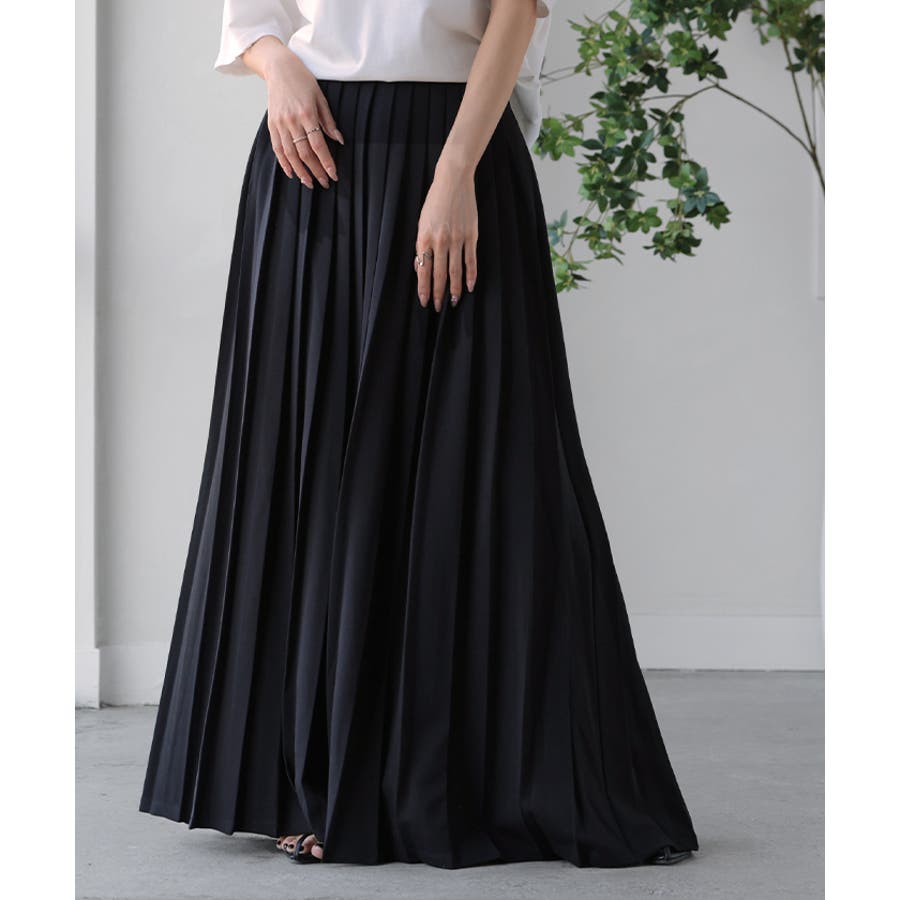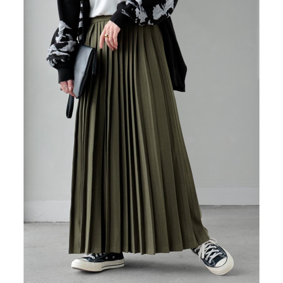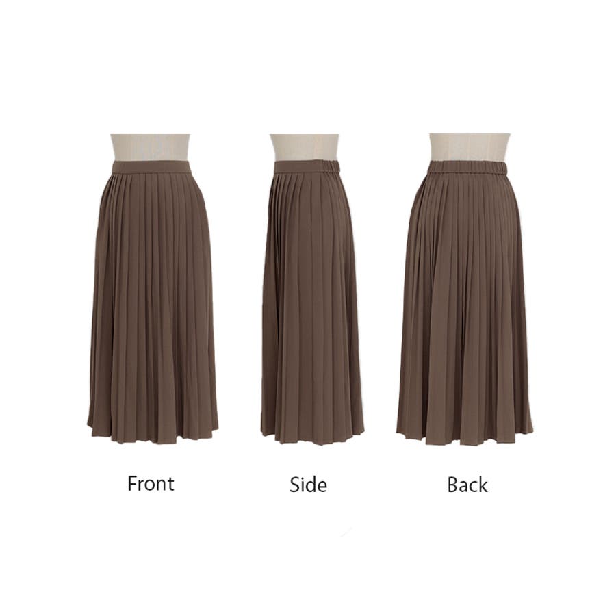 広がり過ぎないシルエットと立体感のある太めのプリーツ効果ですっきり体型カバー。