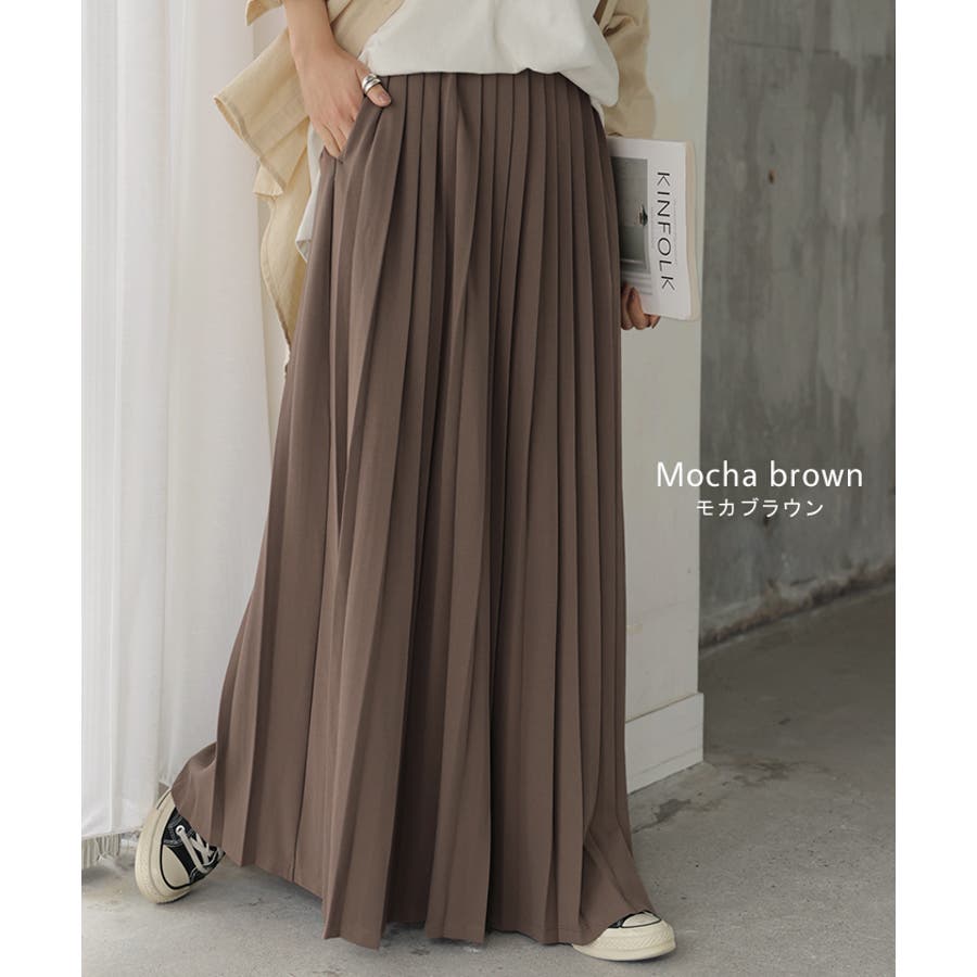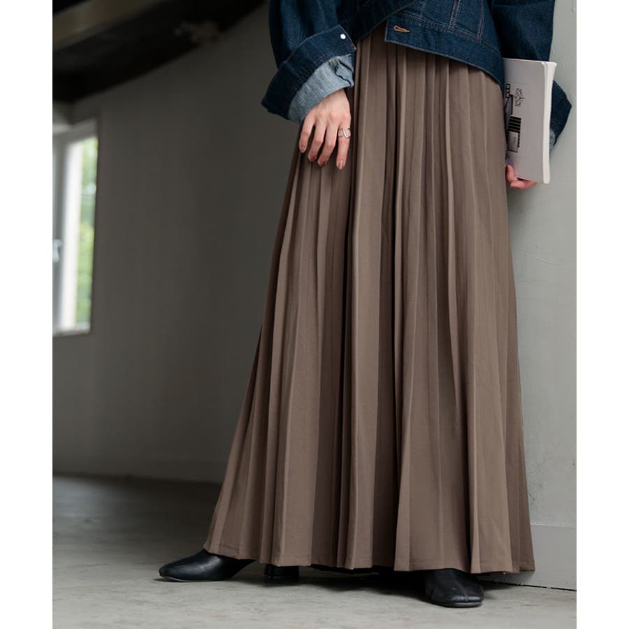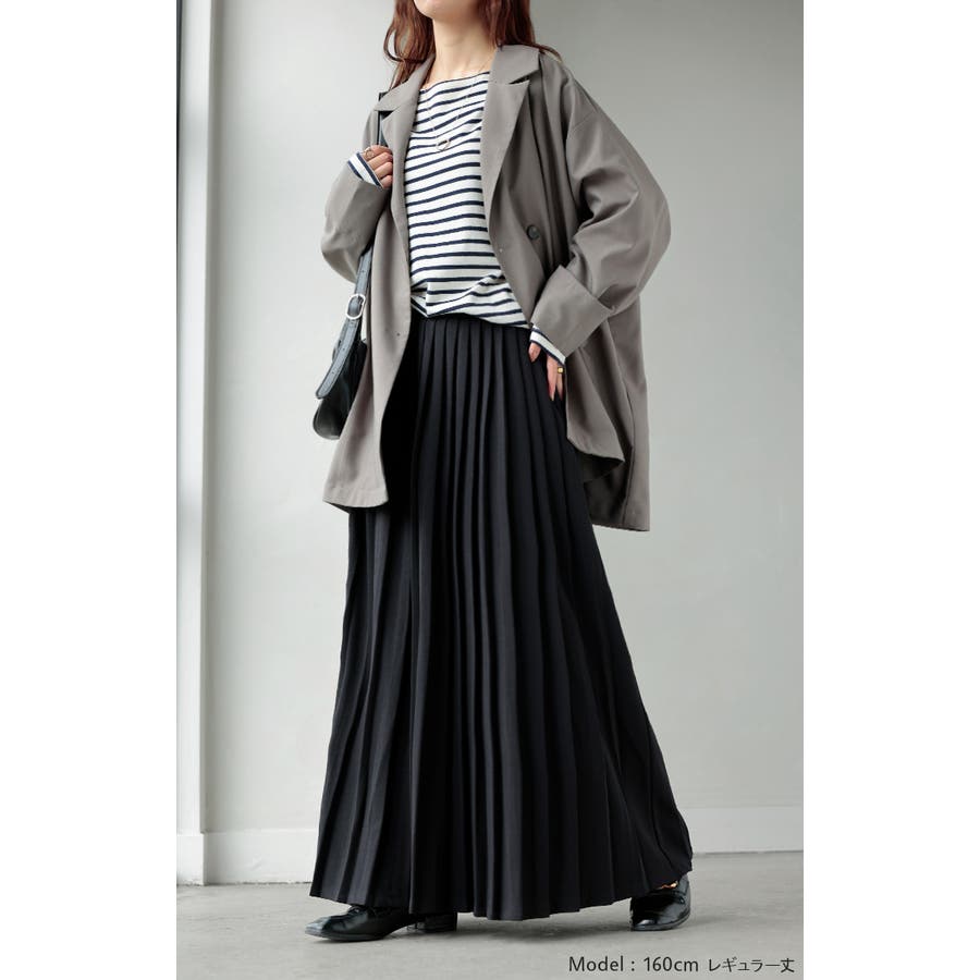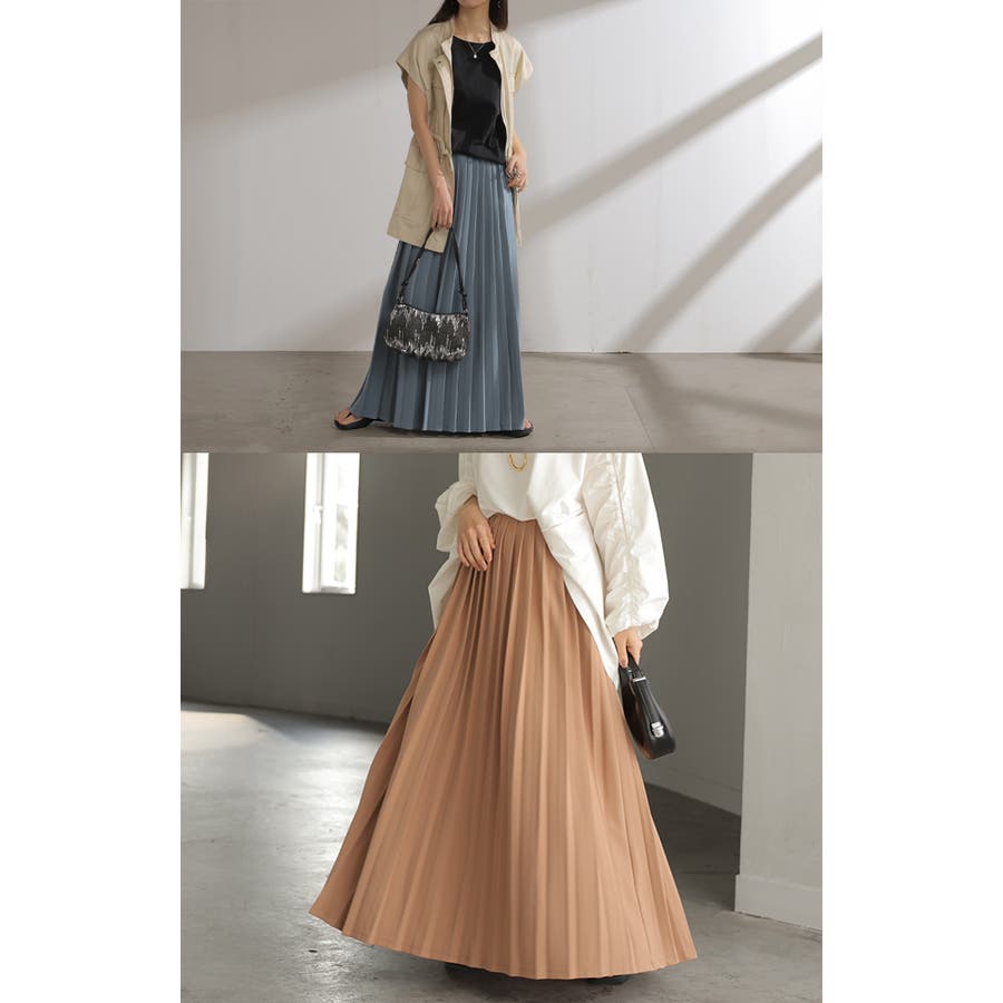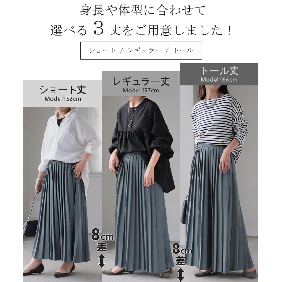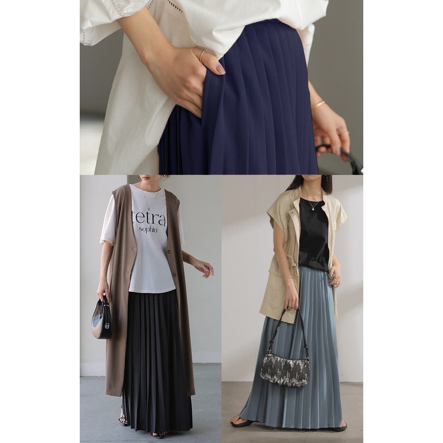 広がり過ぎないシルエットと立体感のある太めのプリーツ効果ですっきり体型カバー。