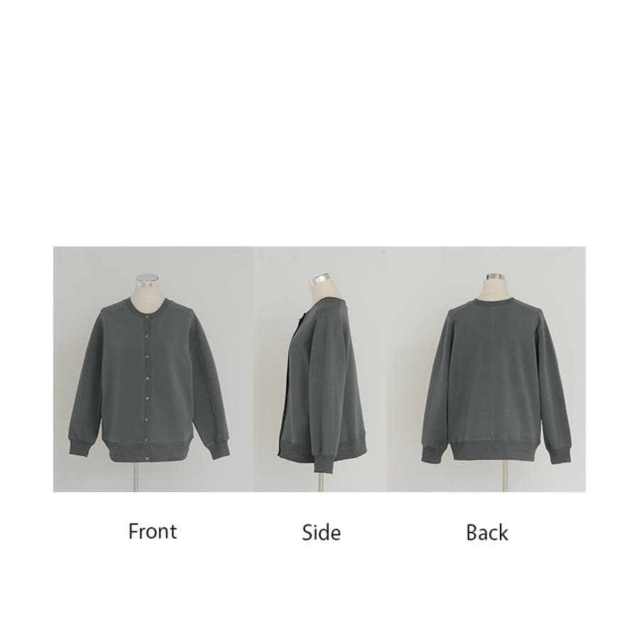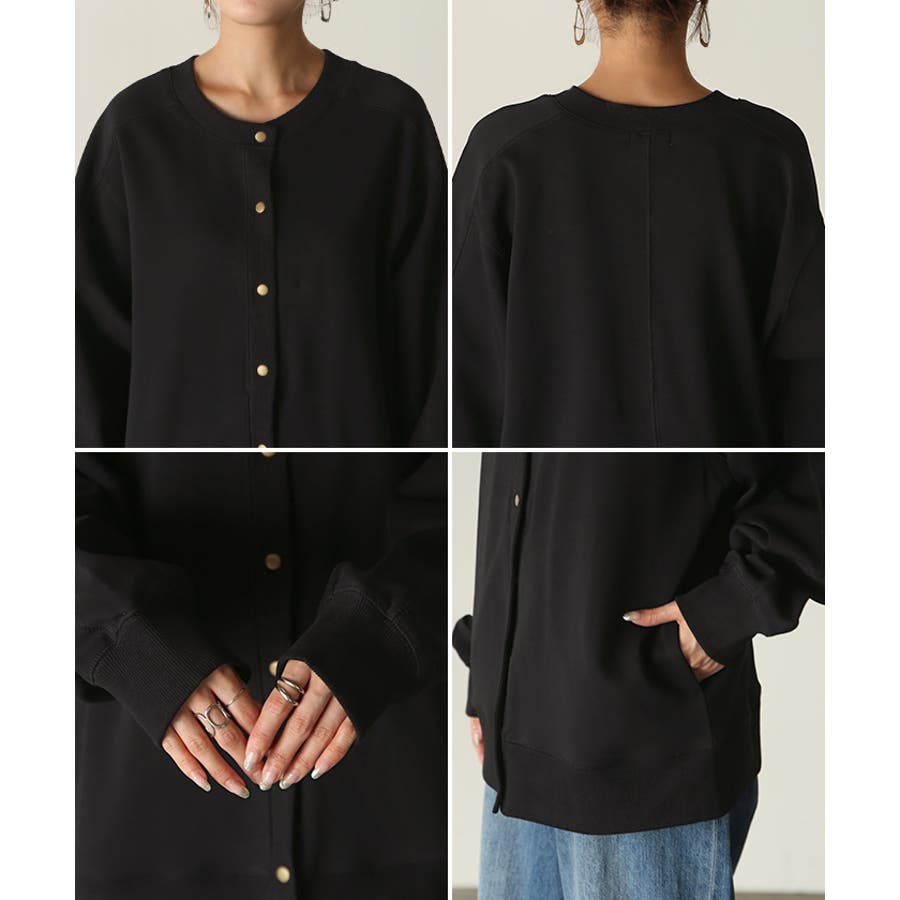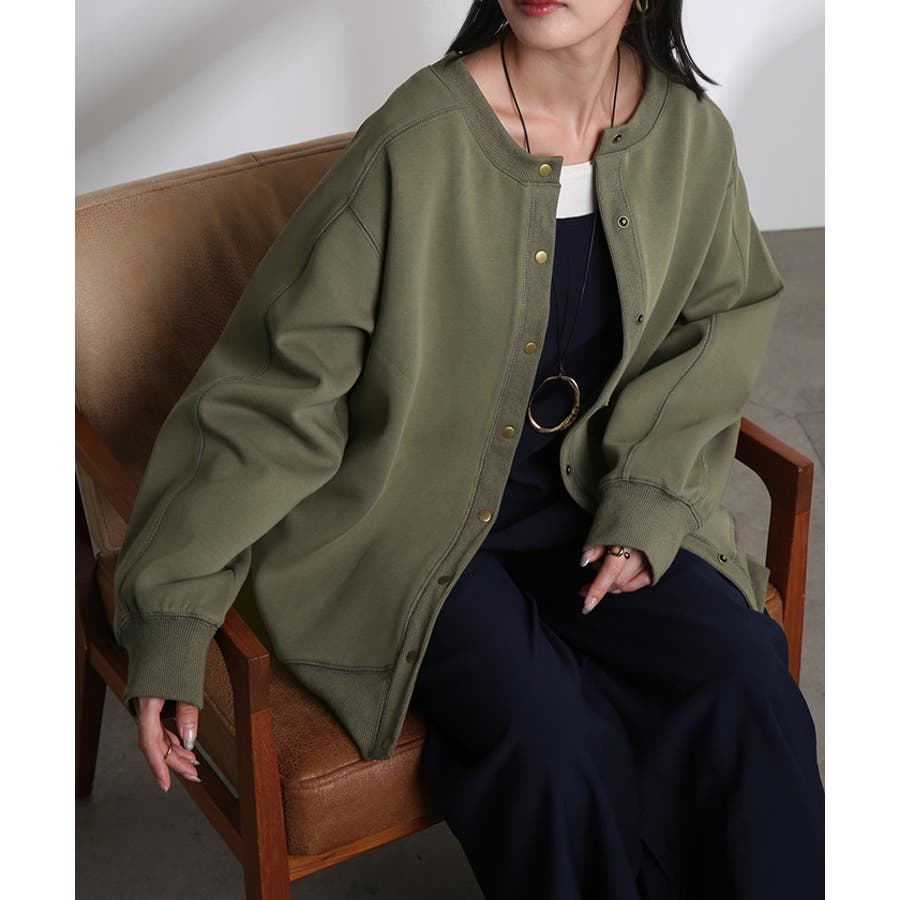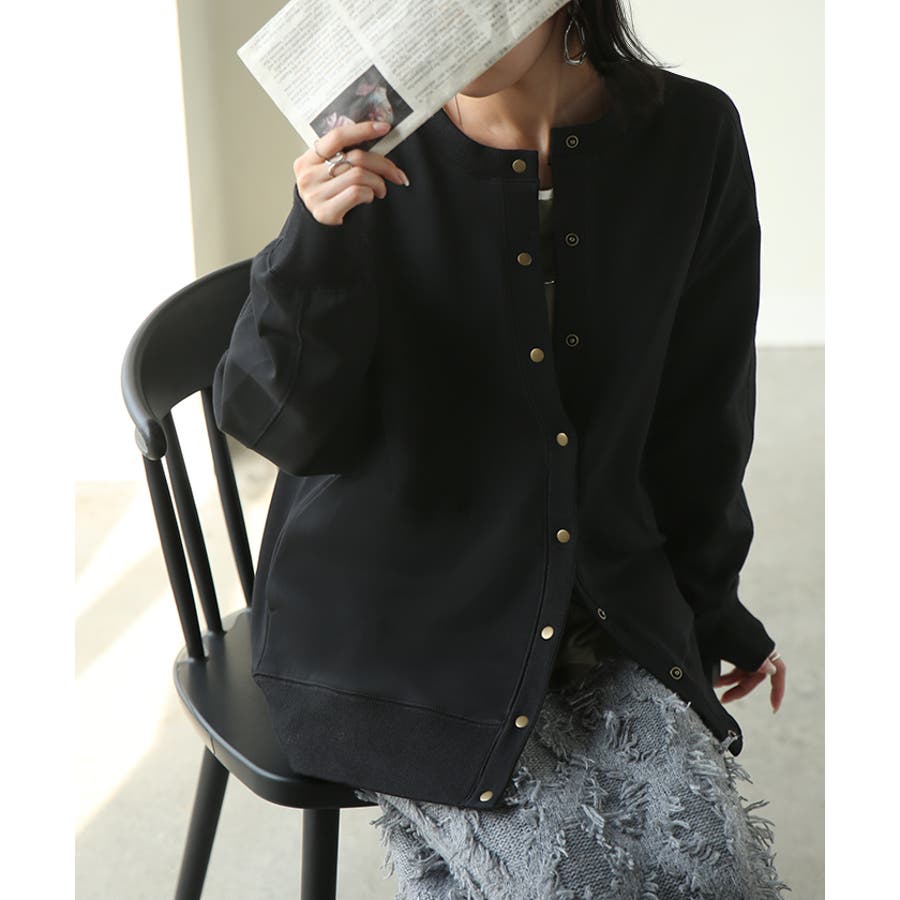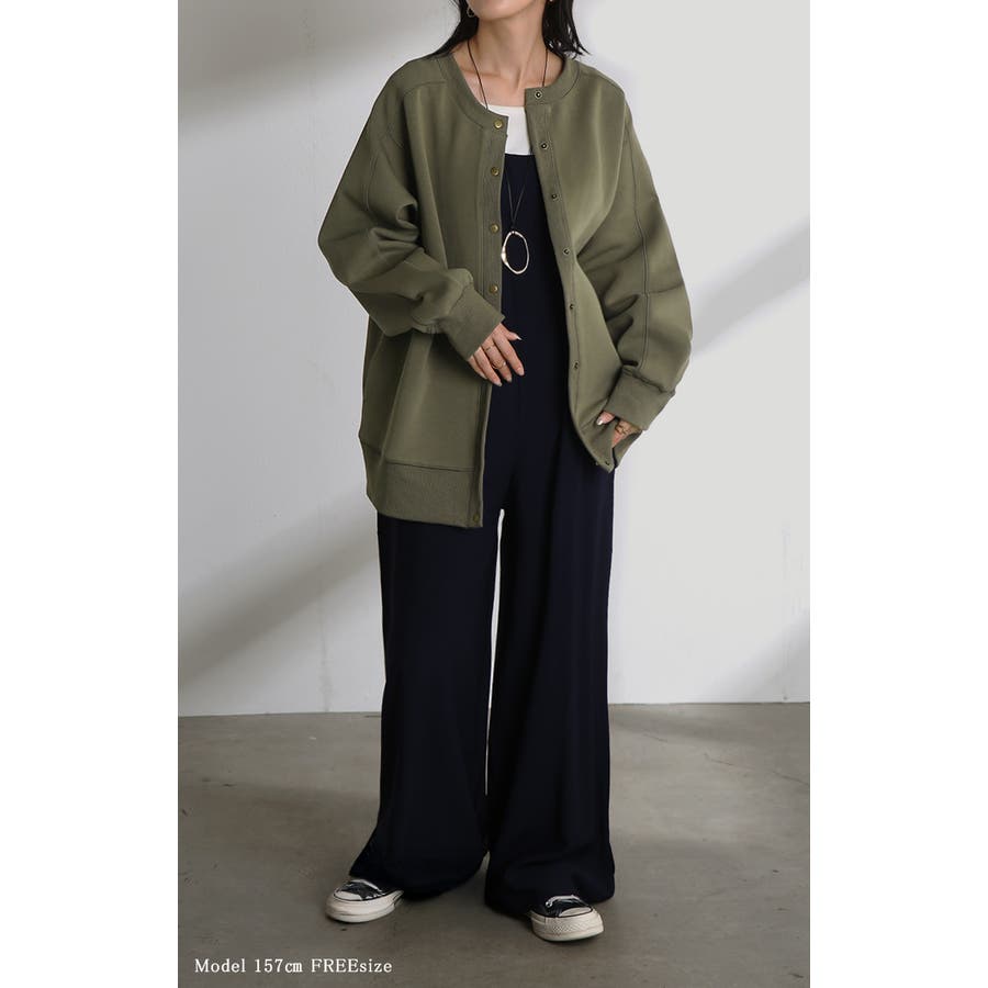 ノーカラーのすっきりとしたネックラインに、大ぶりのリングドットボタンがアクセントに◎。