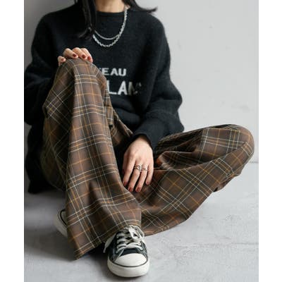 落ち着いたトーンのチェック柄が目を惹くくワイドパンツです。