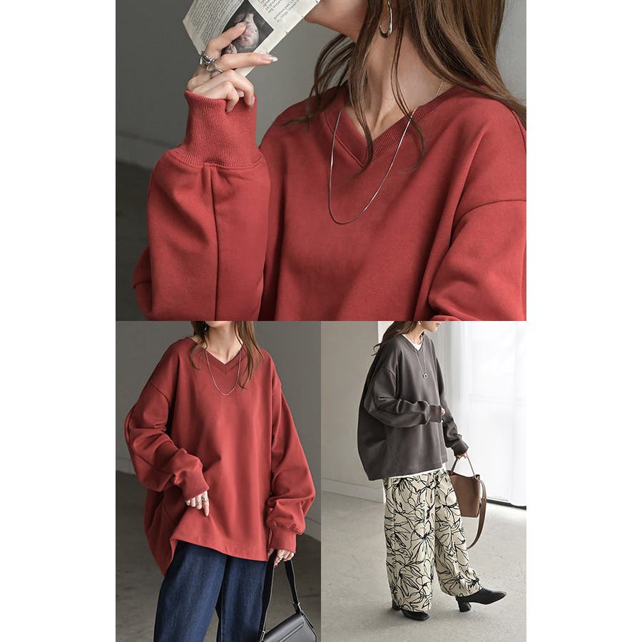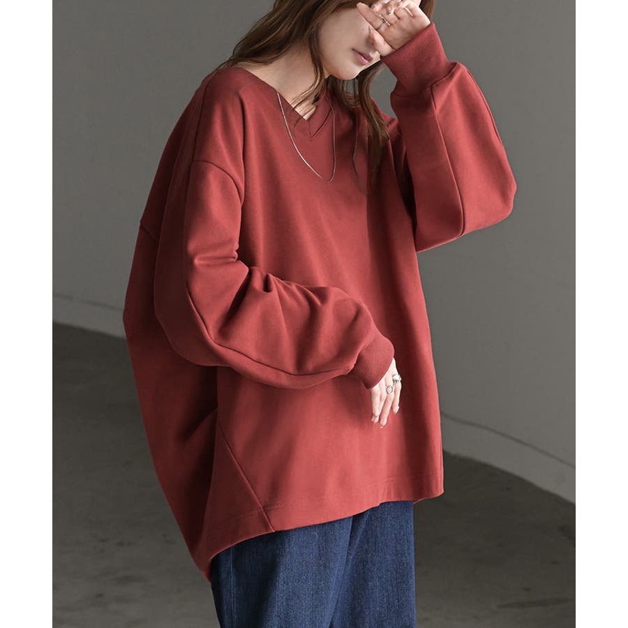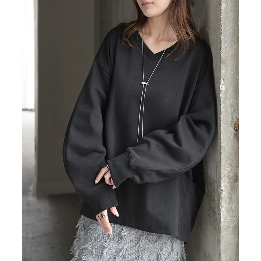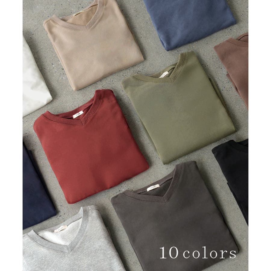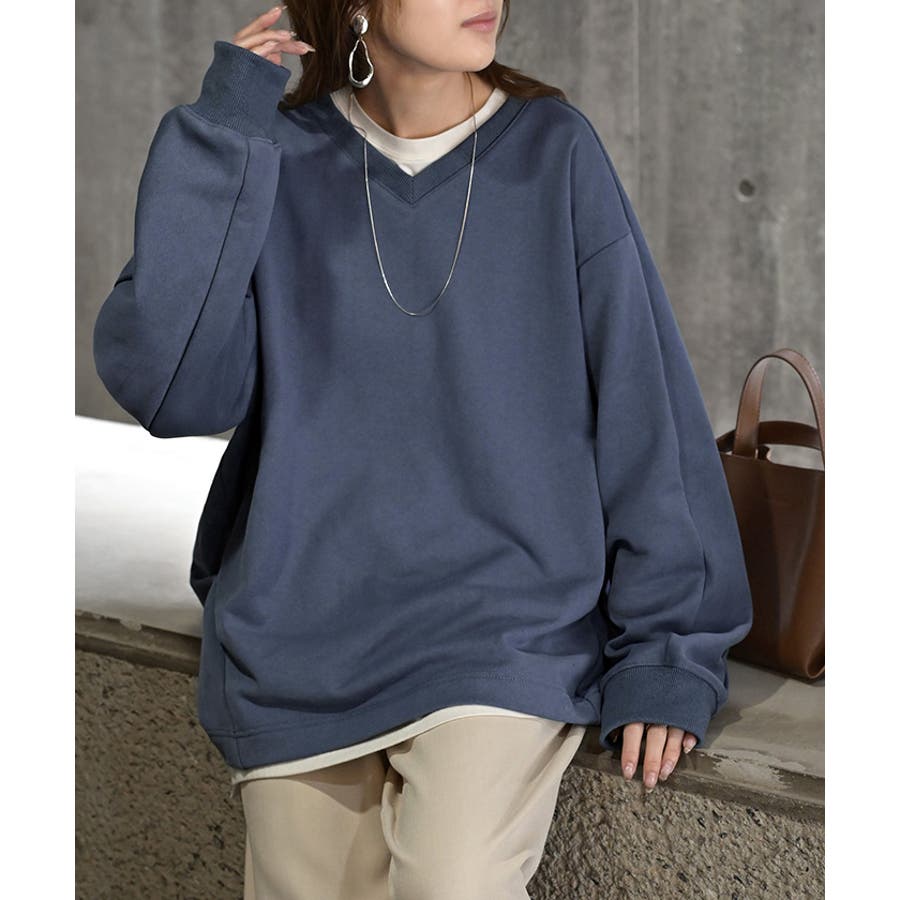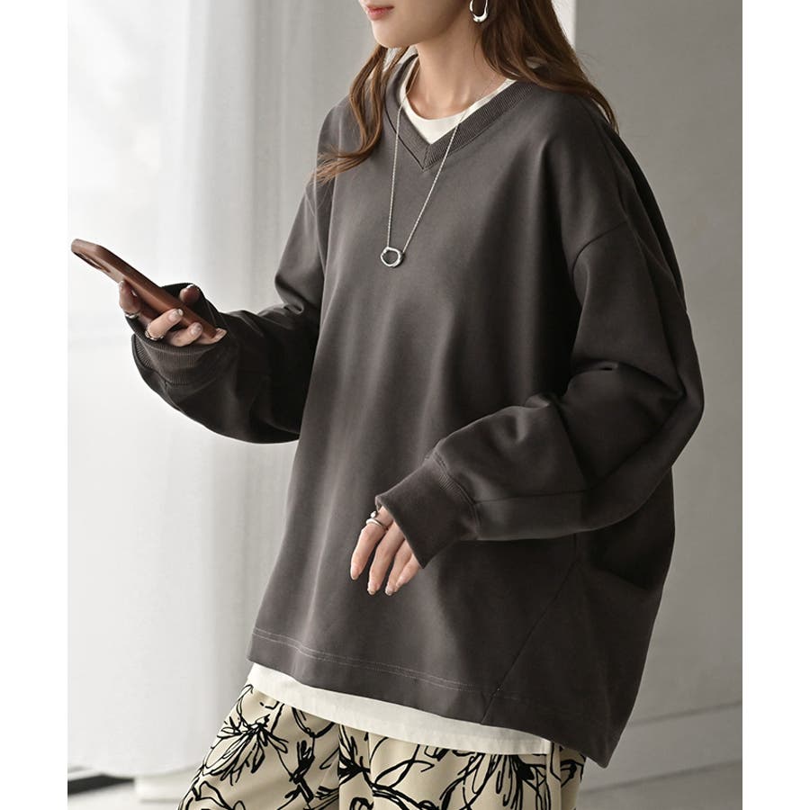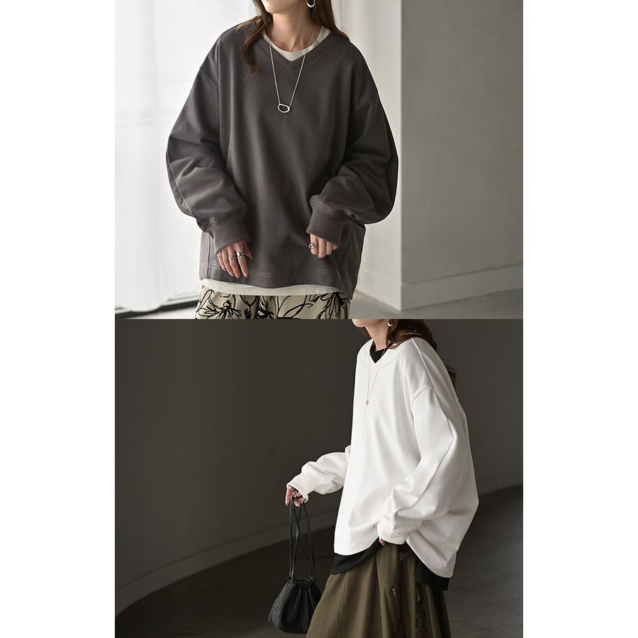 顔まわりをすっきりと見せる裏毛Vネックスウェットです。