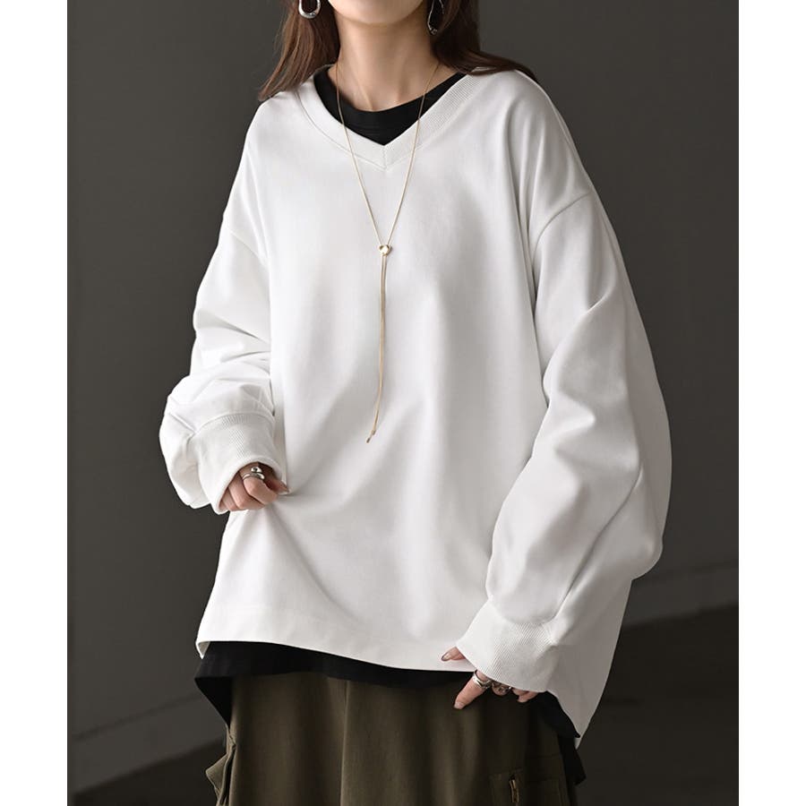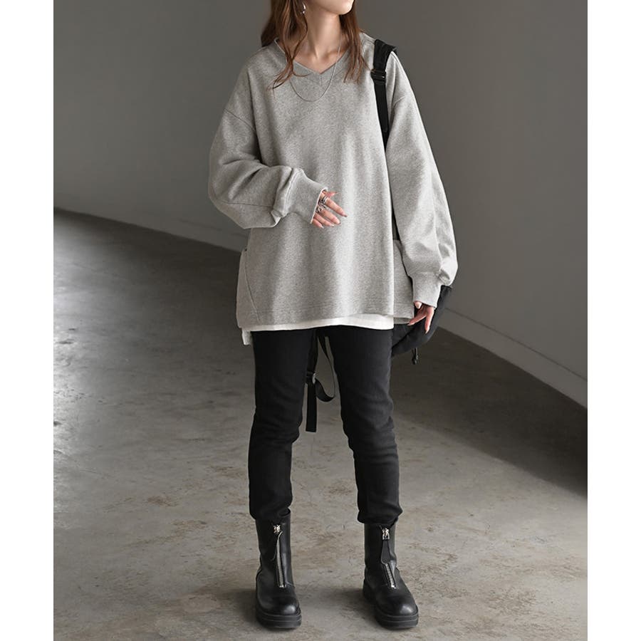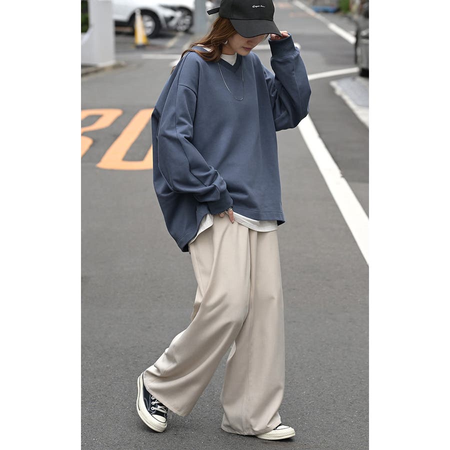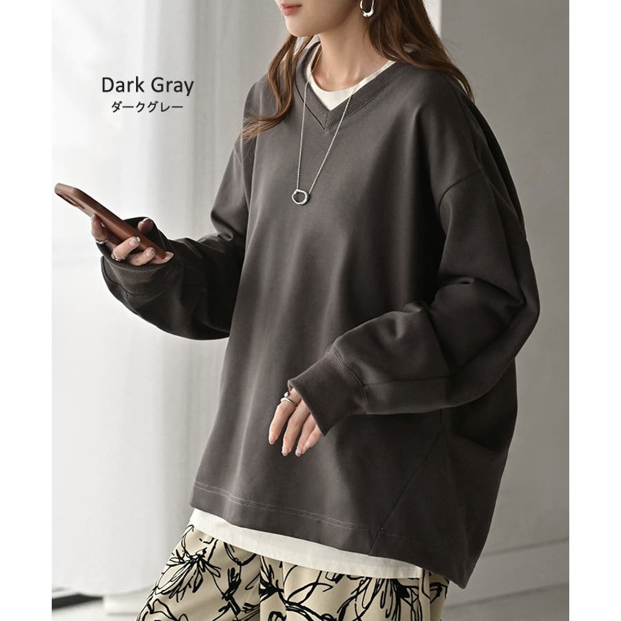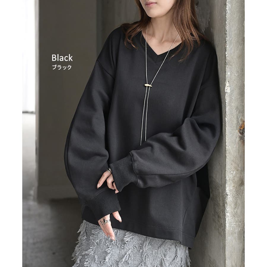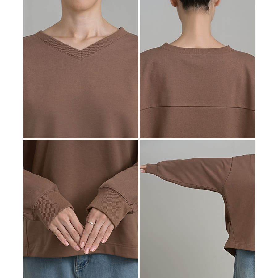 顔まわりをすっきりと見せる裏毛Vネックスウェットです。
