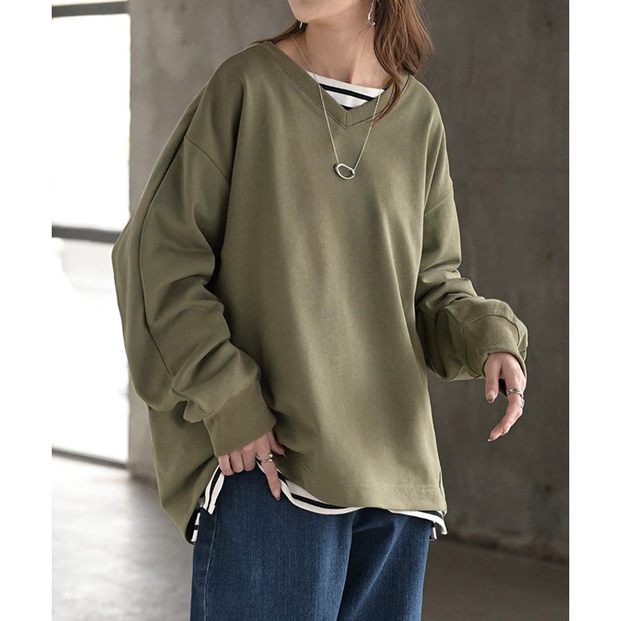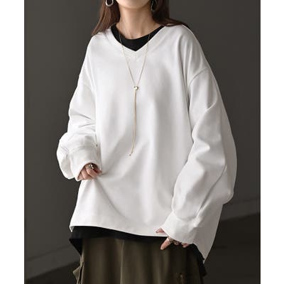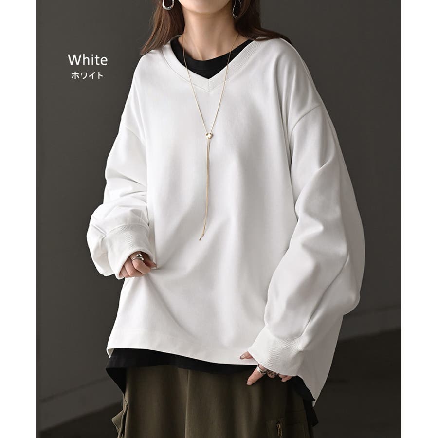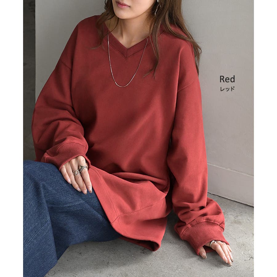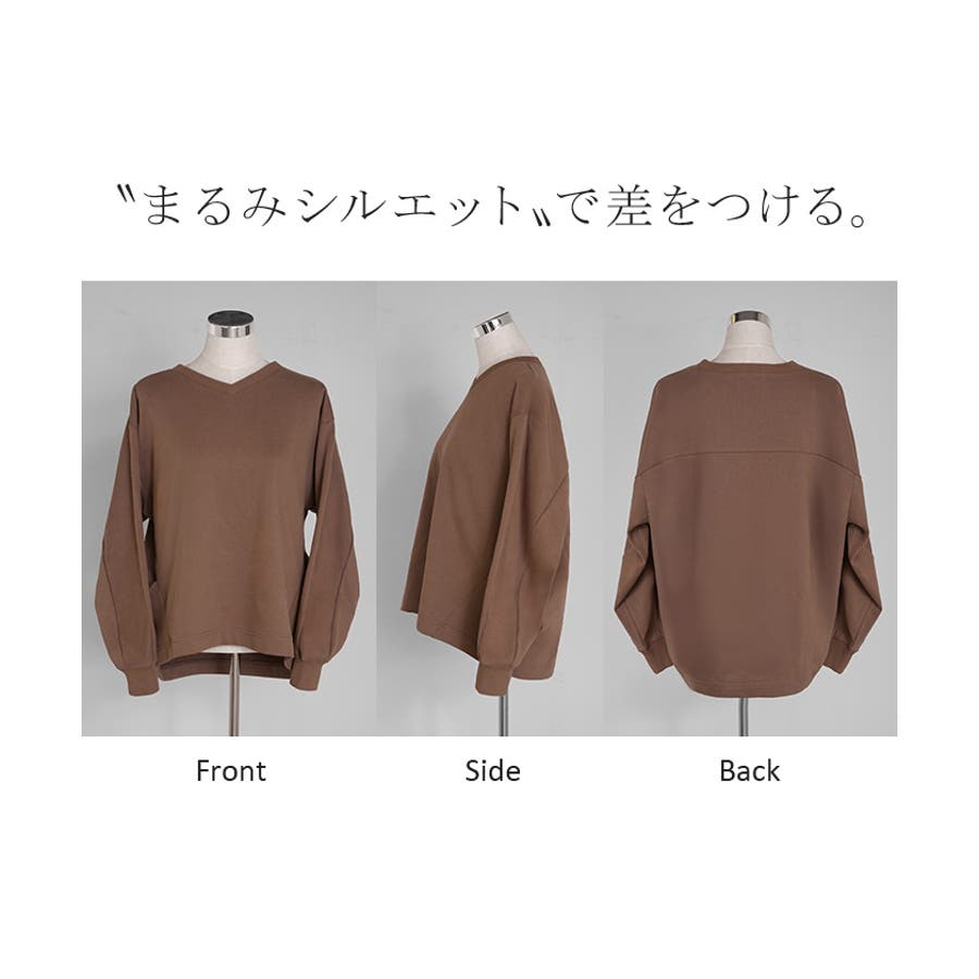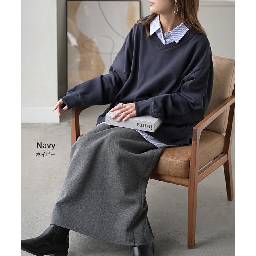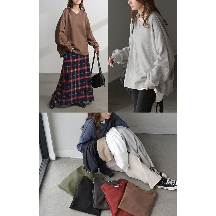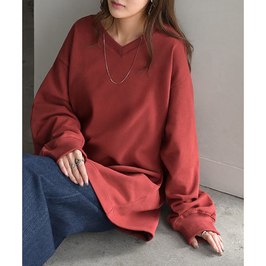 顔まわりをすっきりと見せる裏毛Vネックスウェットです。
