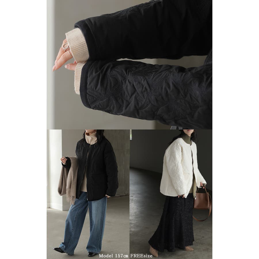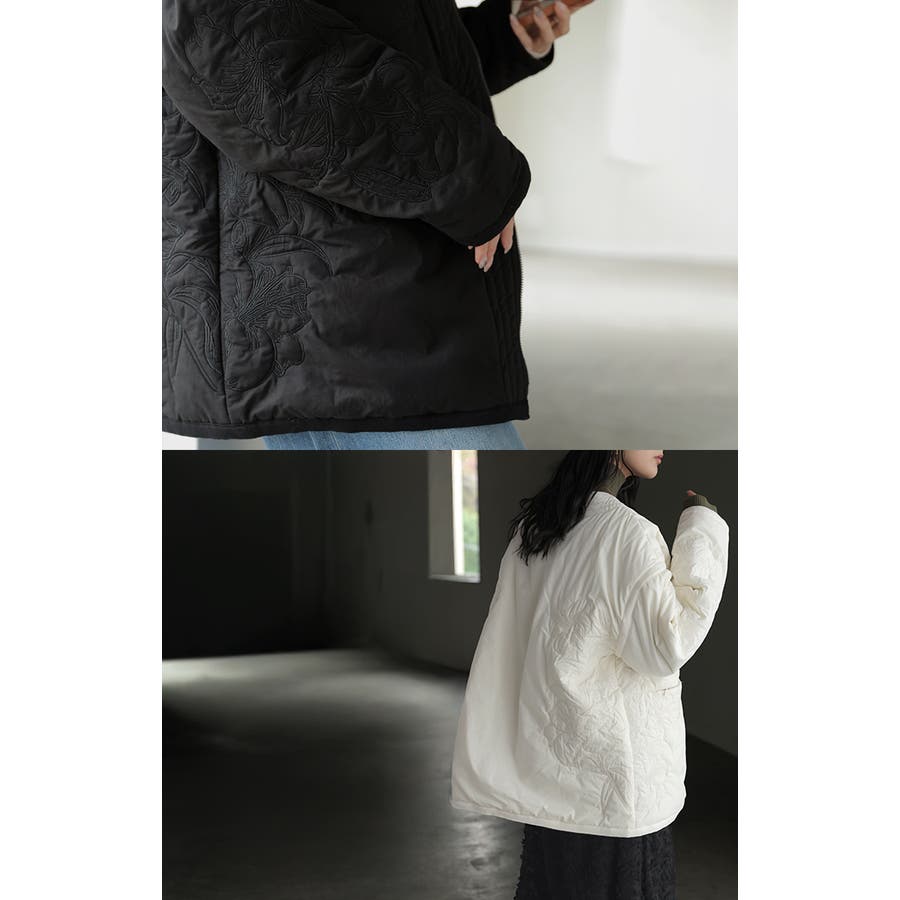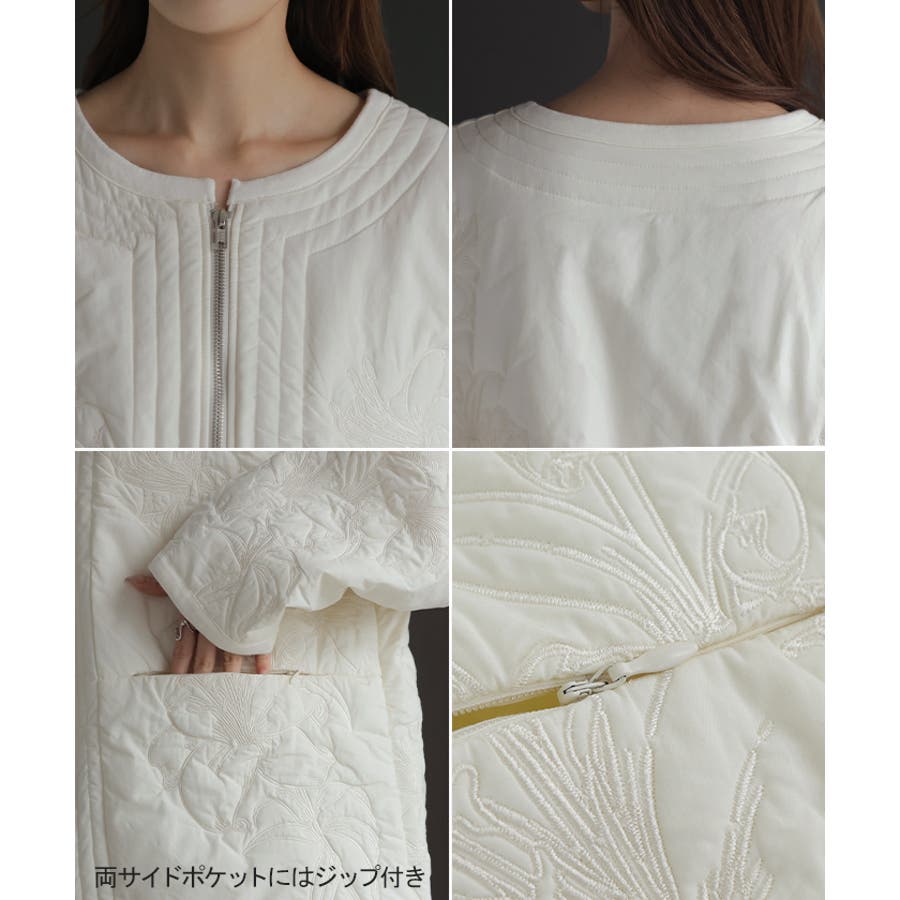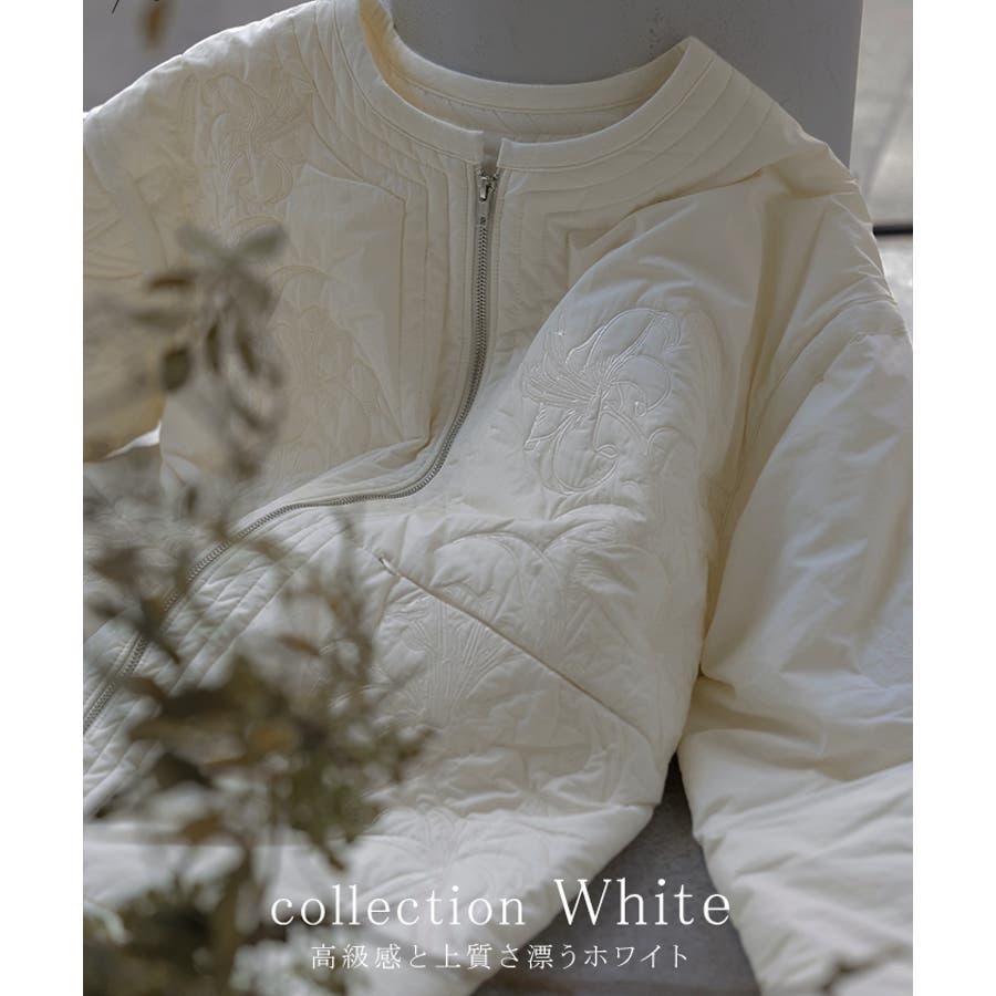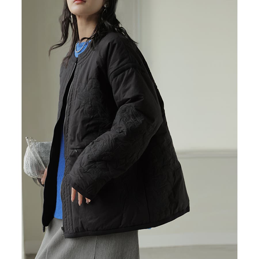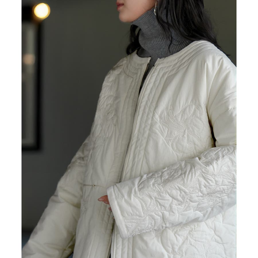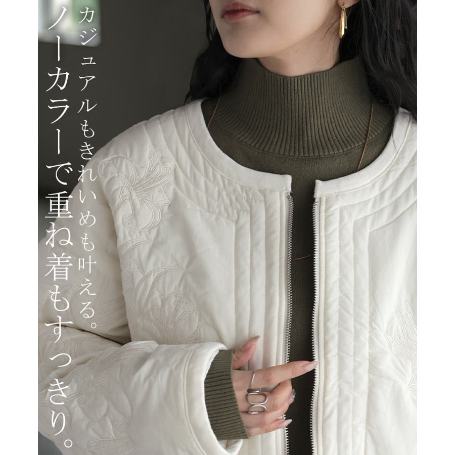 立体感のある同色刺繍が印象的な女性らしいキルティングジャケットです。