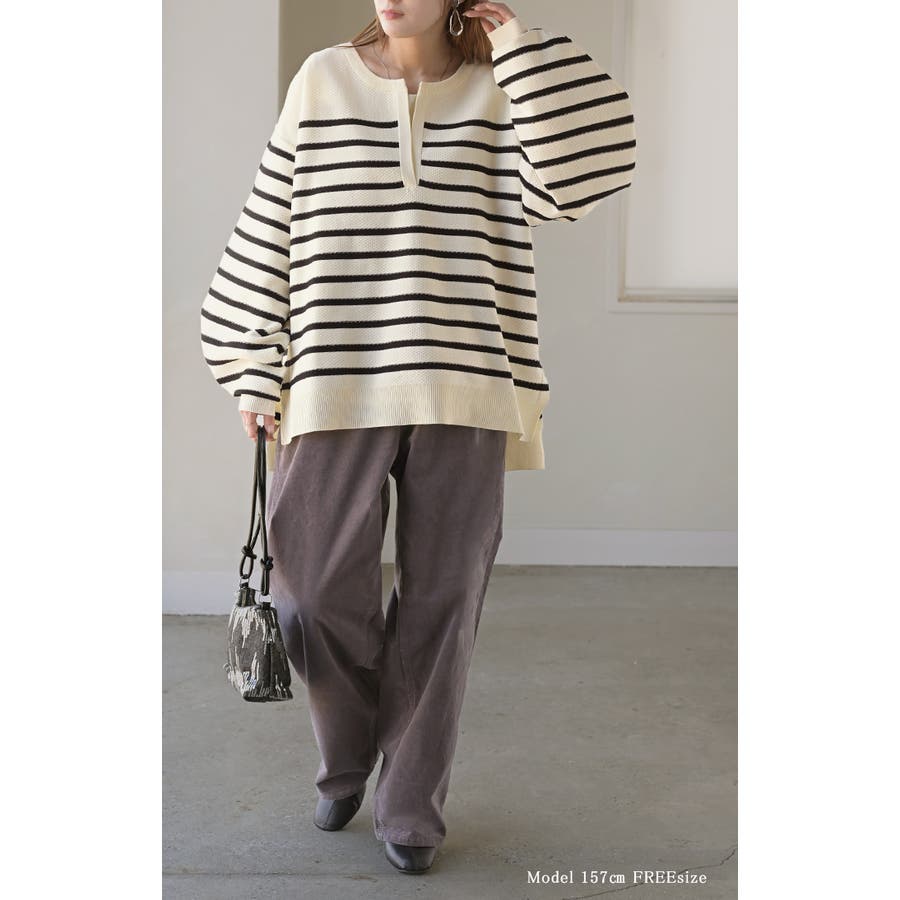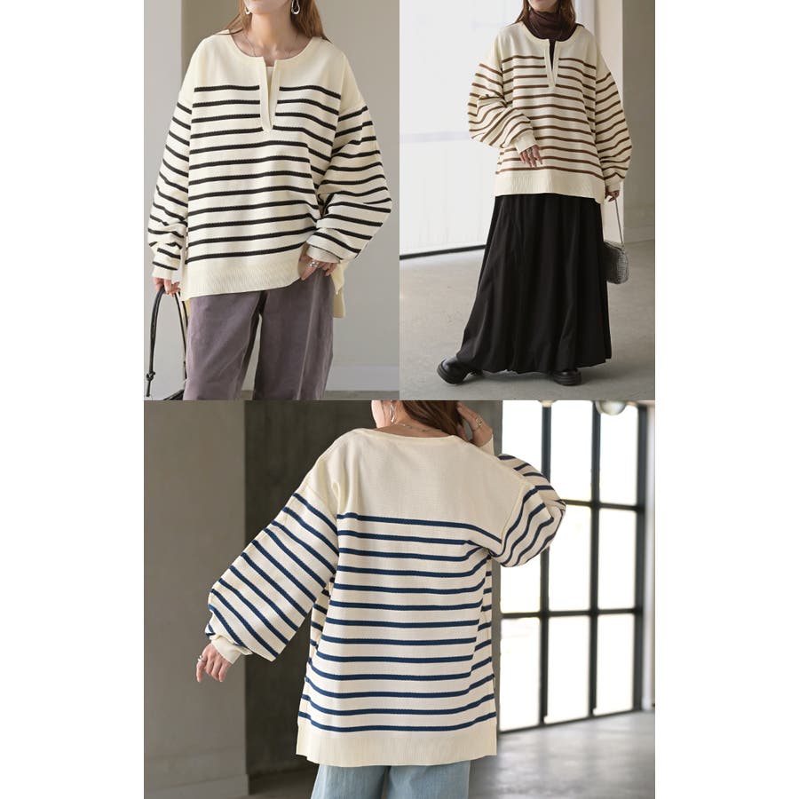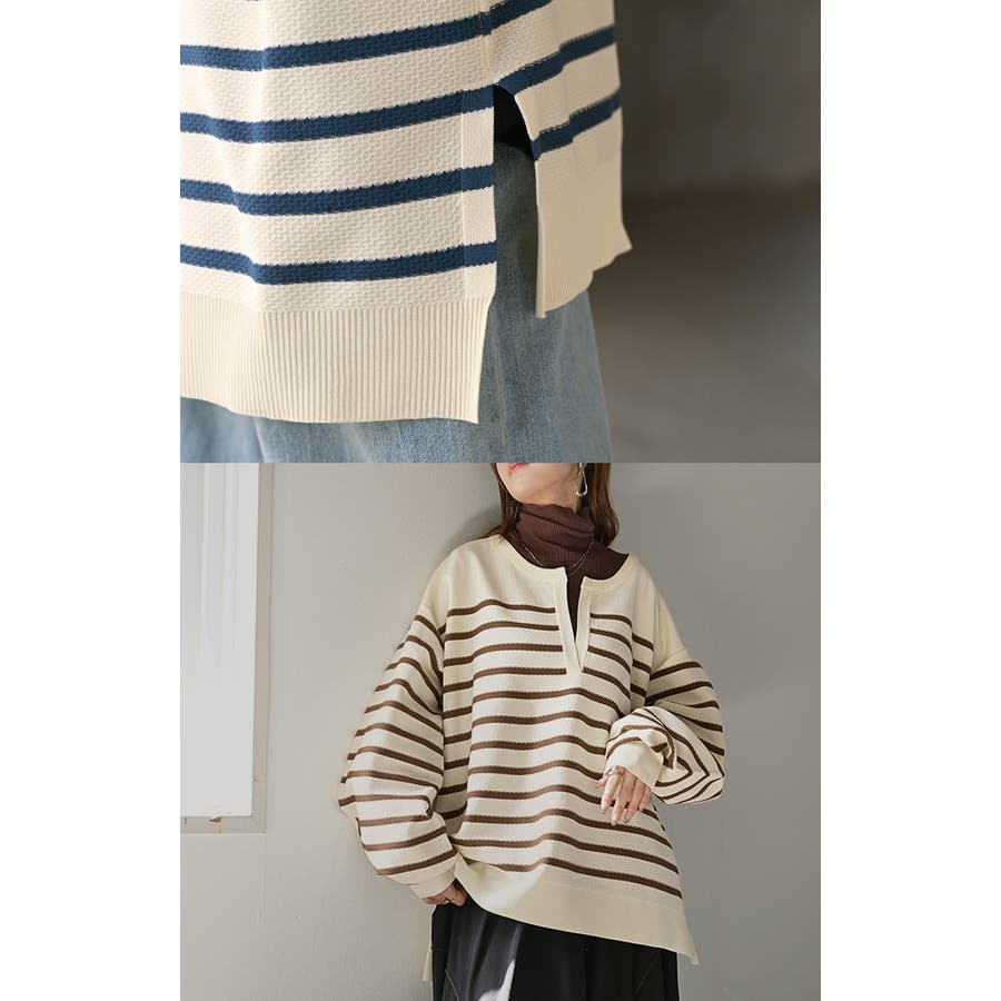 シンプルながらも存在感のあるキーネックのボーダーニットです。