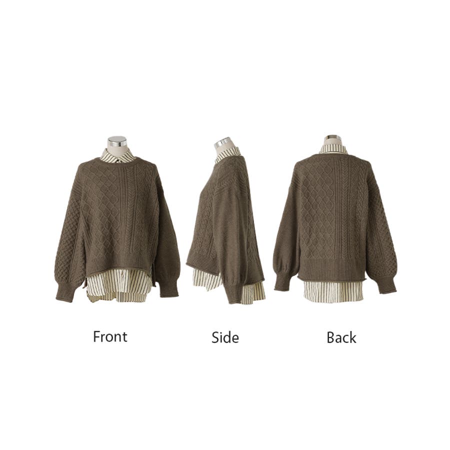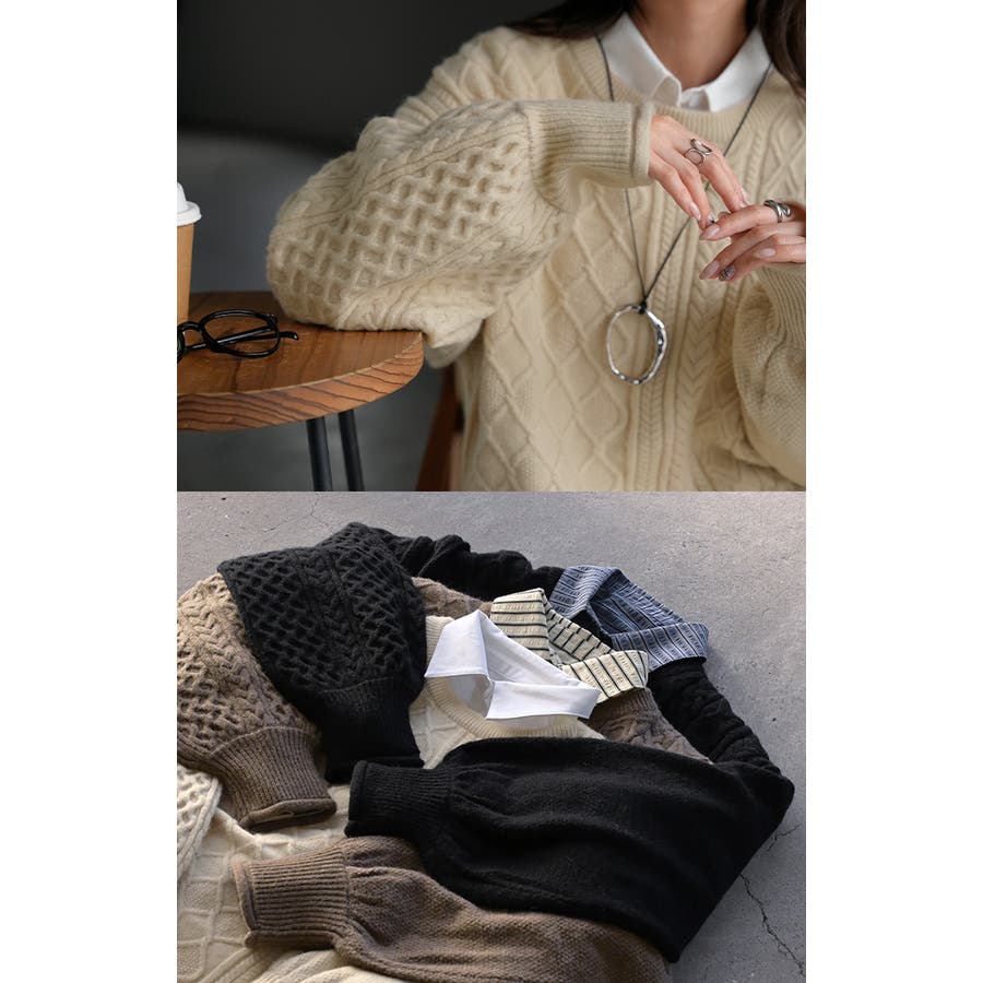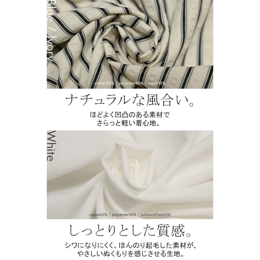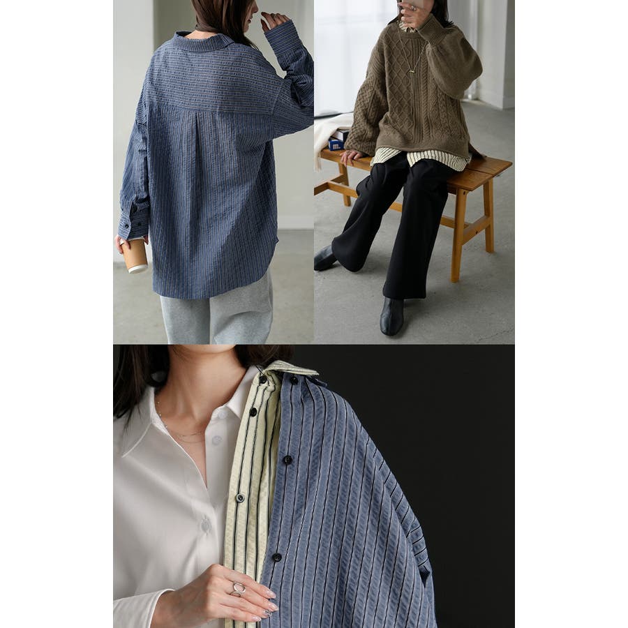 | 素材 | 無地シャツ:レーヨン65% ポリエステル30% ポリウレタン5% ストライプシャツ:綿50% ポリエステル40% レーヨン10% ニット:アクリル42% ポリエステル30% ナイロン28% |