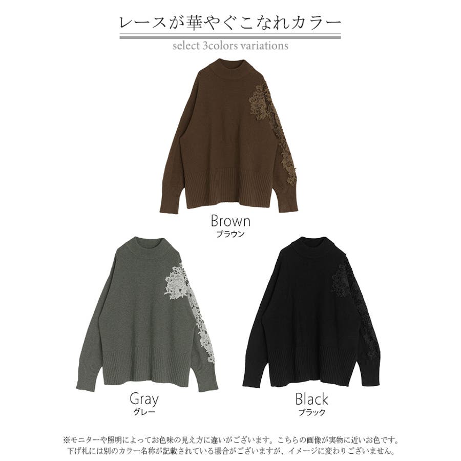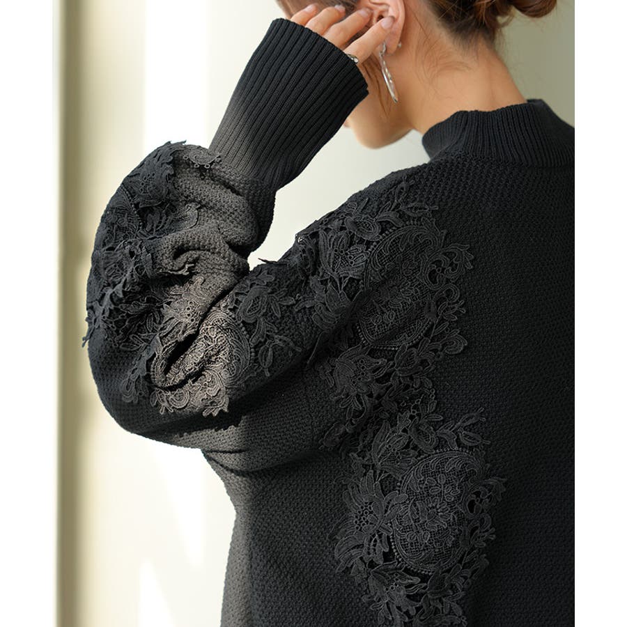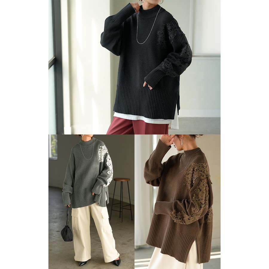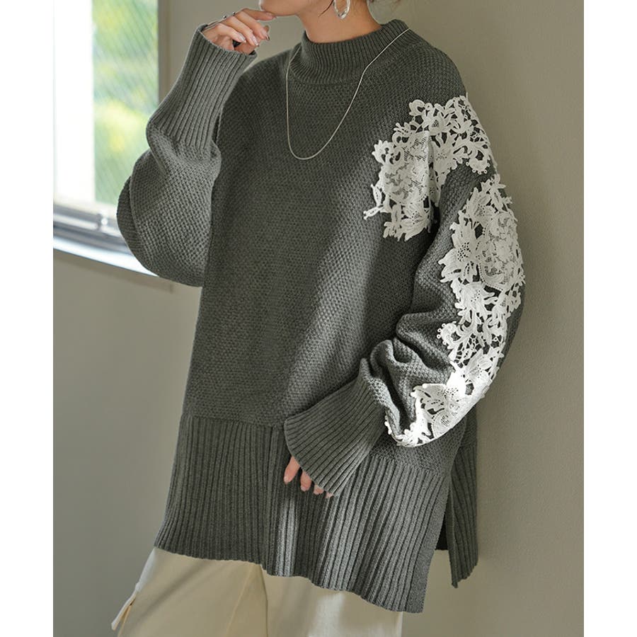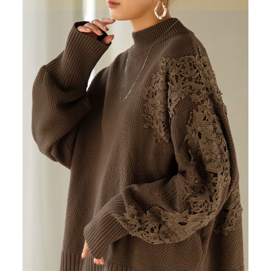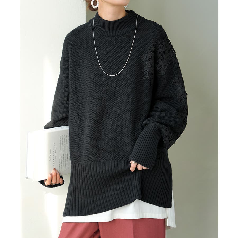 左腕周りのレース仕様が上品なアシンメトリーデザインのモックネックニットです。