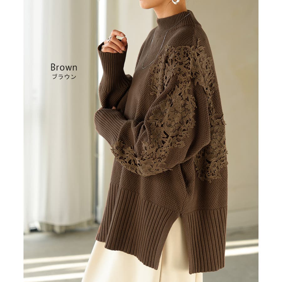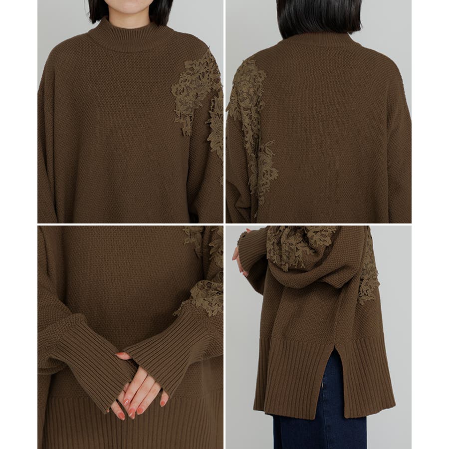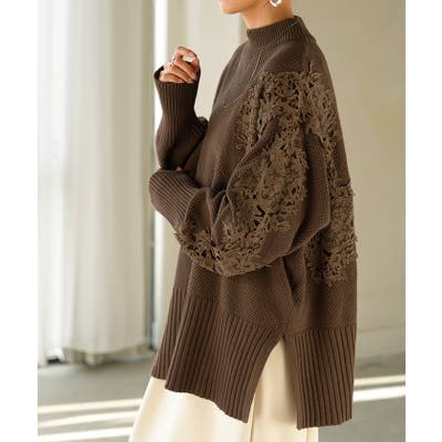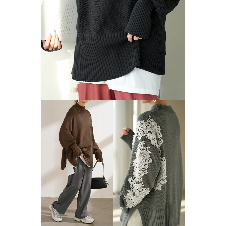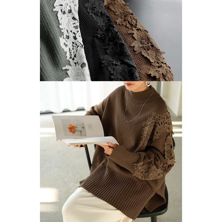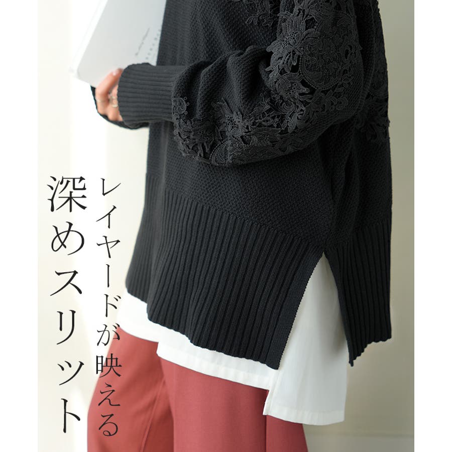 左腕周りのレース仕様が上品なアシンメトリーデザインのモックネックニットです。