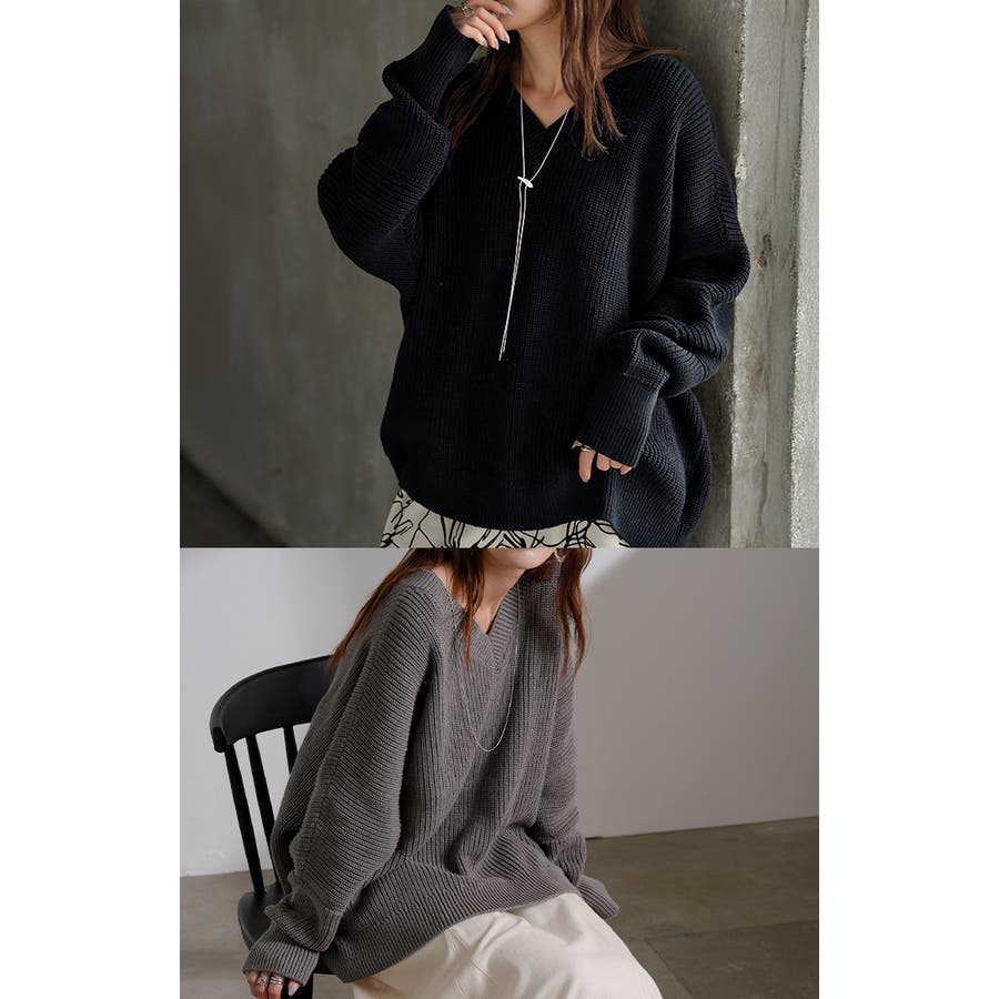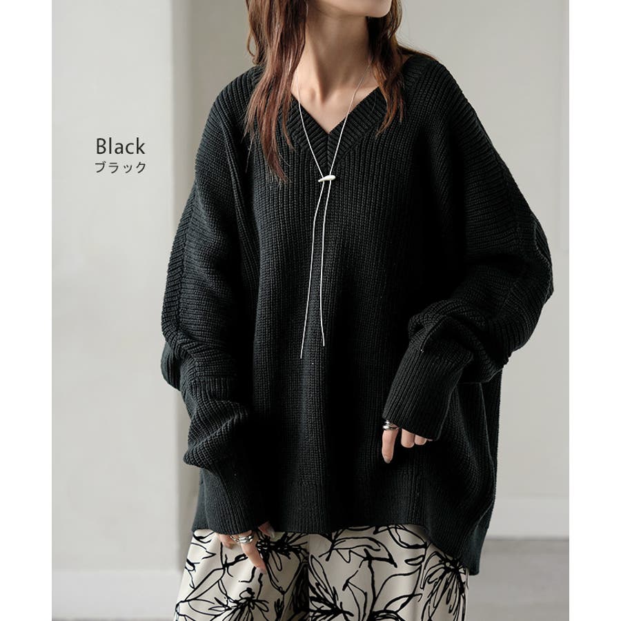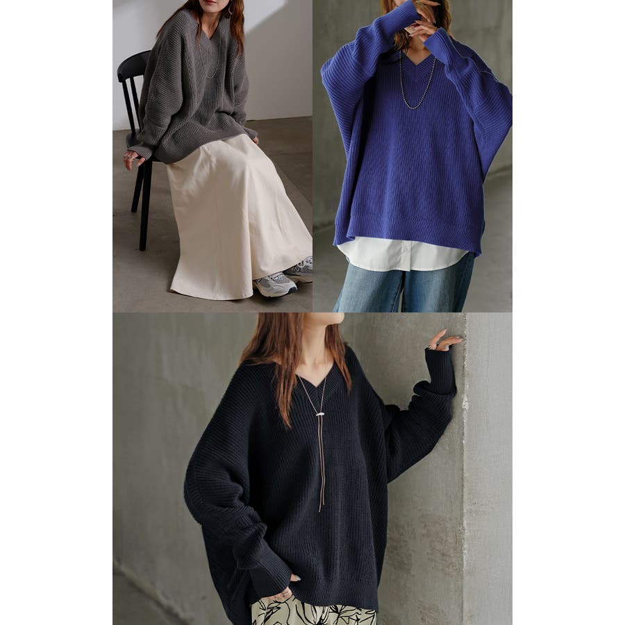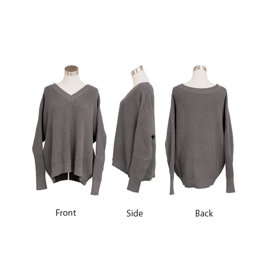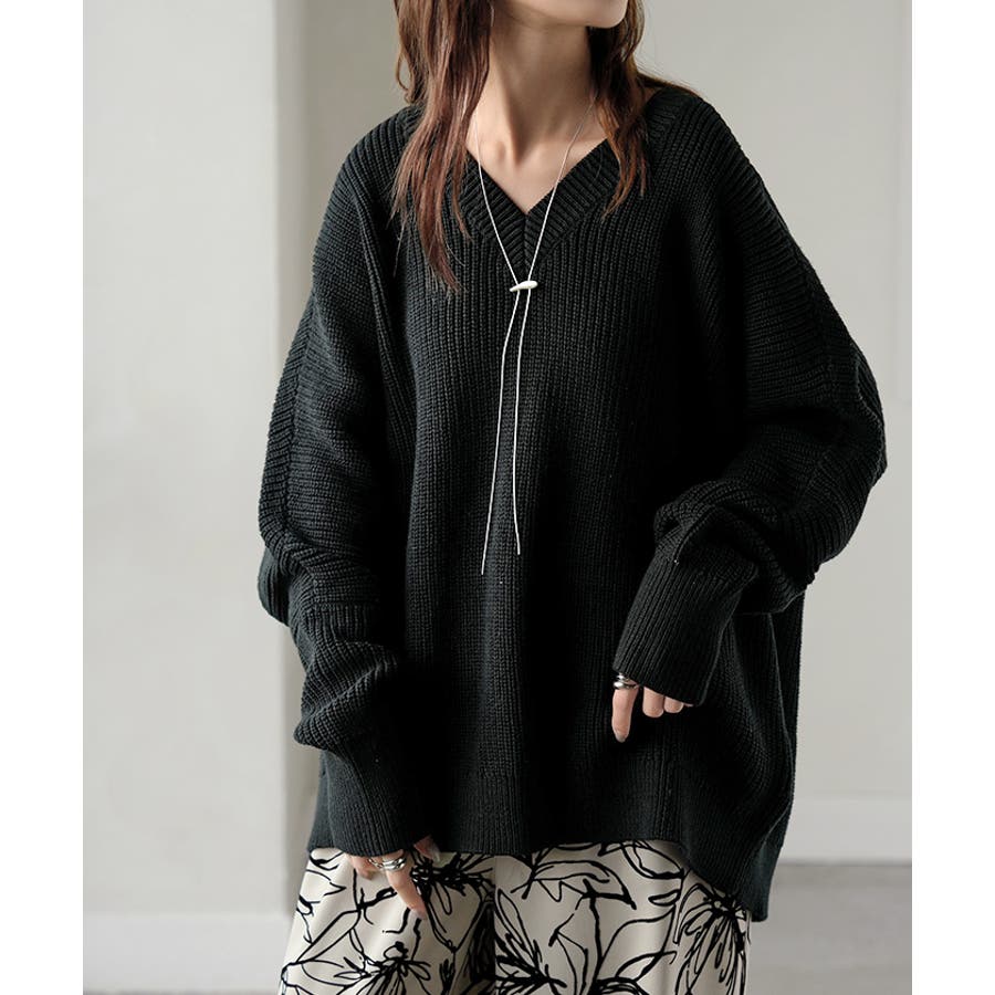 デコルテをキレイに魅せるVネックと、ゆるっとしたシルエットがポイント。