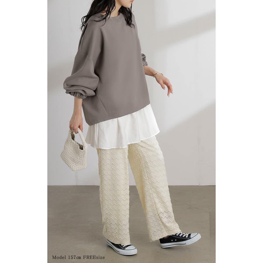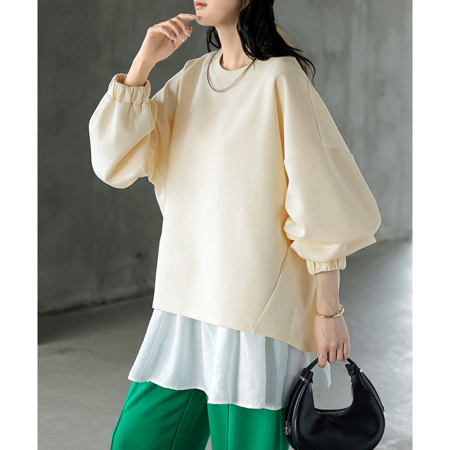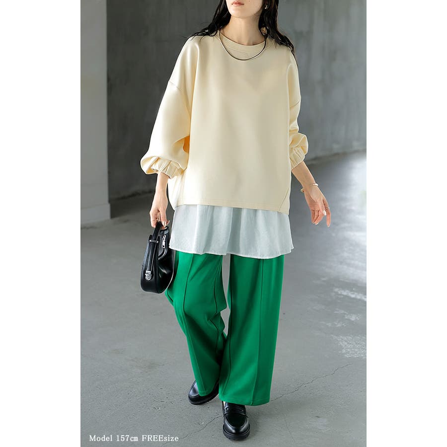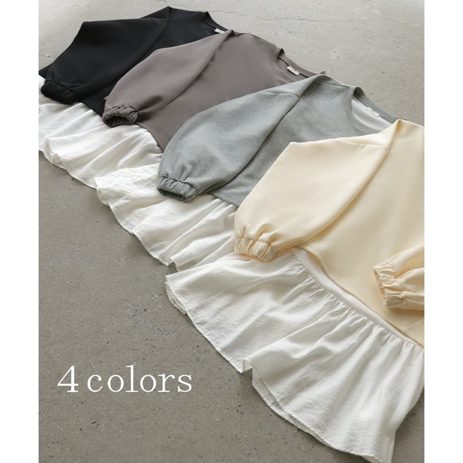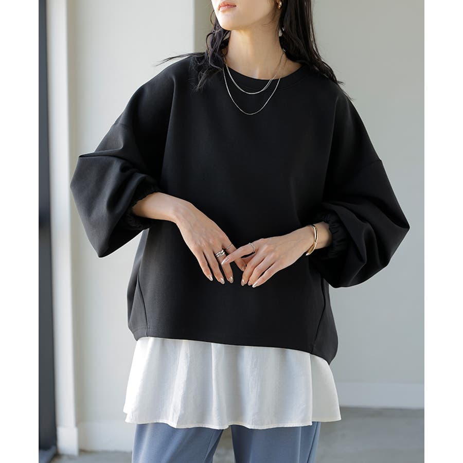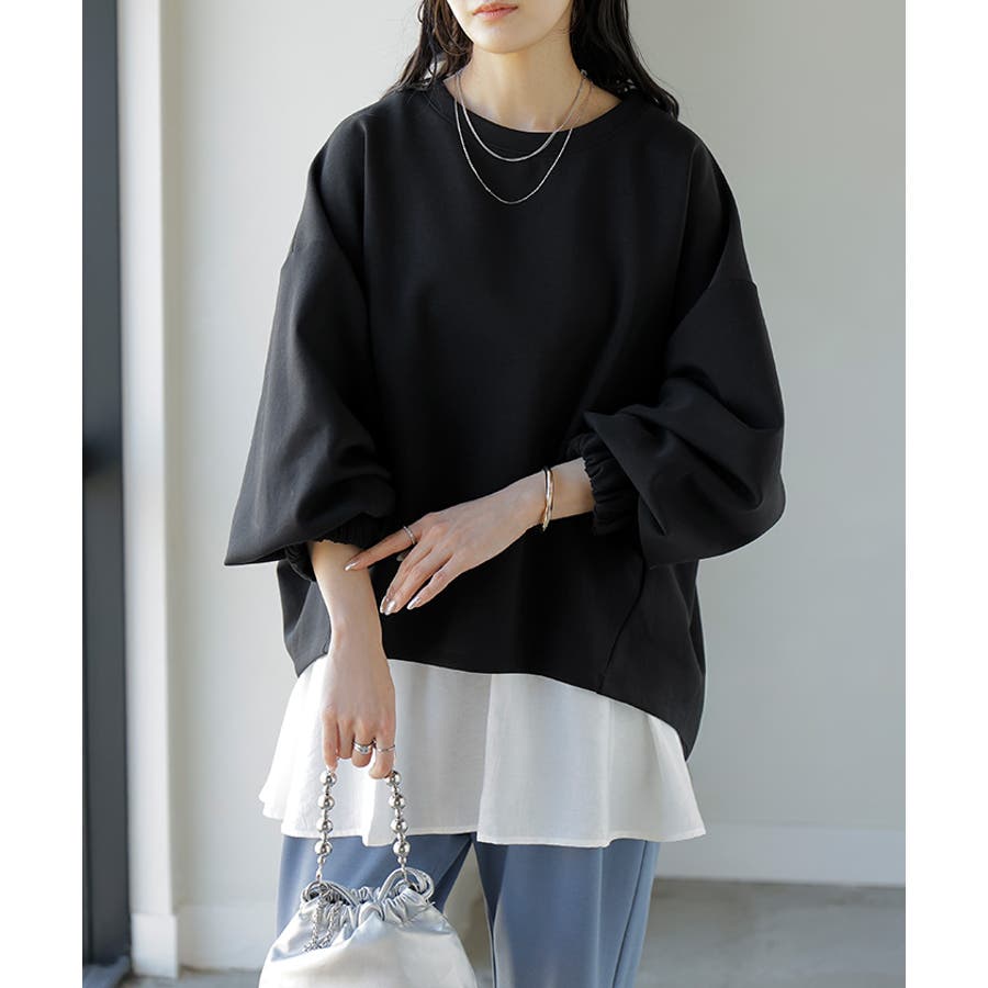 カットソーの裾からシャツ地のペプラムがのぞく華やか&洗練されたデザイン。