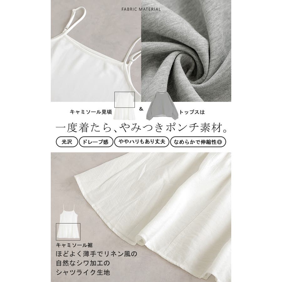 | 素材 | カットソー ポリエステル49% 綿44% ポリウレタン7% キャミソール カットソー部分:ポリエステル50% レーヨン45% ポリウレタン5% 布帛部分:レーヨン78% ナイロン22% |