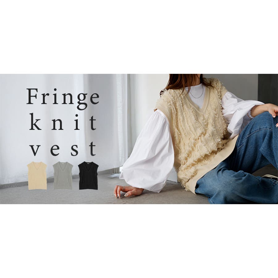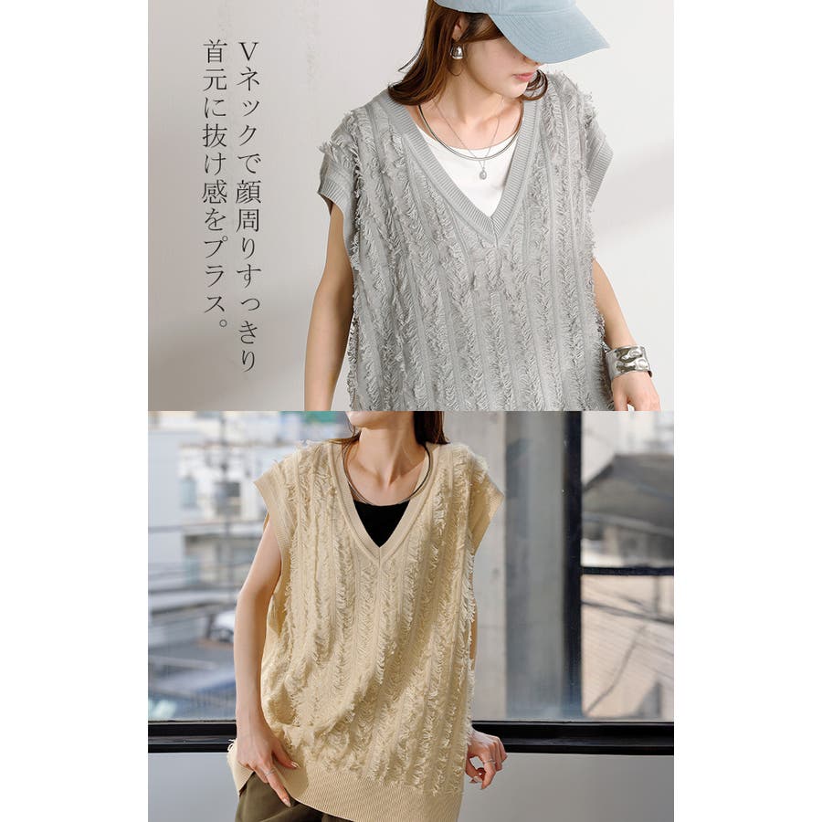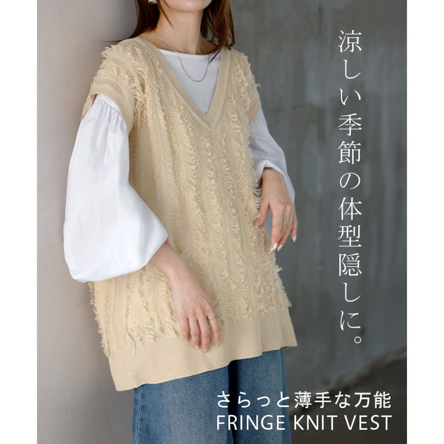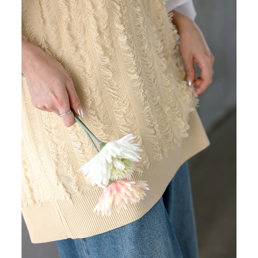 フリンジデザインが目を惹くVネック二ットベストです。