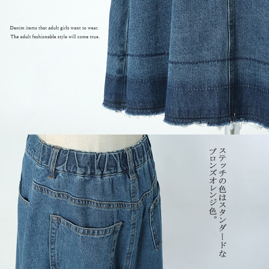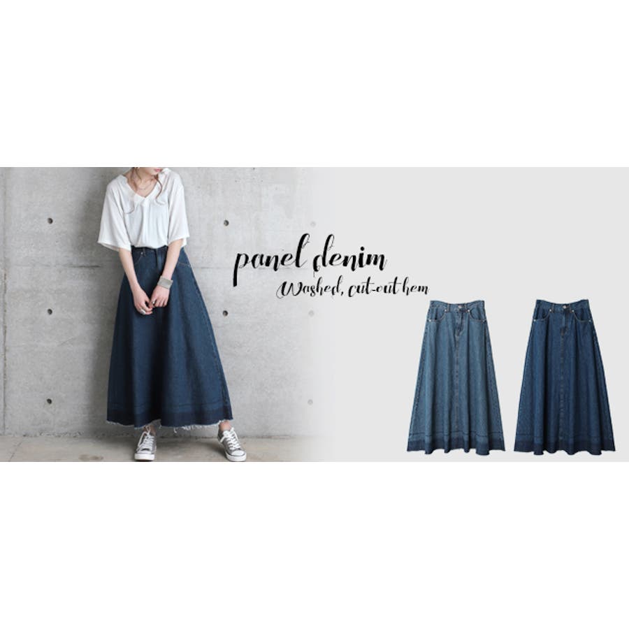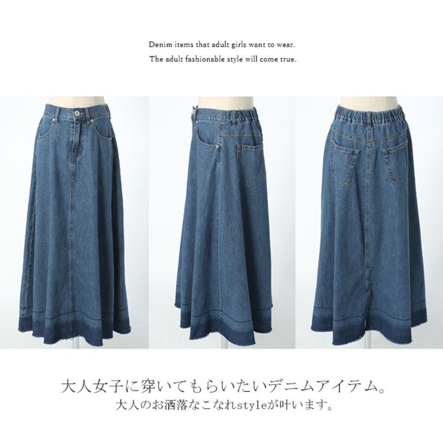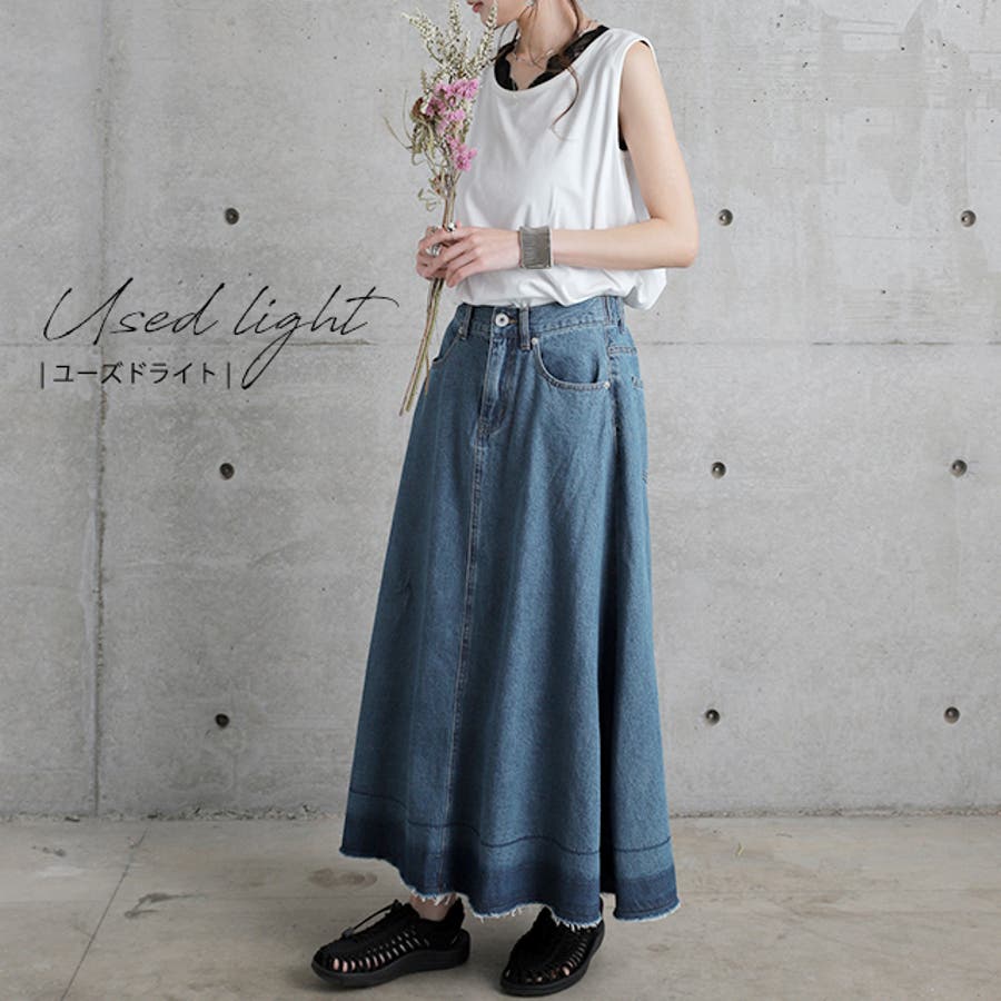 ボトムス ロング丈 マキシ丈 ウエストゴム ウェストゴム ゴムウェスト ゴムウエスト ユーズドデニム ウォッシュデニム インディゴ 青青色 楽ちん 楽 動きやすい 歩きやすい Aライン シンプル ロンスカ グラデーション 20代 30代 40代 50代 おしゃれお洒落 オシャレ かわいい 可愛い カワイイ M L HUG.U HUGU ハグユー はぐゆー