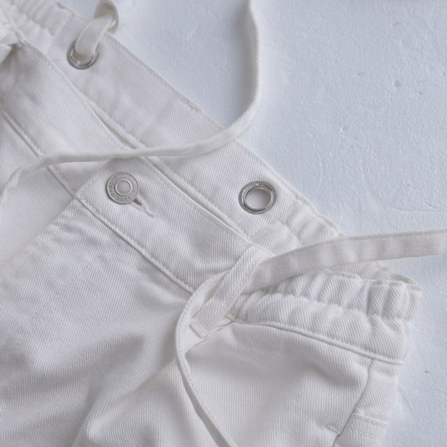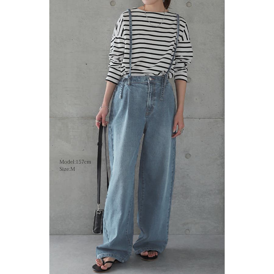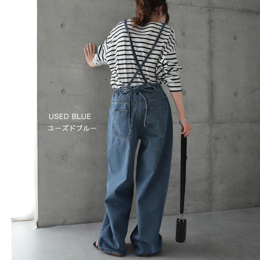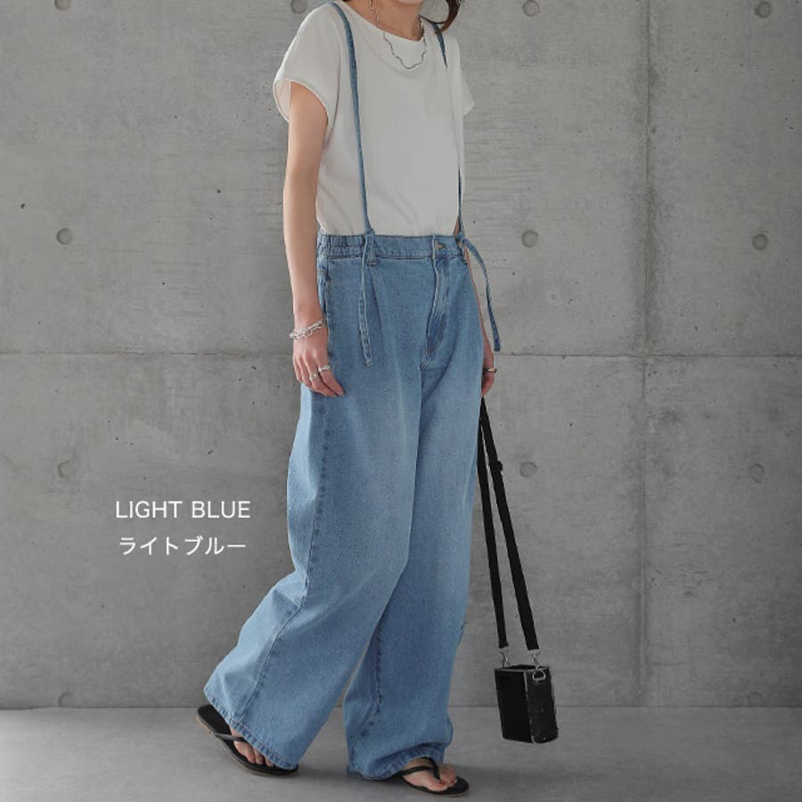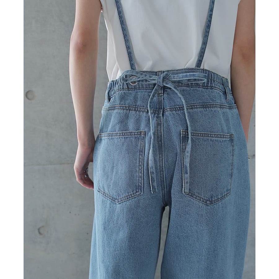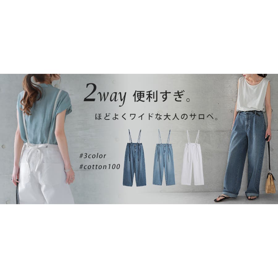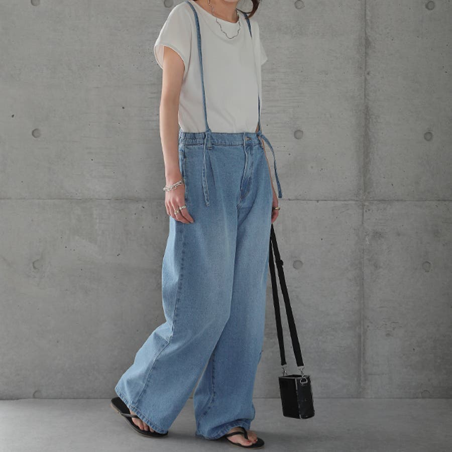 取り外し可能な結びのサスペンダー紐がつき2WAYで楽しめるデニムワイドパンツ。