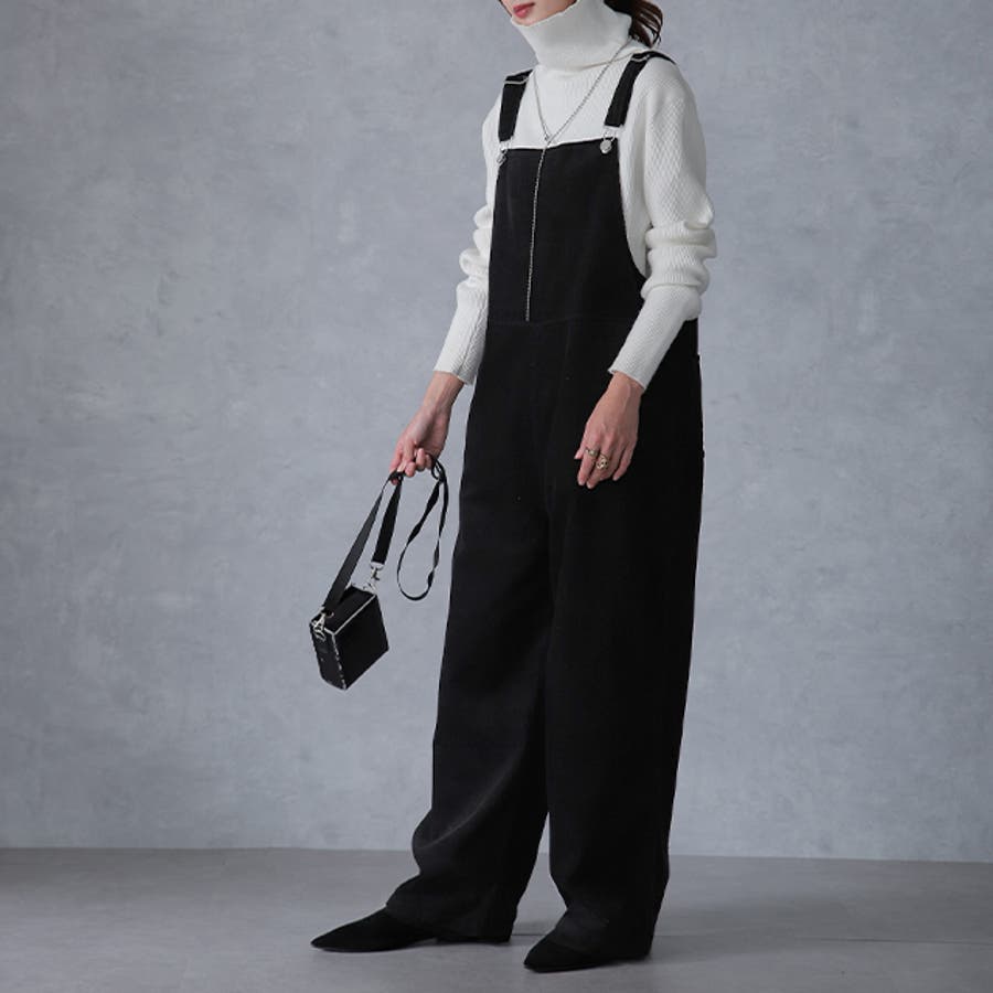 サスペンダーは調整可能なので少し厚めなニットも着膨れせず合わせられます。