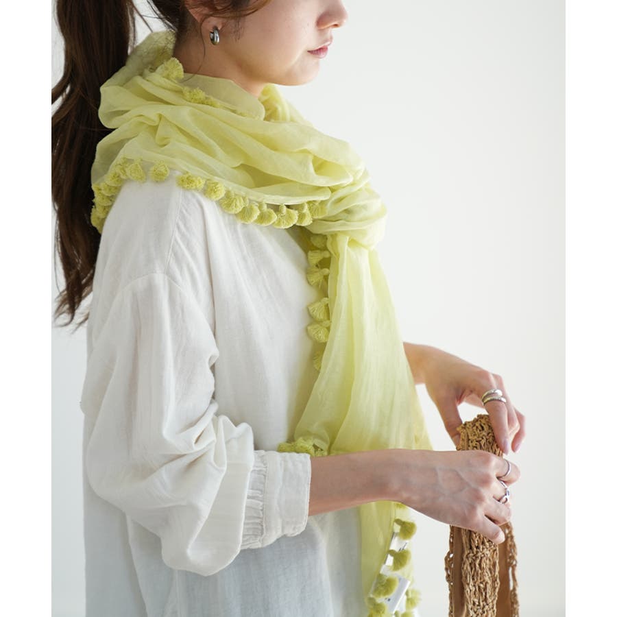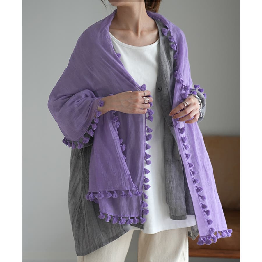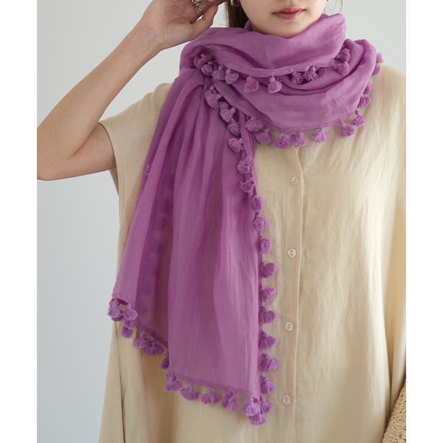 シルクブレンドのインド綿が夏の肌に心地よいポンポンフリンジ付の大判ストール。