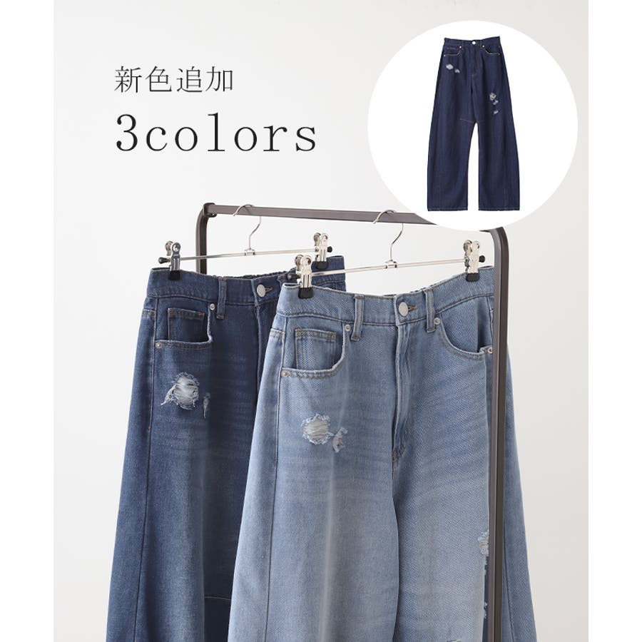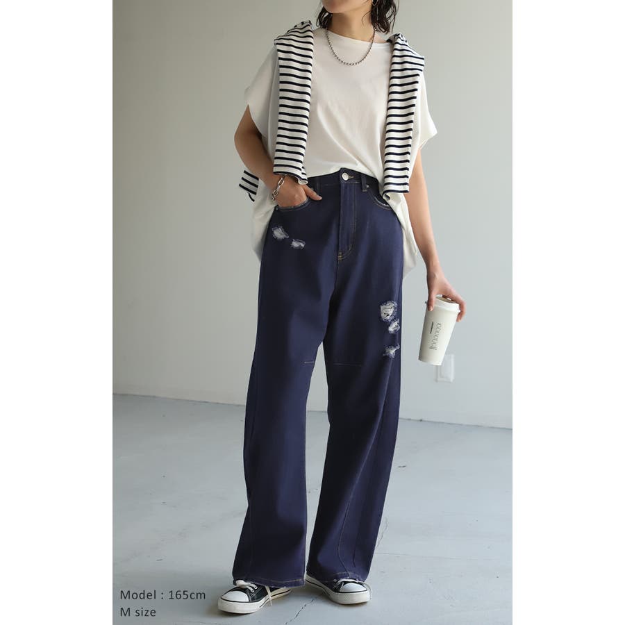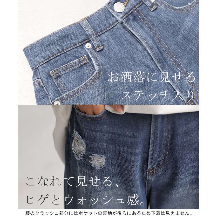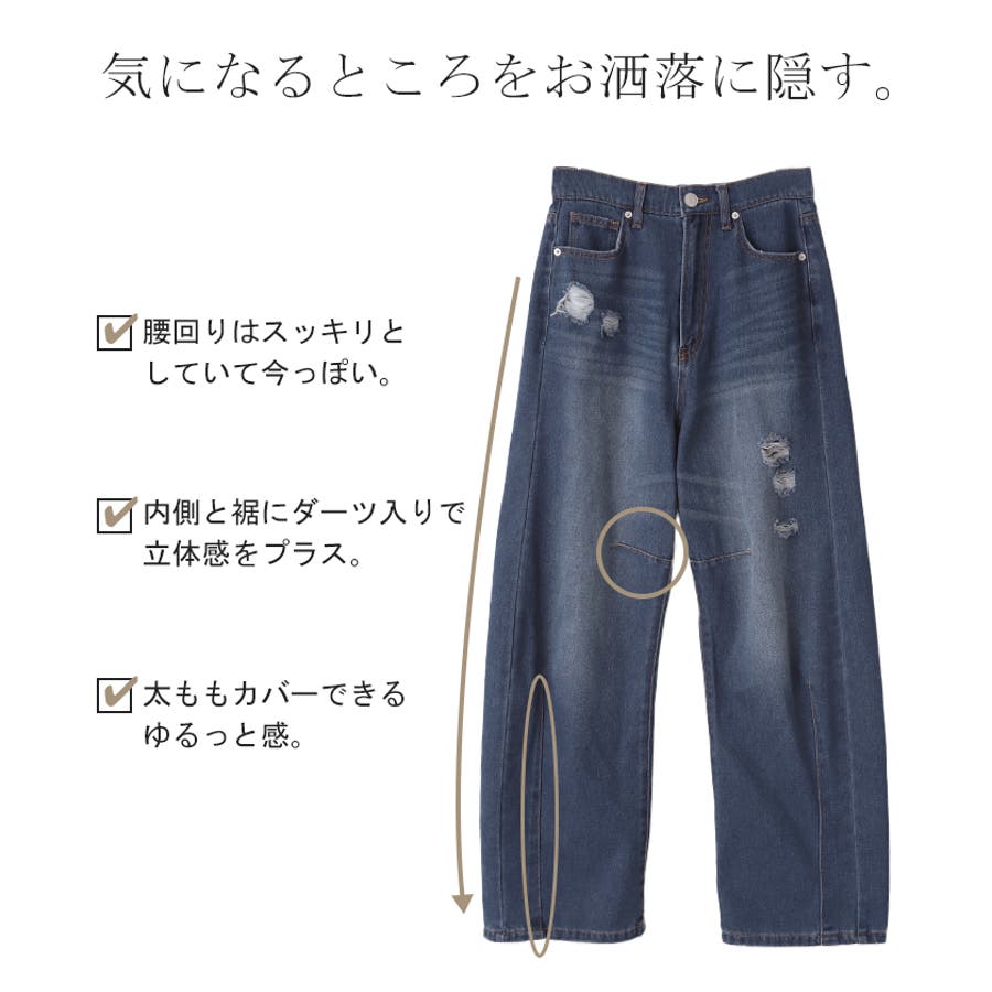 ダメージ加工が特徴で記ですがヒップラインや脚のラインなど気になる部分をさりげなくカバー。