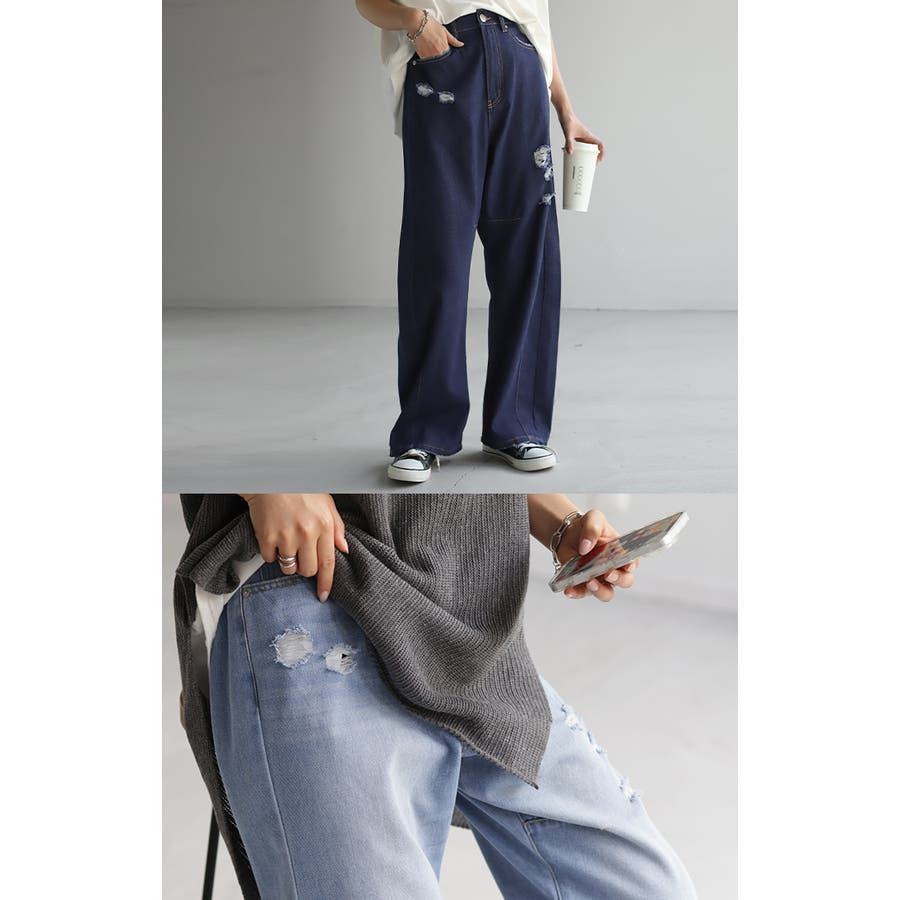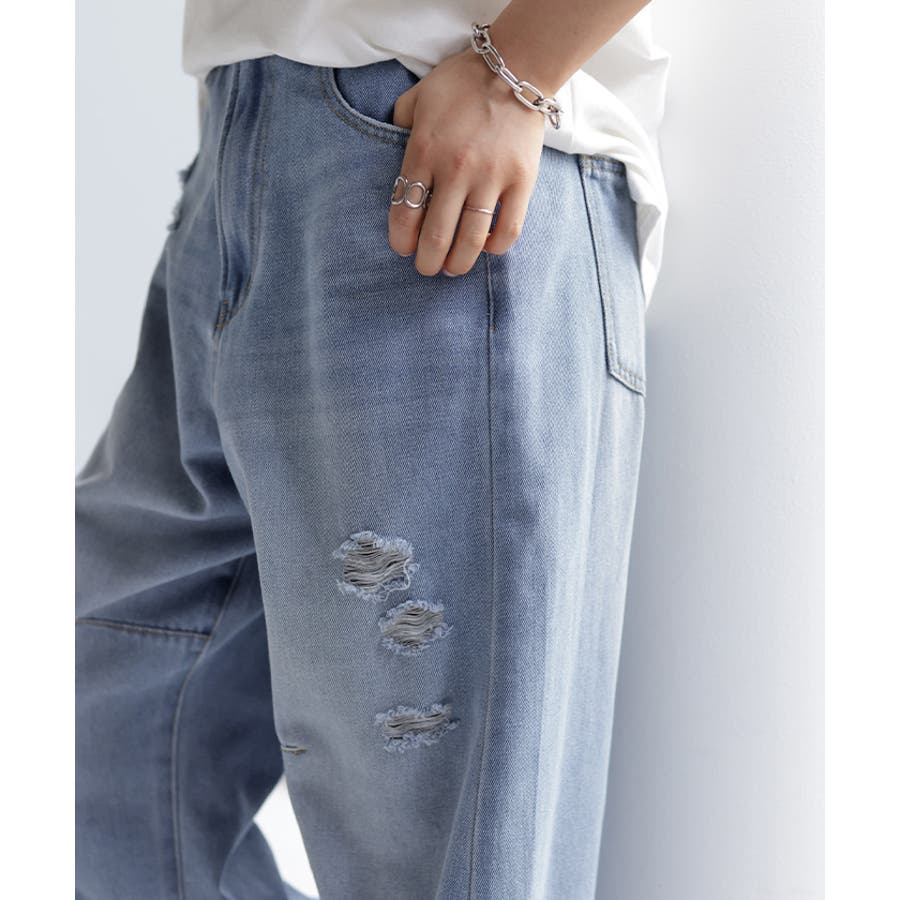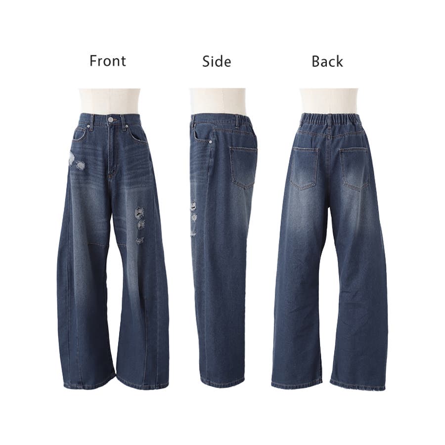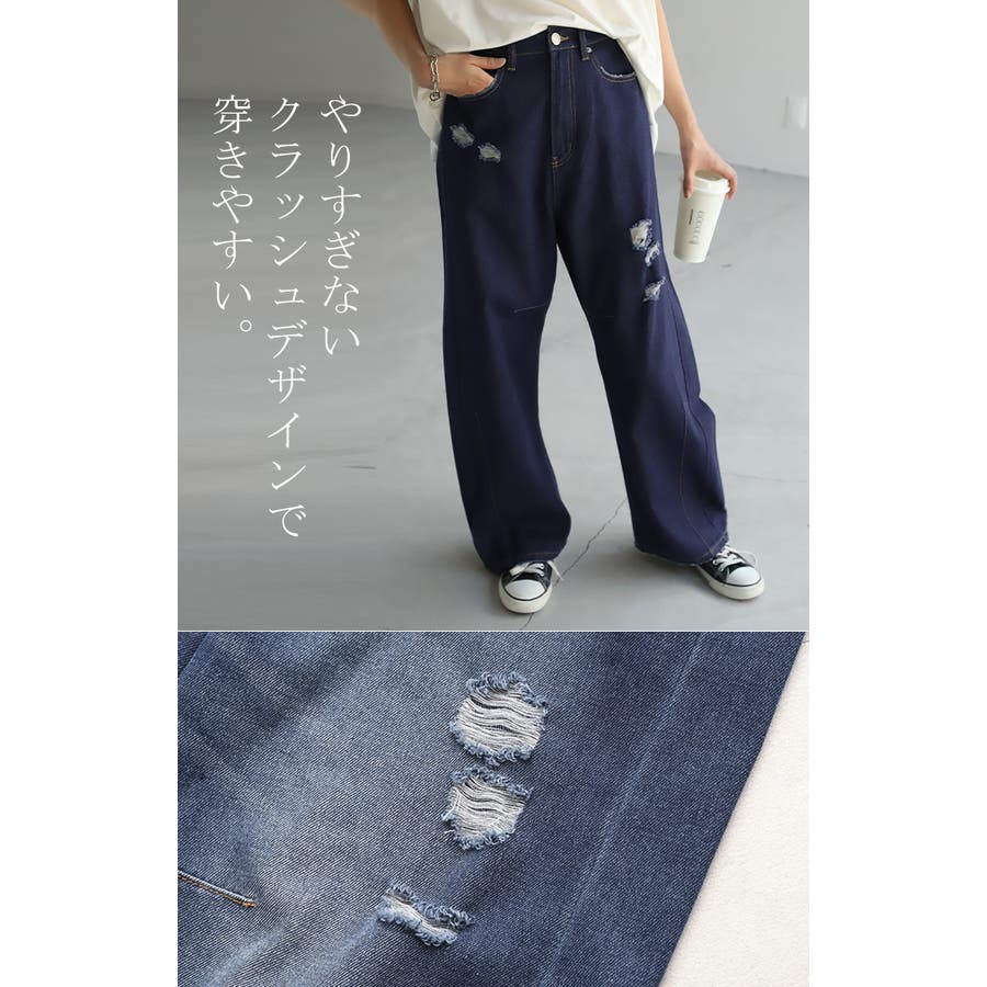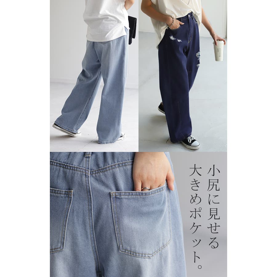 ダメージ加工が特徴で記ですがヒップラインや脚のラインなど気になる部分をさりげなくカバー。