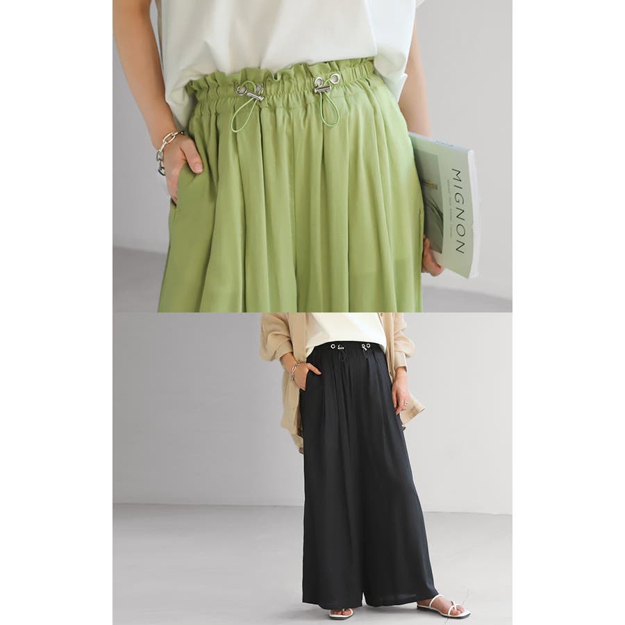 ウエストのワンポイントに金具で調整できるドローコードを付けてトレンド感を演出。