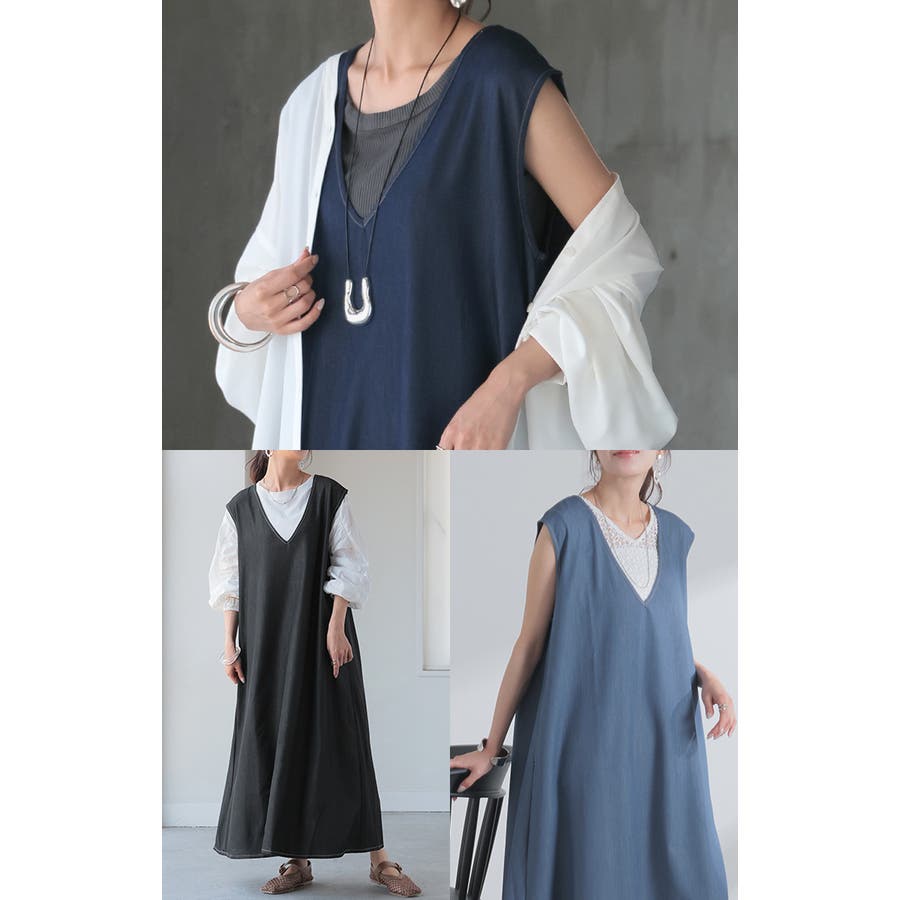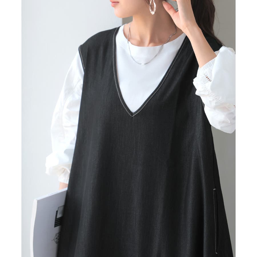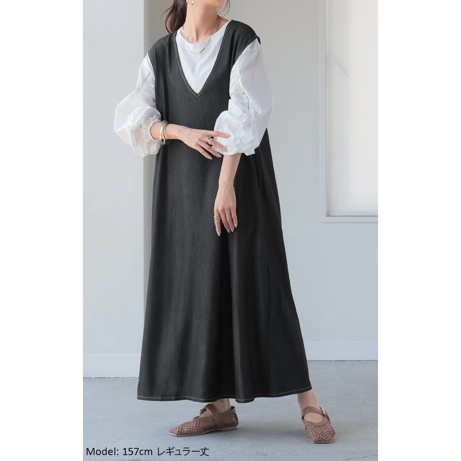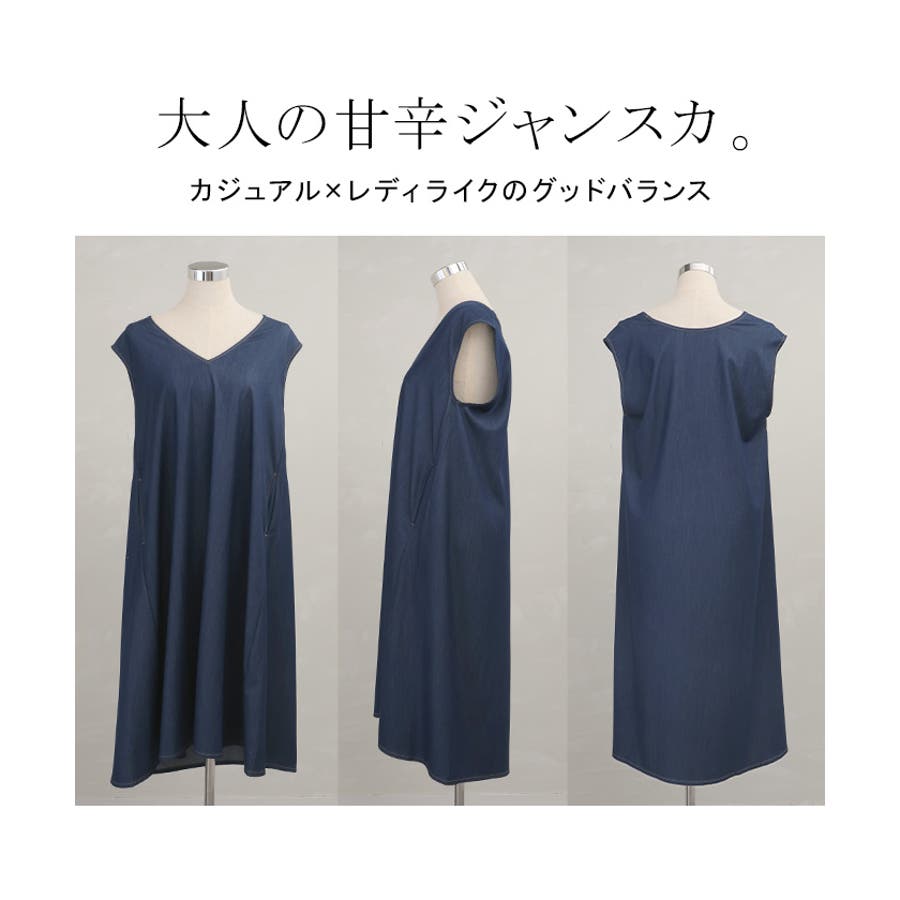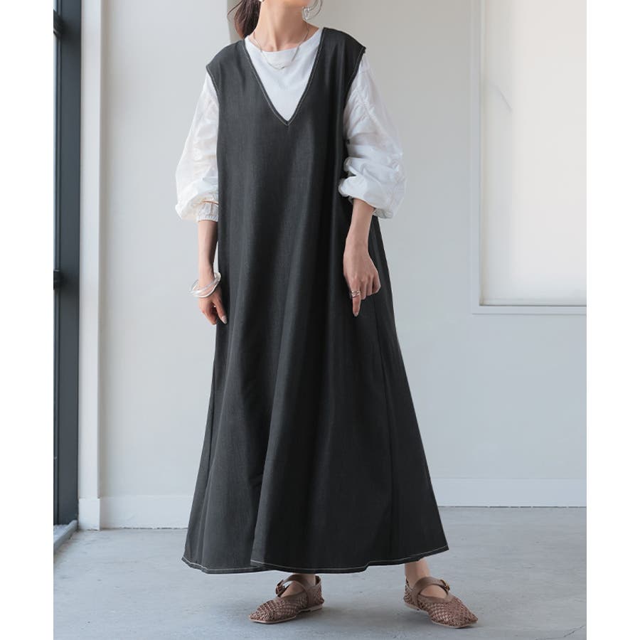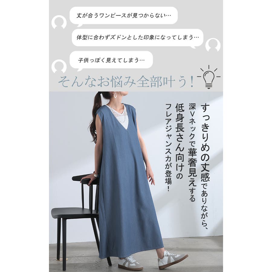 すっきり見える深いVネックに、ふんわり広がるフレアシルエットのジャンパースカートです。