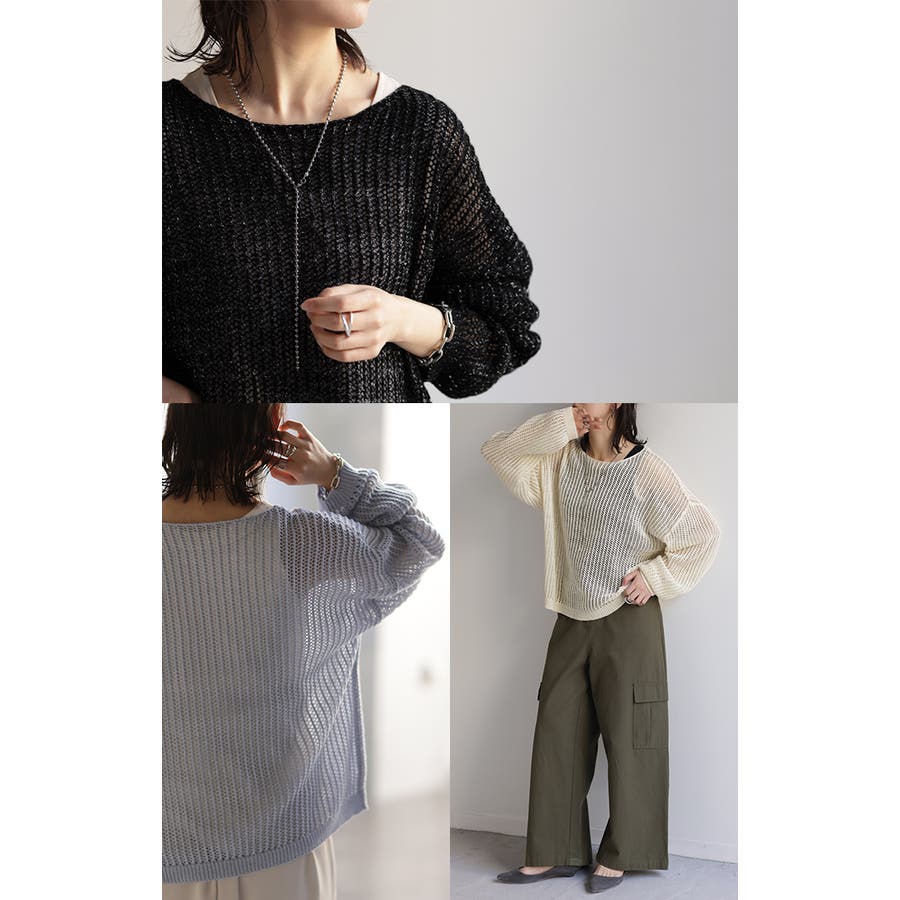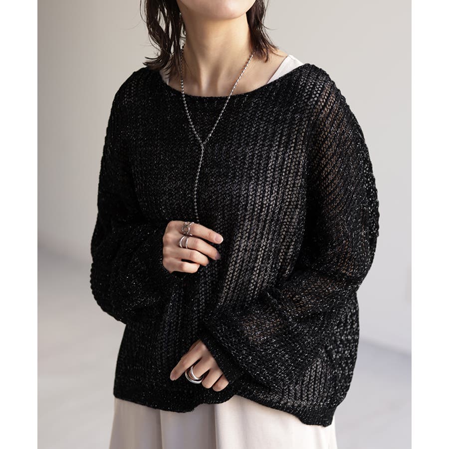 程良い肌見せがかわいい透かし編みにラメをプラスしたヘルシーなプルオーバーニットです。