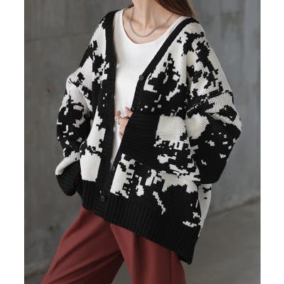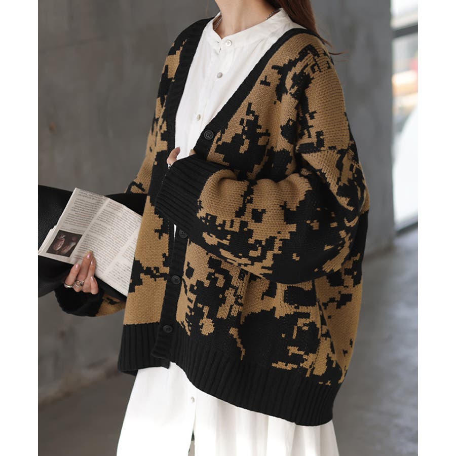 デジタルカモフラ柄が目を引くニットカーディガンです。