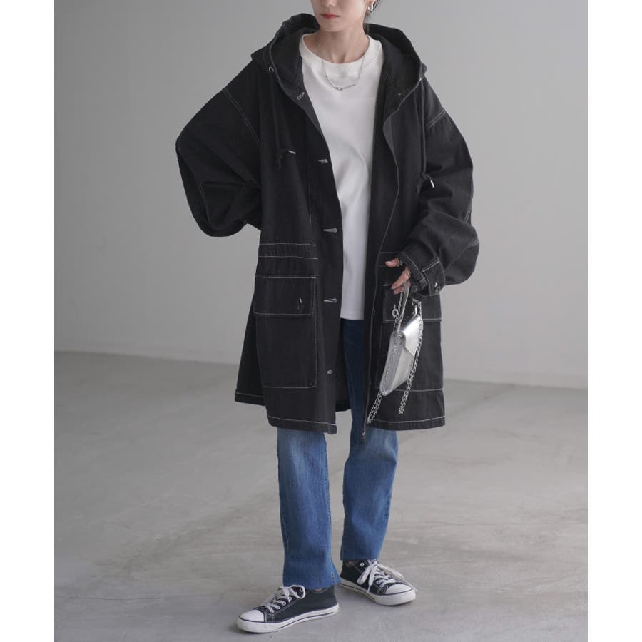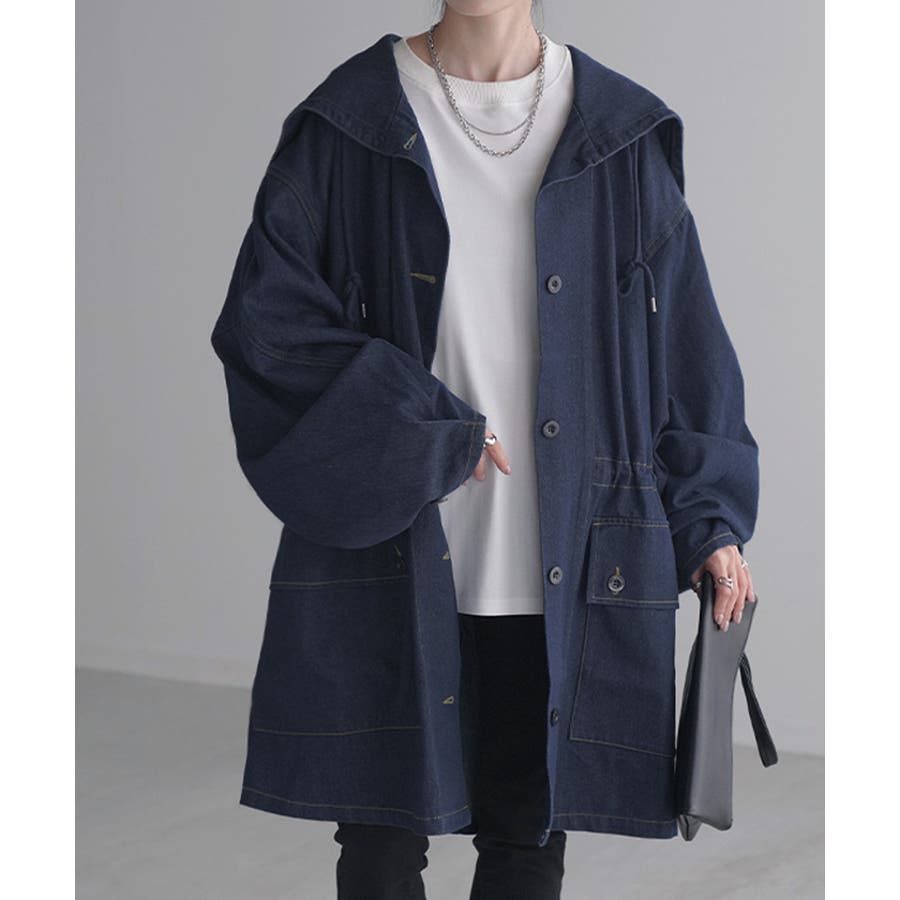 大きなフードが特徴的なミリタリーデニムジャケットです。