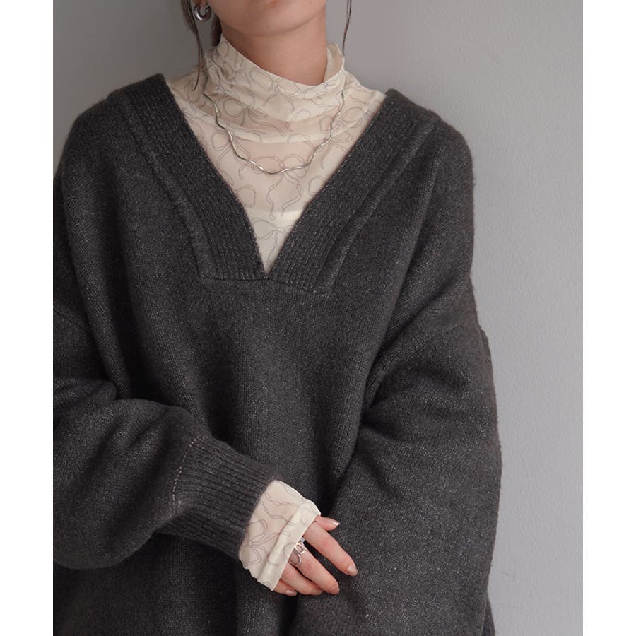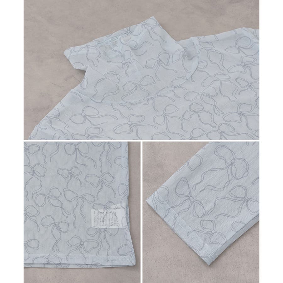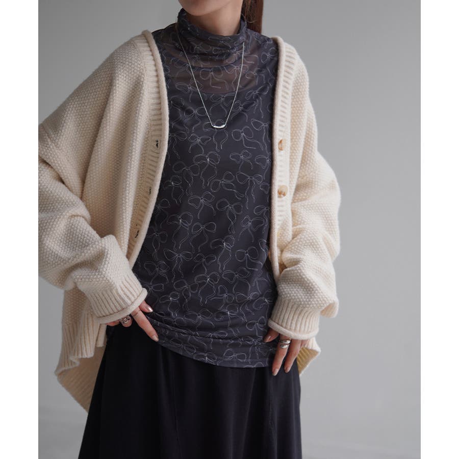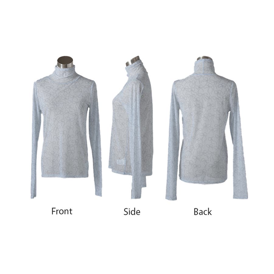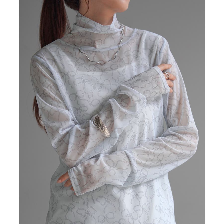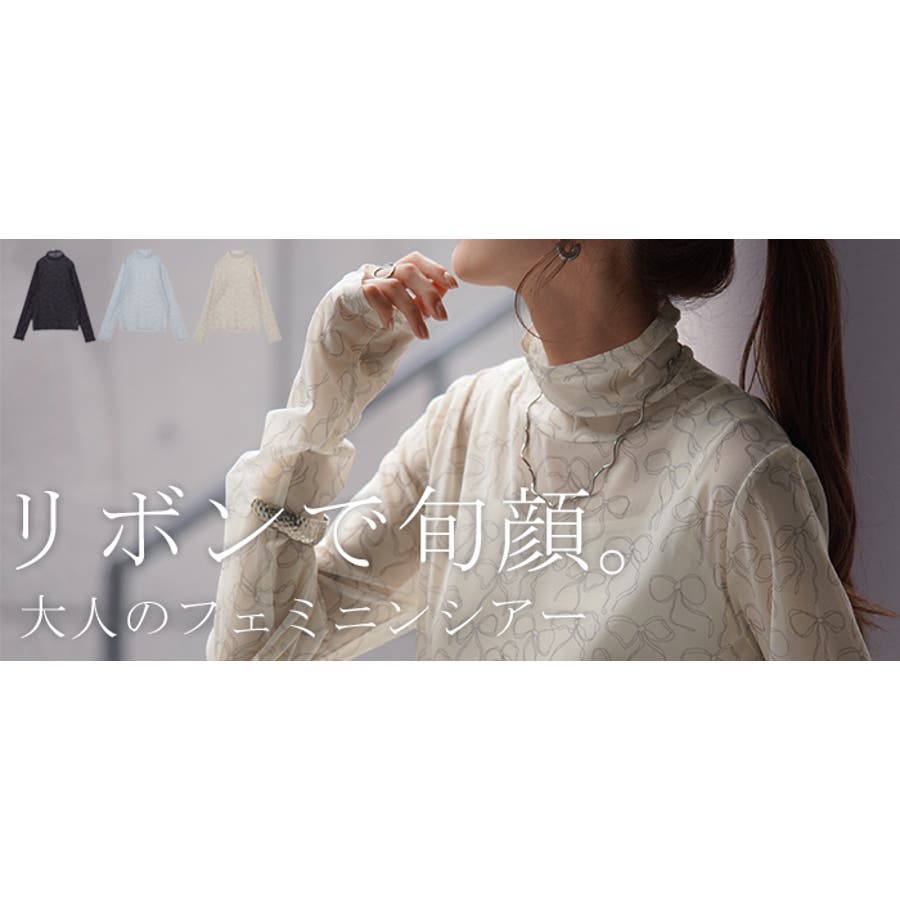 主張しすぎないリボンの総柄が特徴的なシアーメッシュトップスです。