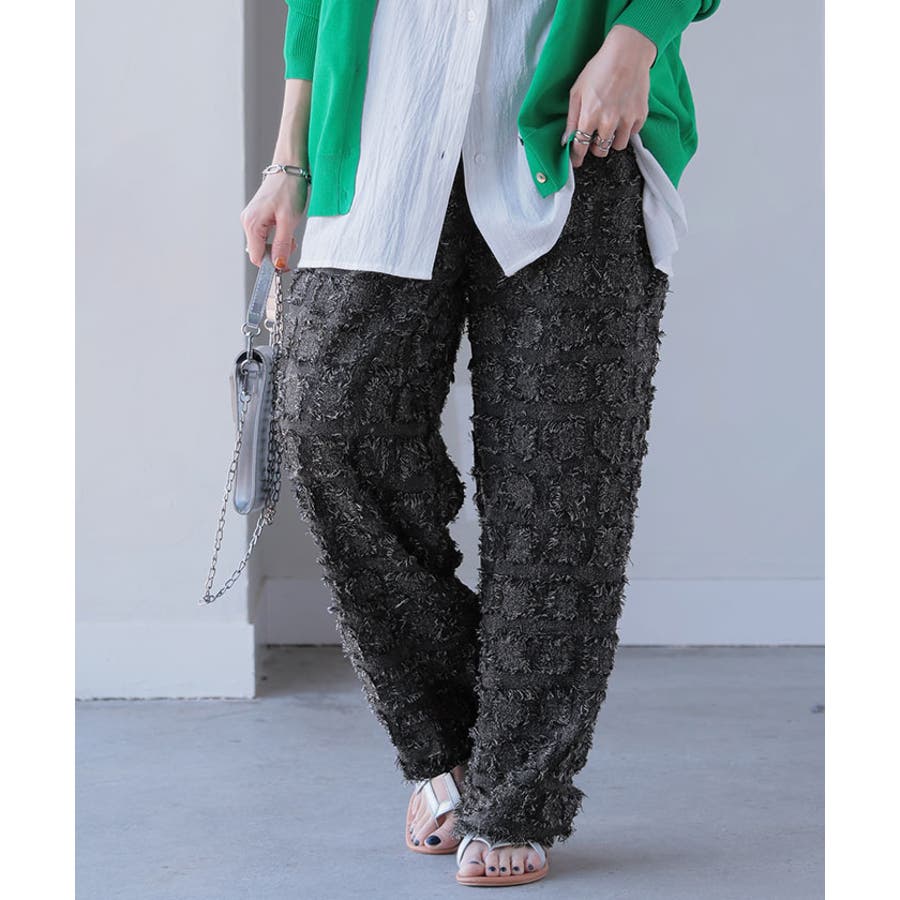 短めフリンジとブロックチェックで個性派な仕上がりのイージーパンツです。