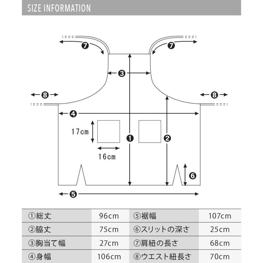 | サイズ | 総丈 | 脇丈 | 胸当て幅 | 身幅 | 裾幅 | スリット | 肩紐 | ウエスト紐 |