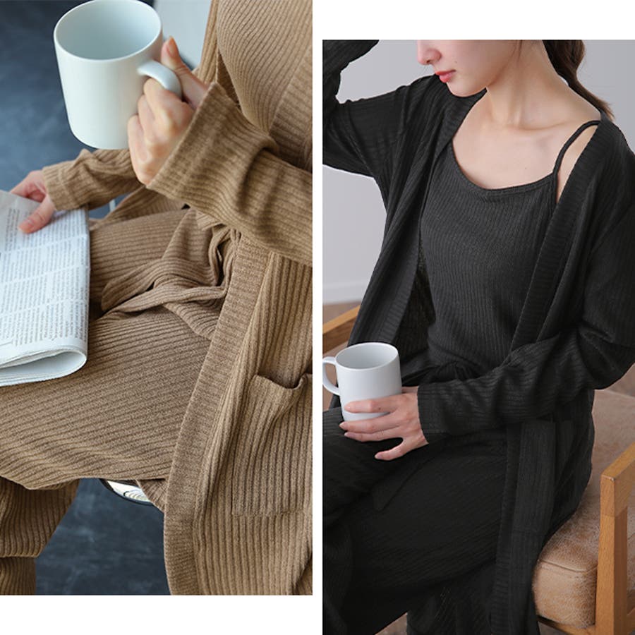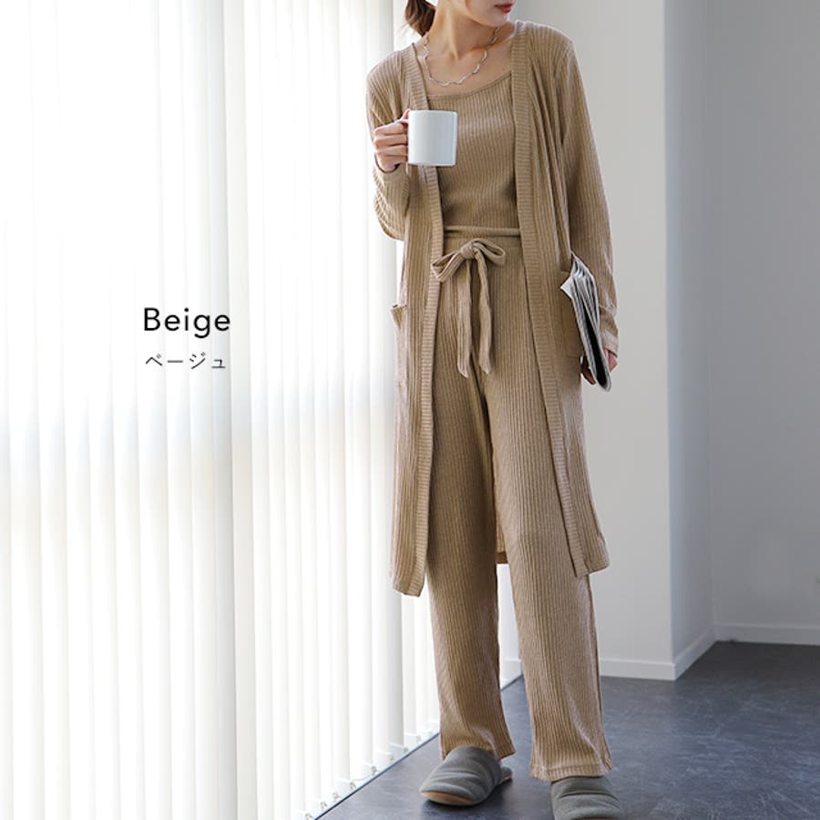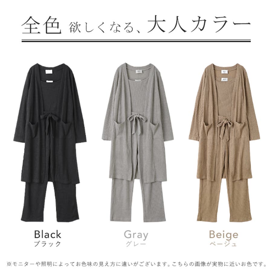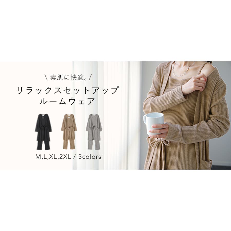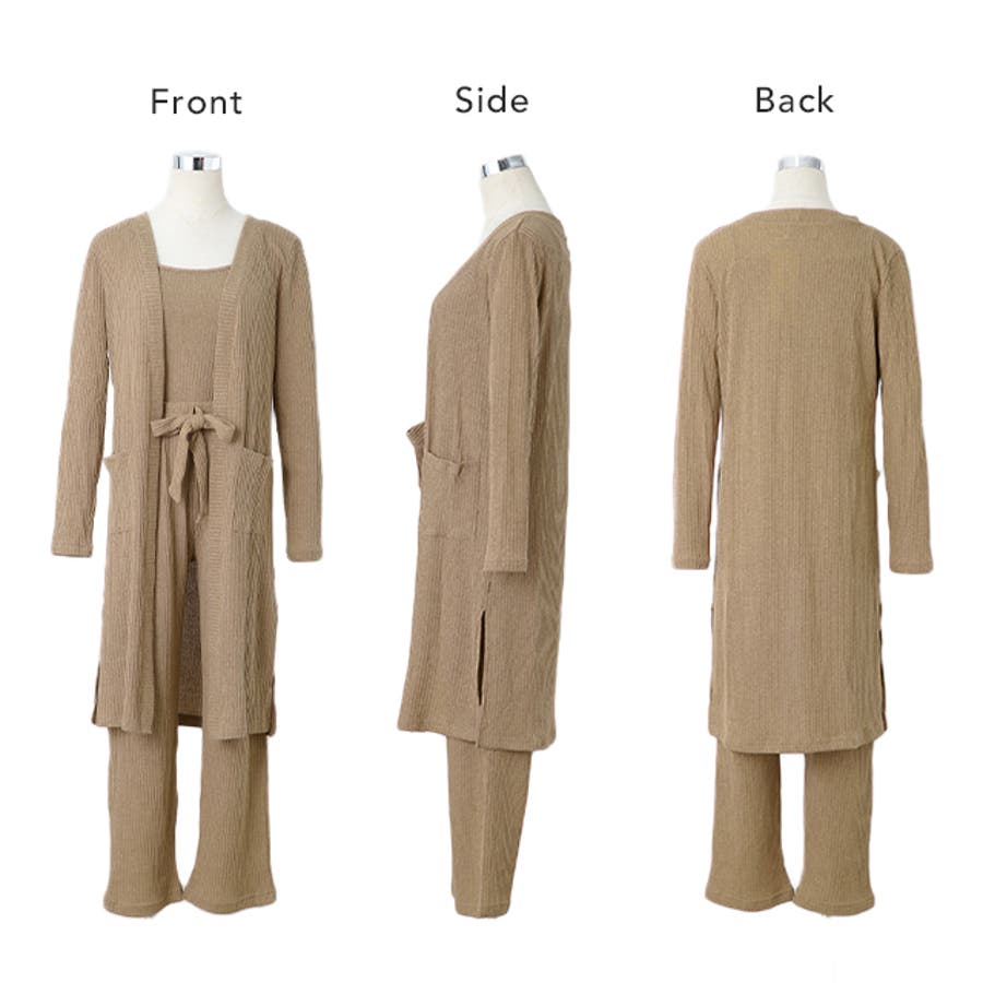 ルームウェア セットアップ 3点セット カーディガン キャミソール パンツ ロングカーディガン カーデ HS レディース 大きいサイズ プラスサイズ キャミ 部屋着 パジャマ 彼モテ S M L XL 2XL LL 2L 3L 黒 灰色 グレー キャメル ベージュ ブラック