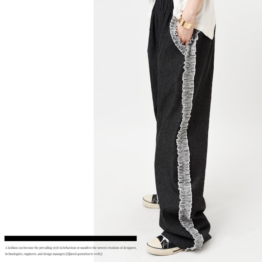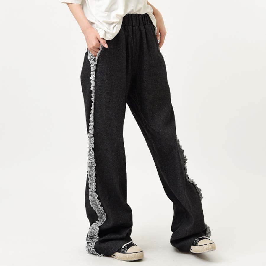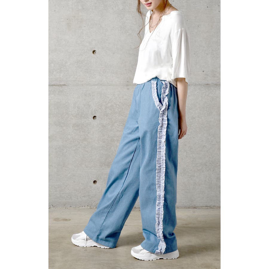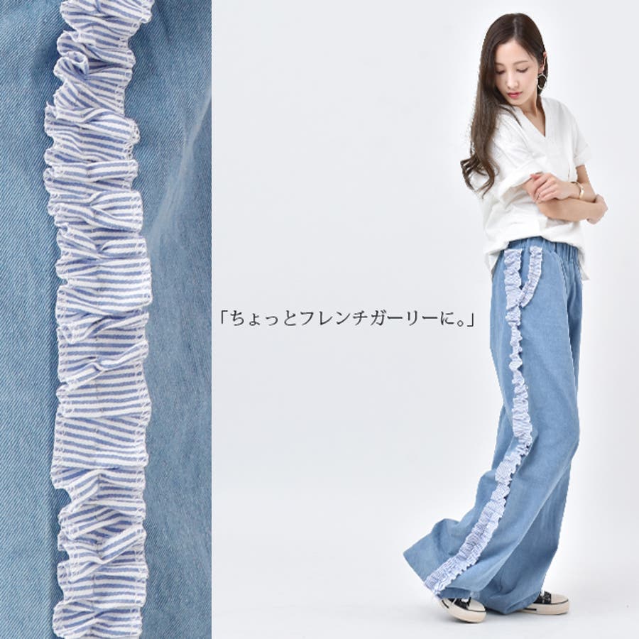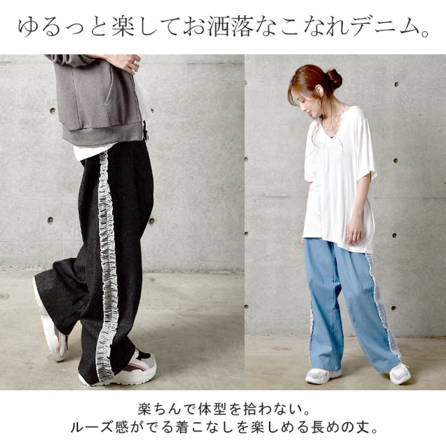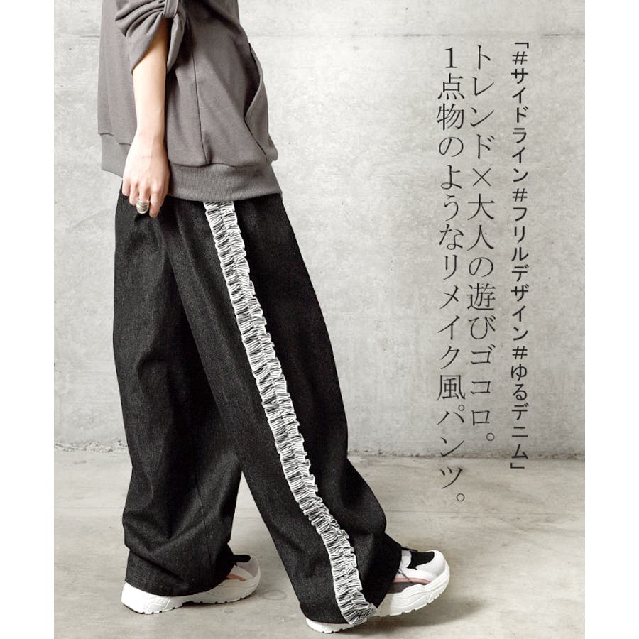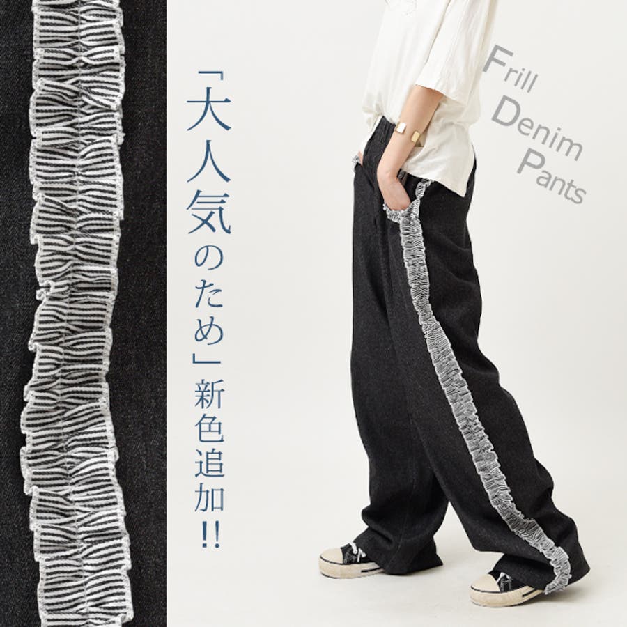 デニム パンツ ワイドパンツ 大きいサイズ ストレートパンツ フリル ジーンズ