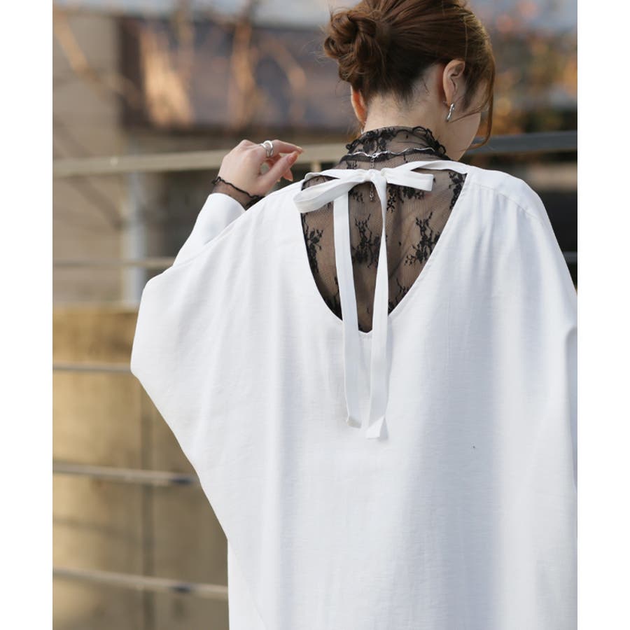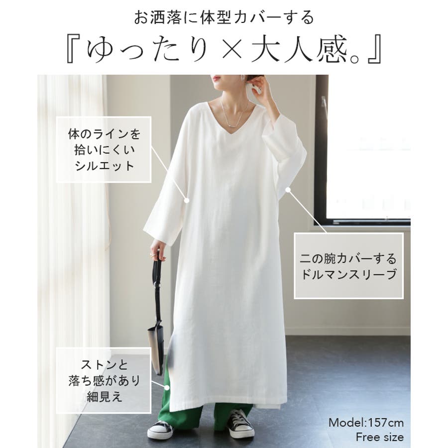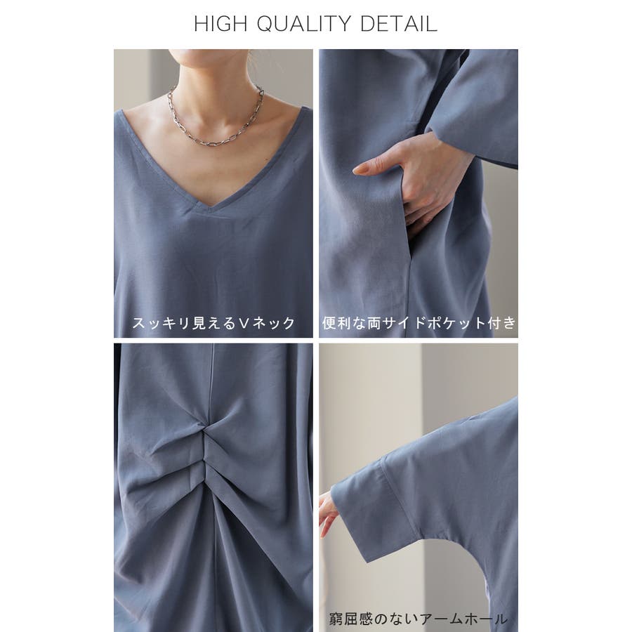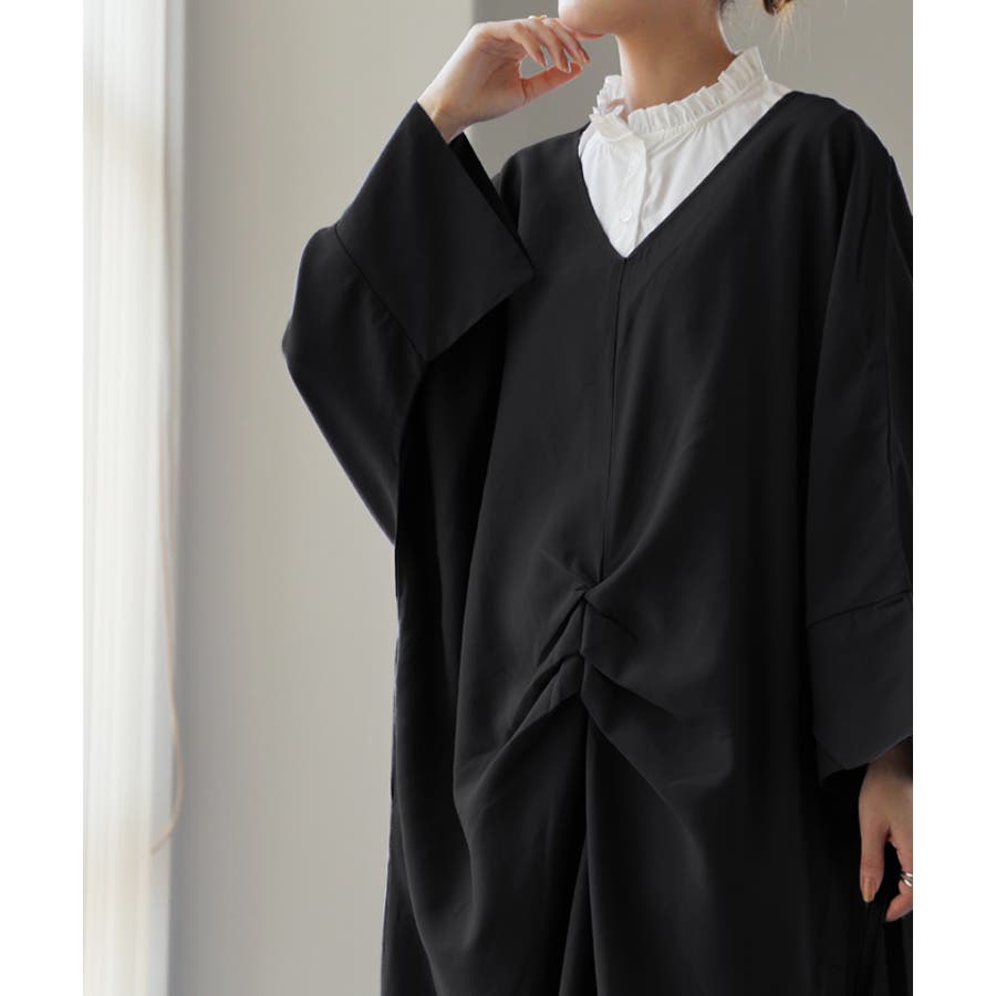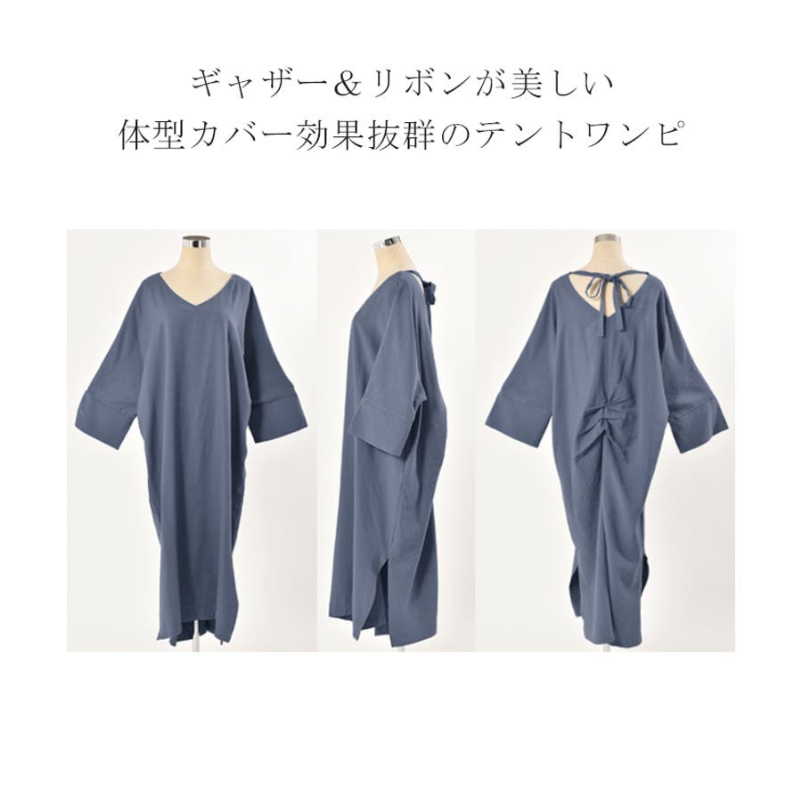 バッククロスギャザーだからテントシルエットで体型カバーも。