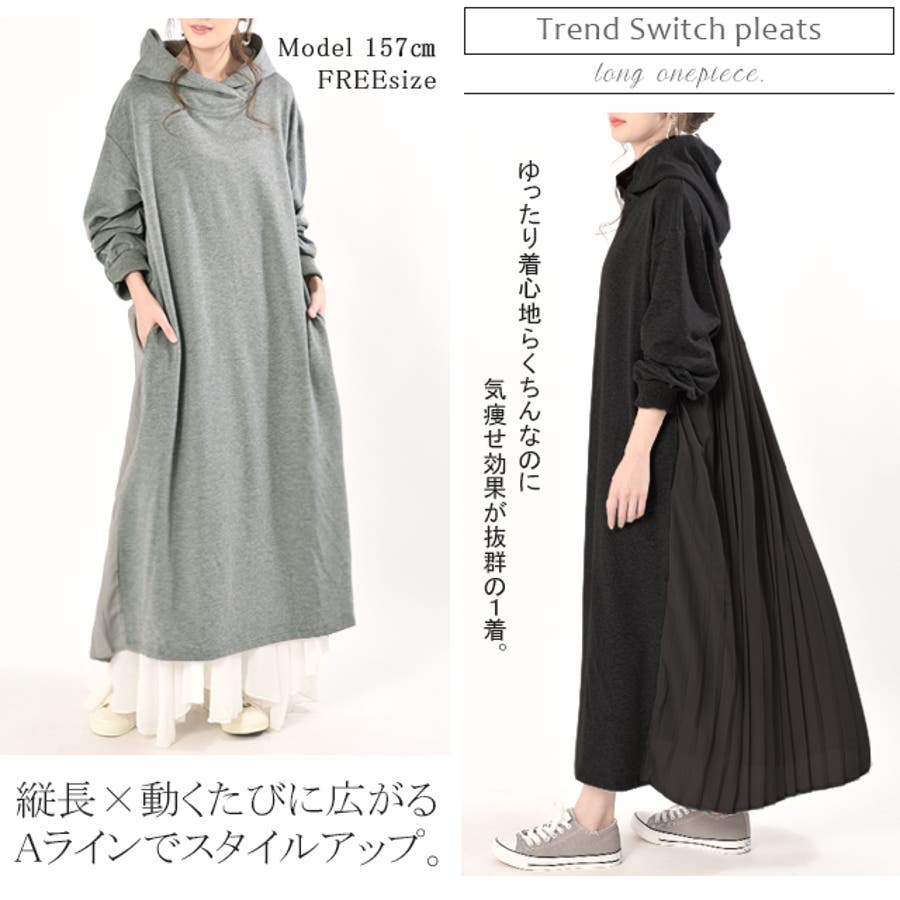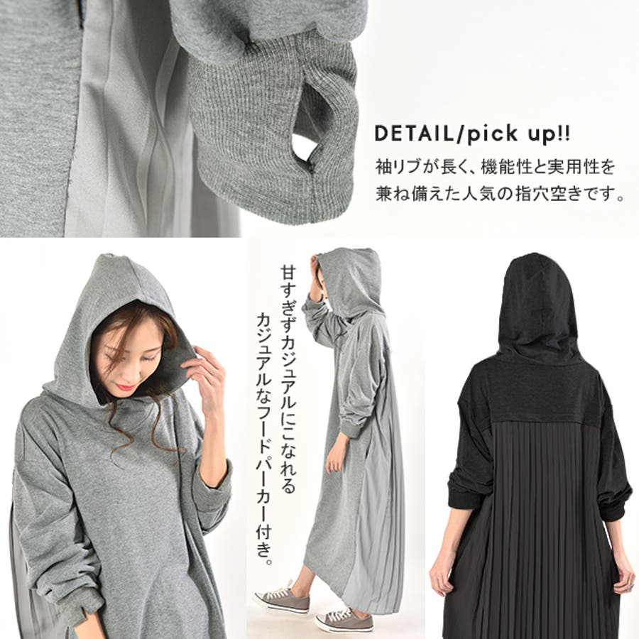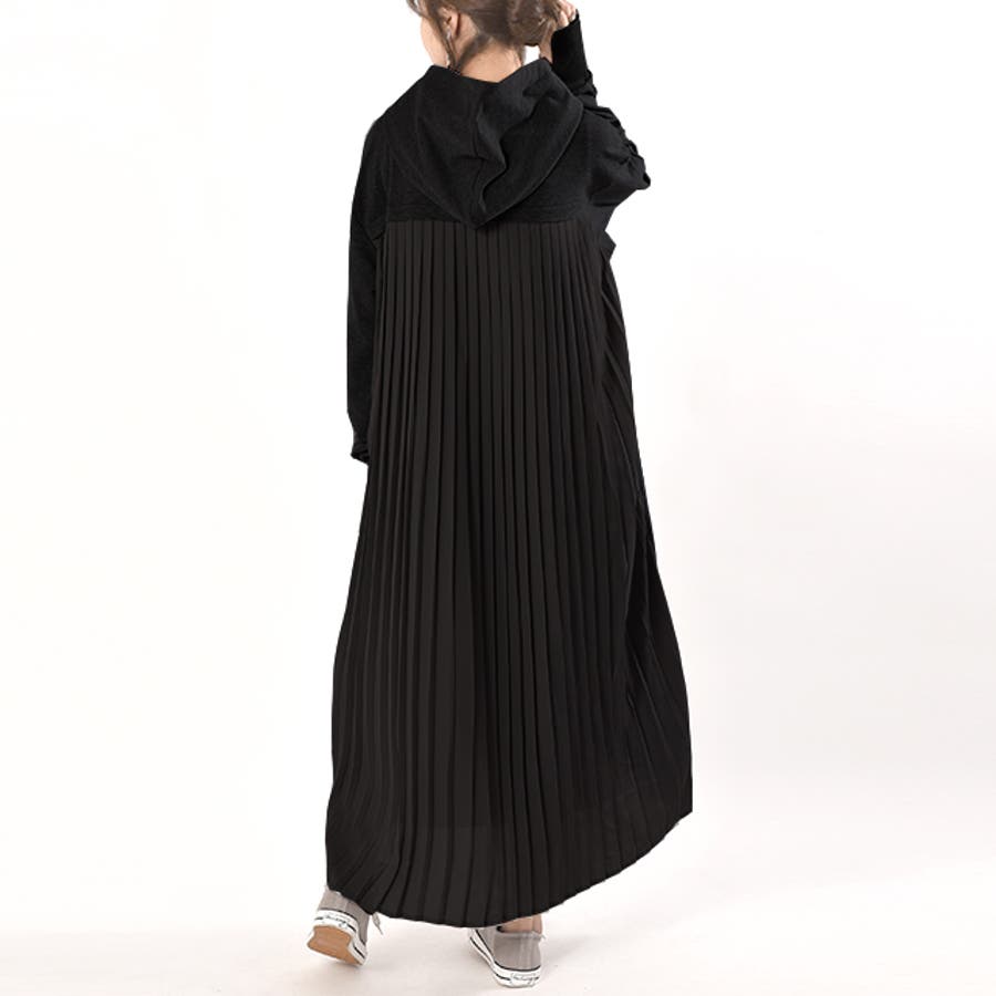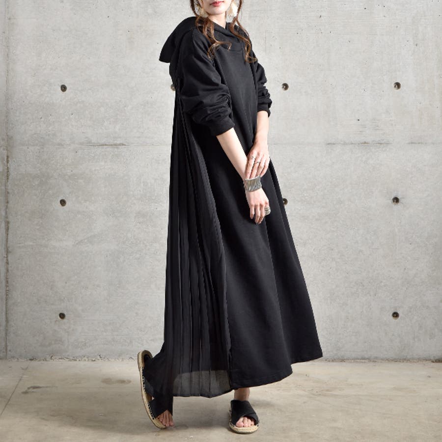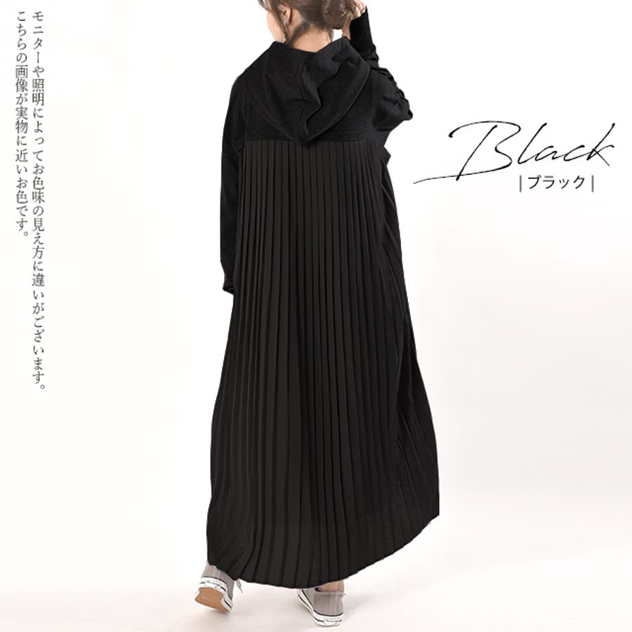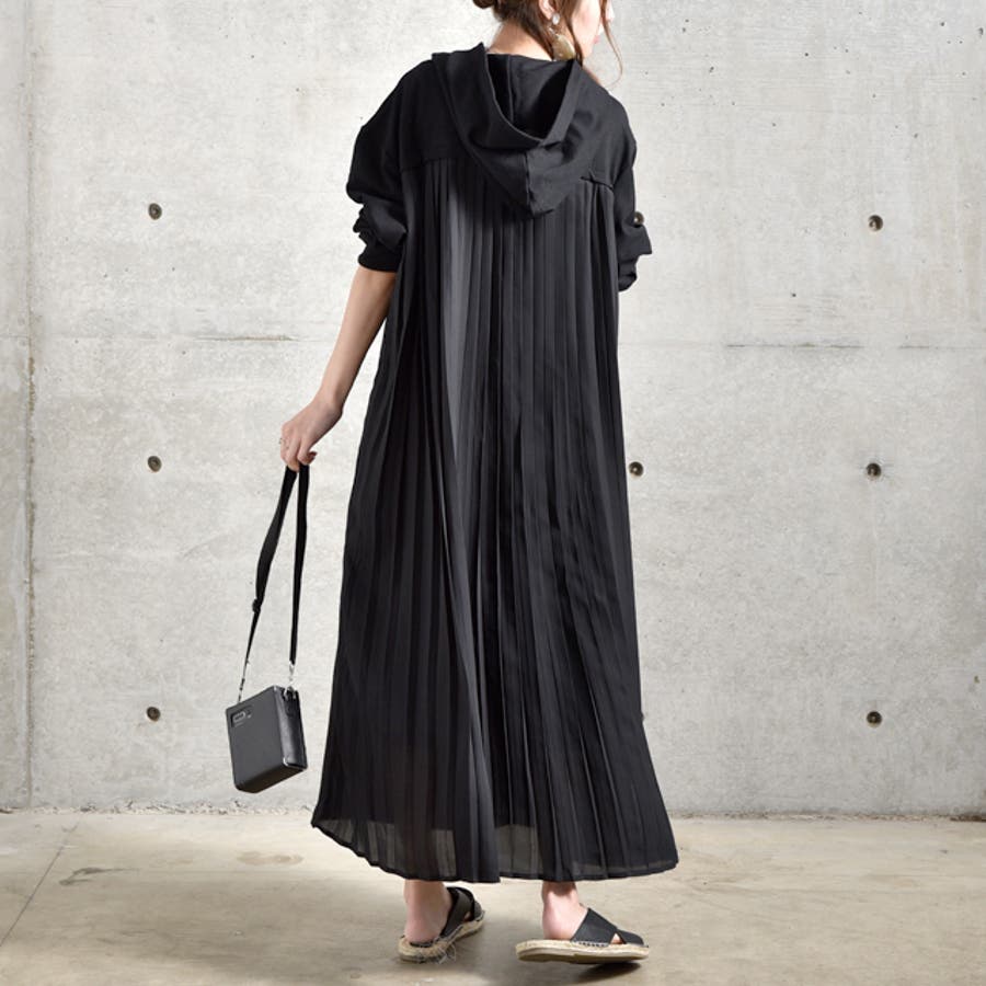 ワンピース 黒 長袖 パーカーワンピース ロング プリーツ ロングワンピース