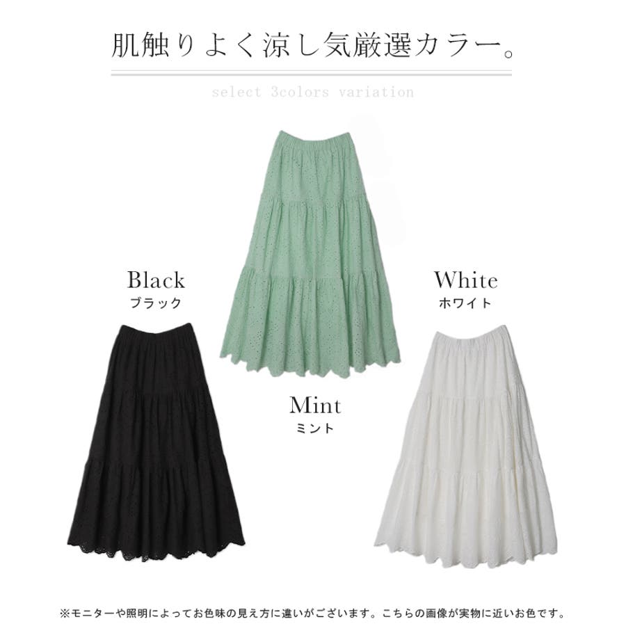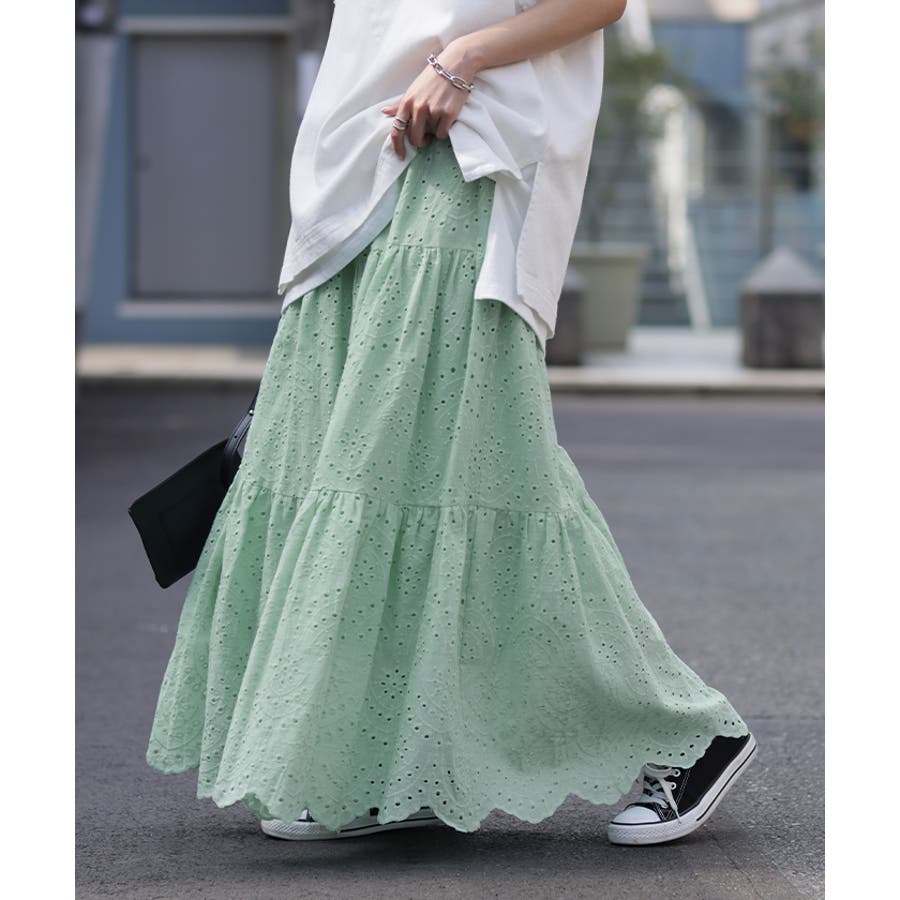 マキシスカート マキシ丈スカート スカラップ ロングシーズン Aラインスカート 体型カバー 総レース ゴムウエスト ゴムウェストウェストゴム コットン100% 綿100% スカラップ 刺繍スカート 刺繍レース キレイめ ブラック ホワイト ミント ミントカラーブルー シャーベットカラー エメラルドグリーン グリーン 黒 黒色 白 白色 青 青色 緑 緑色 春夏 春 夏 20代30代 40代 50代 おしゃれ お洒落 オシャレ かわいい 可愛い カワイイ フリーサイズ M L XL XXL 2L 3LHUG.U HUGU ハグユー はぐゆー