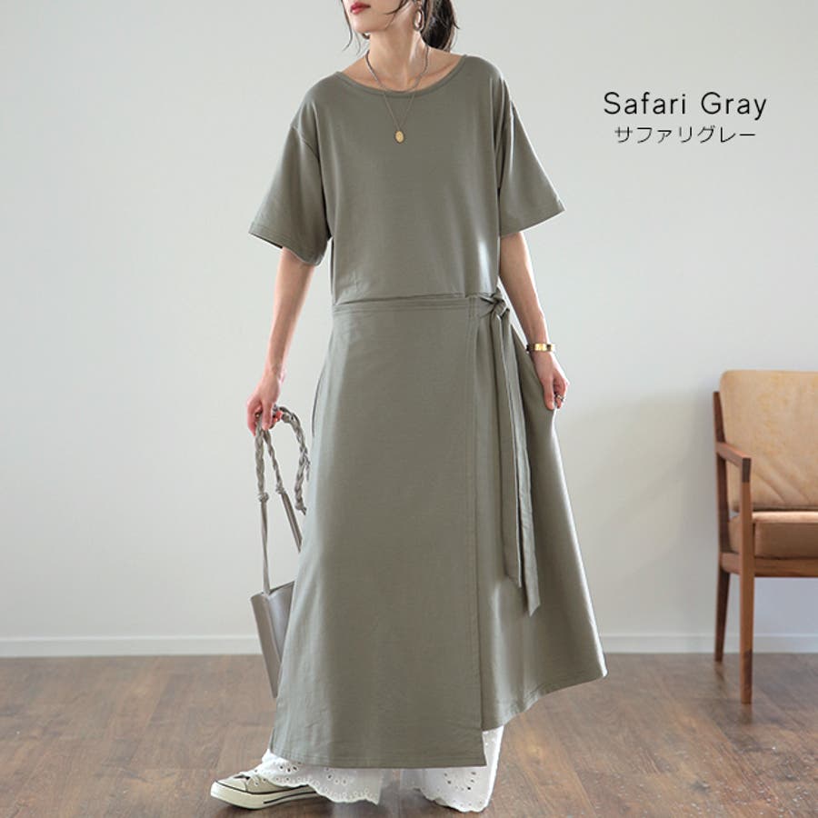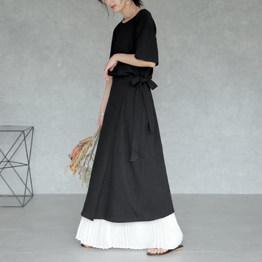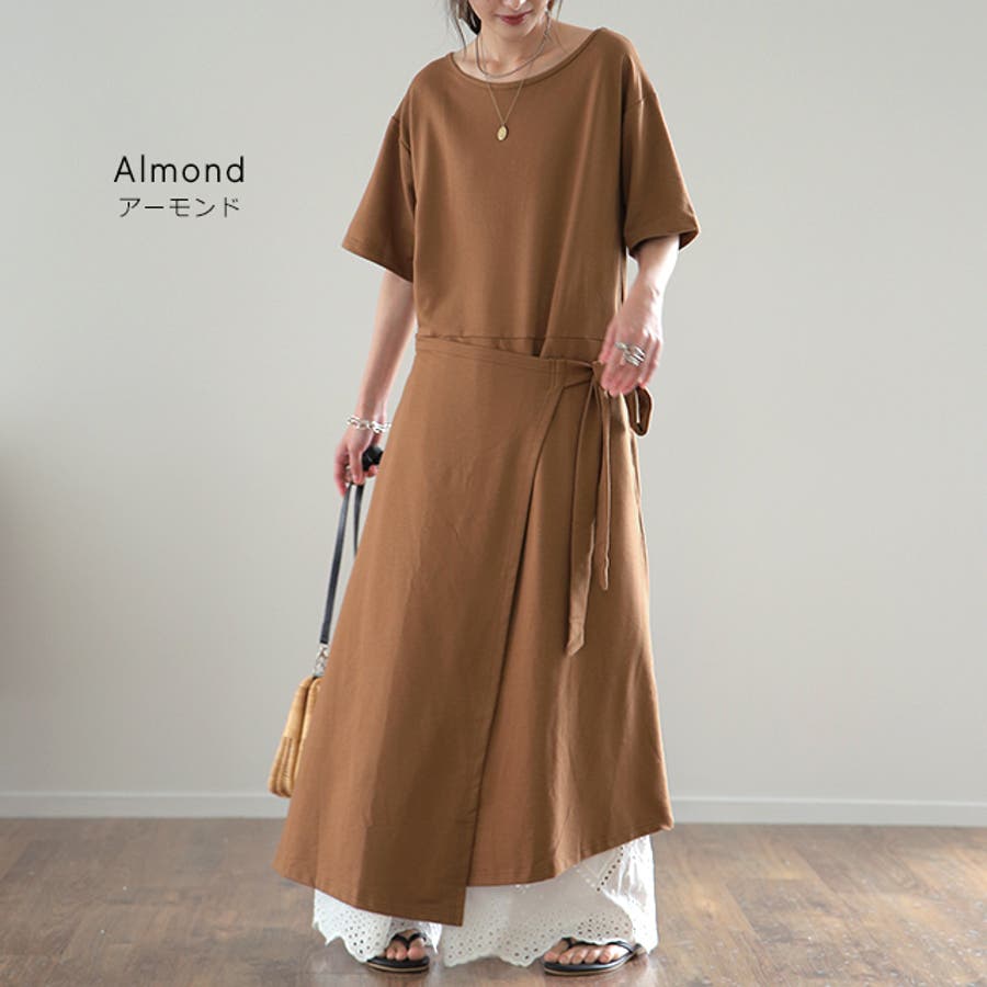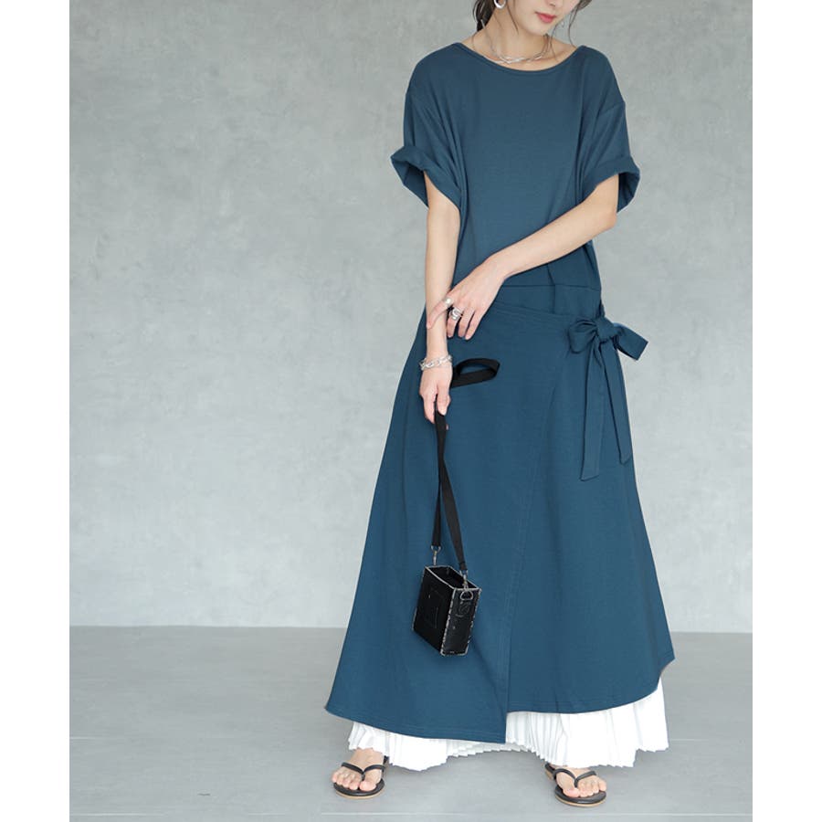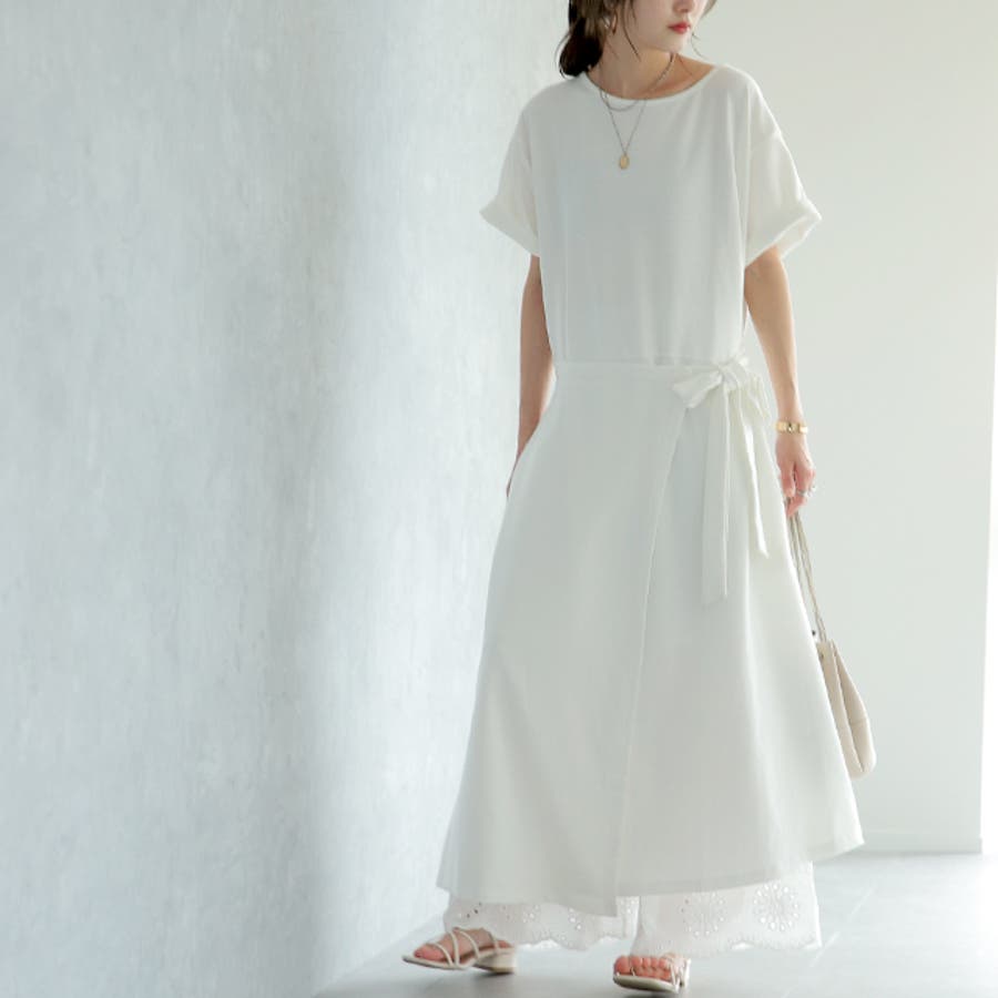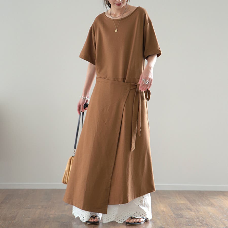 シンプルなワンピースを巻きスカート風に仕上げたデザインワンピース。