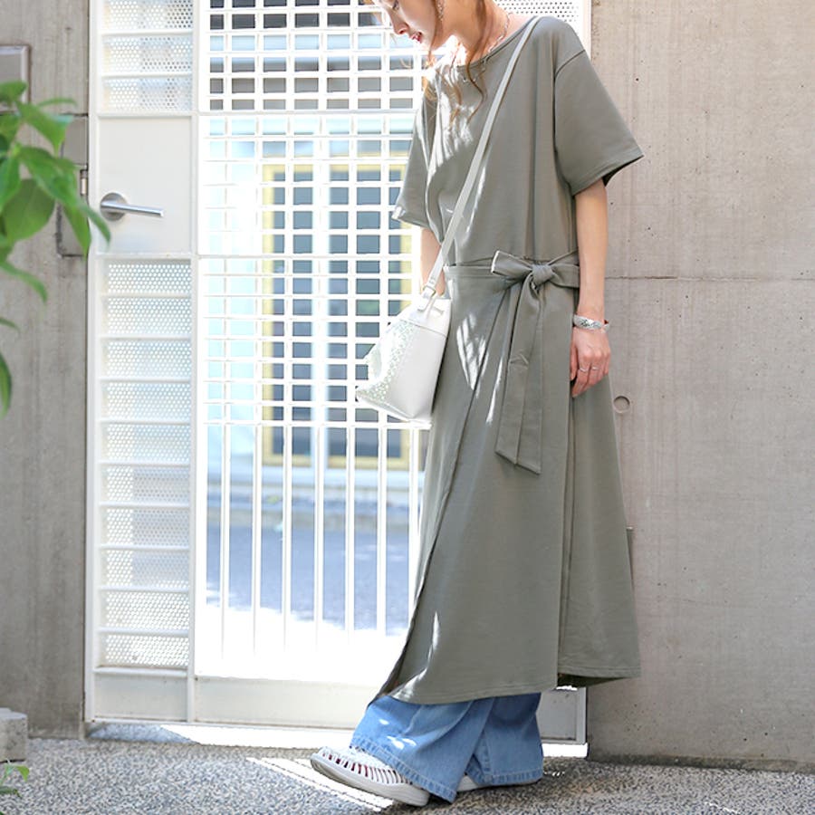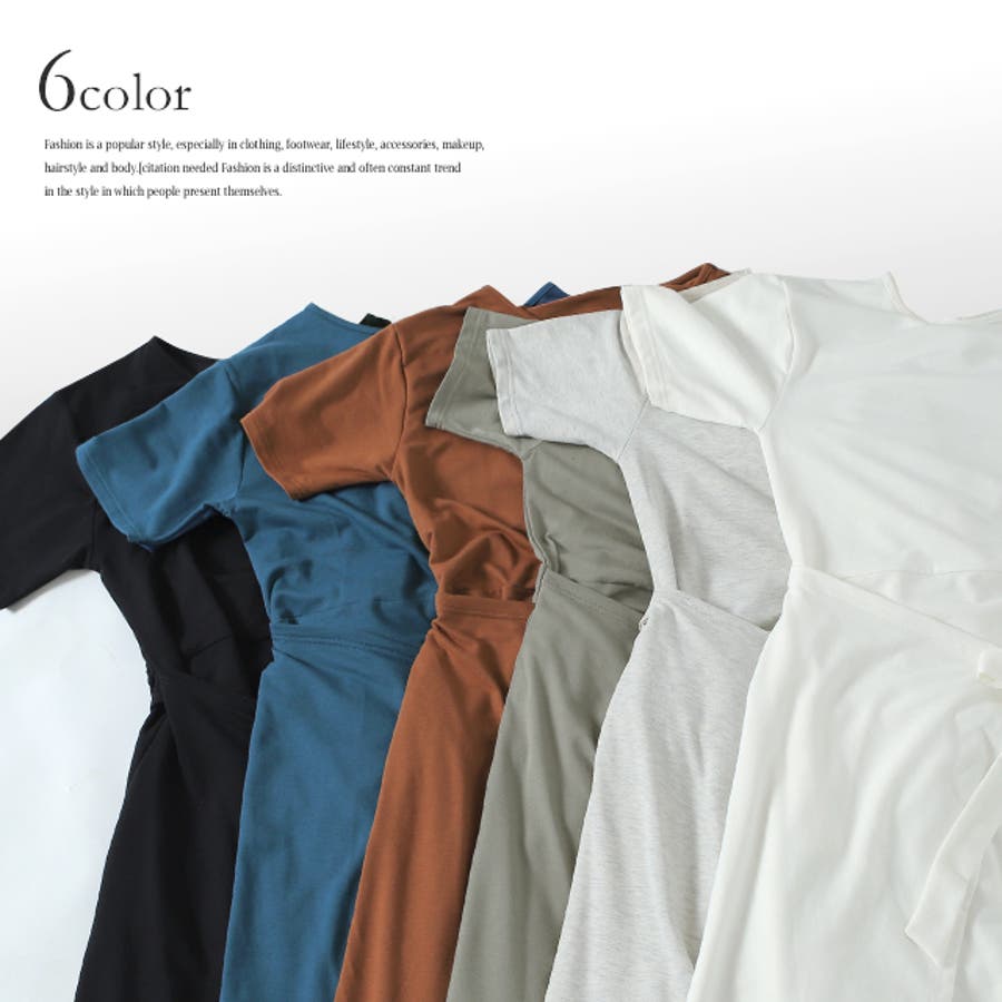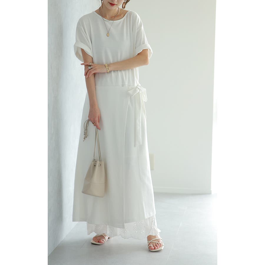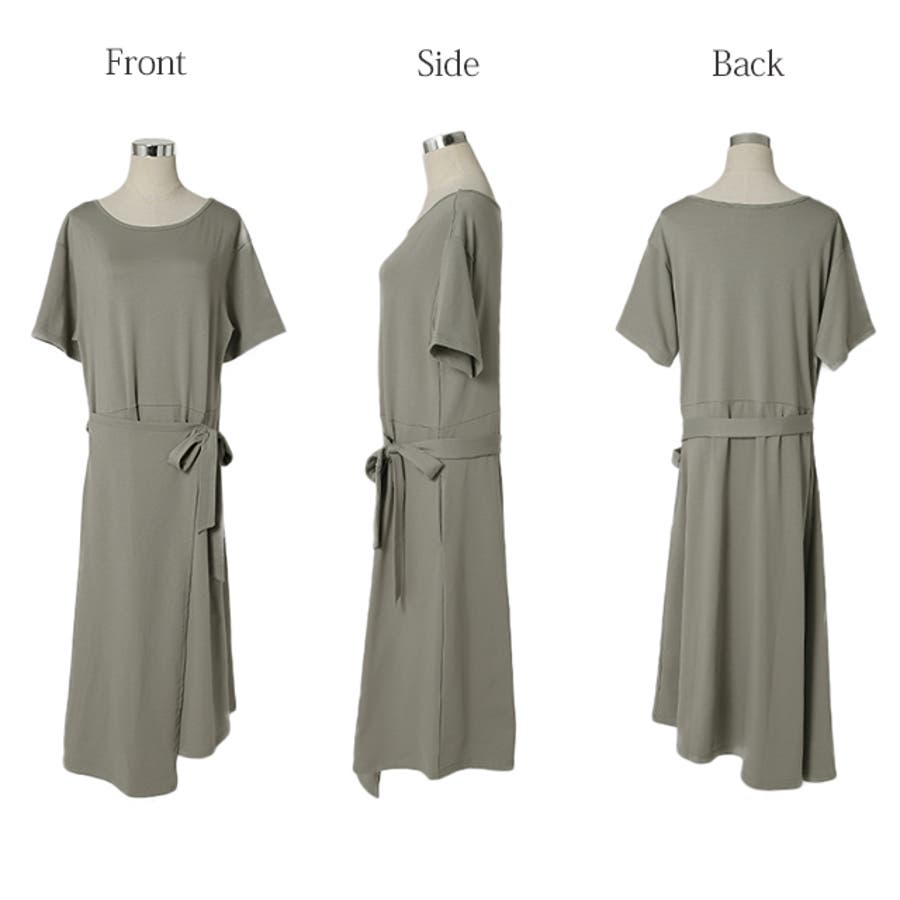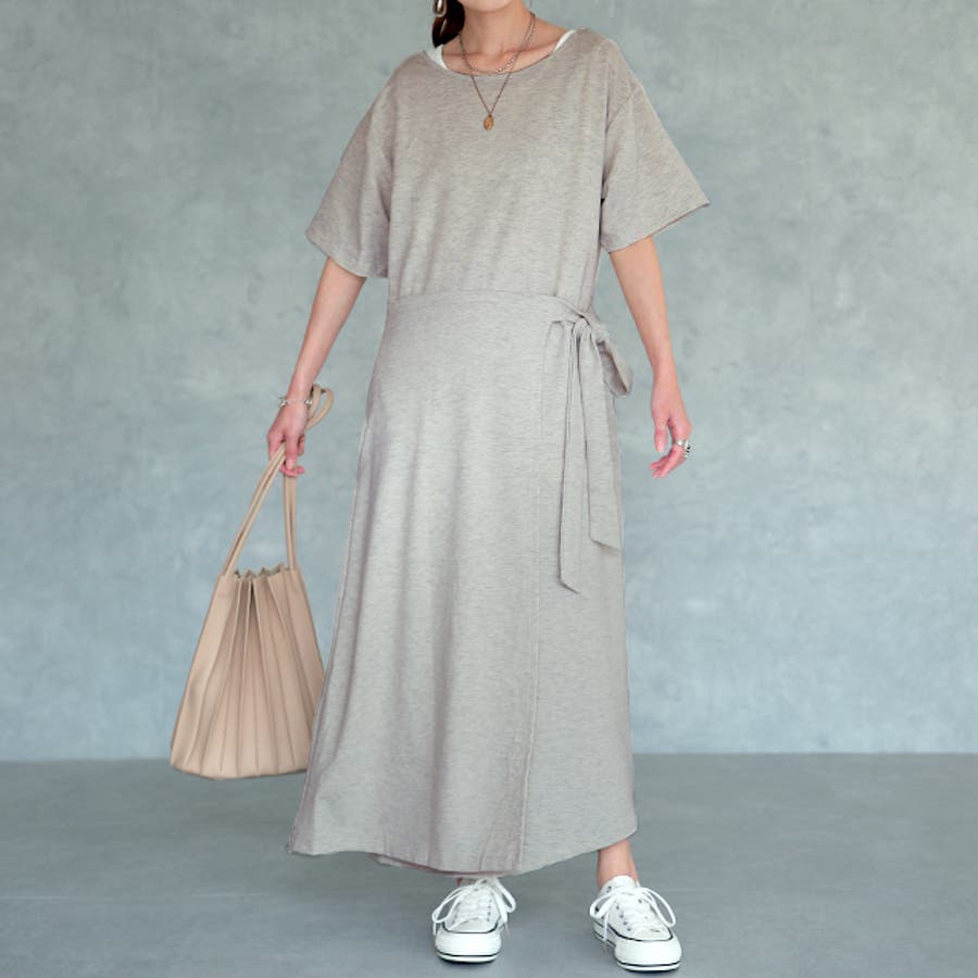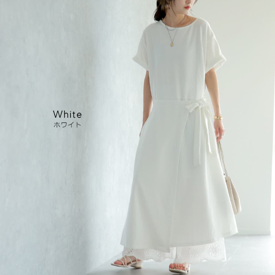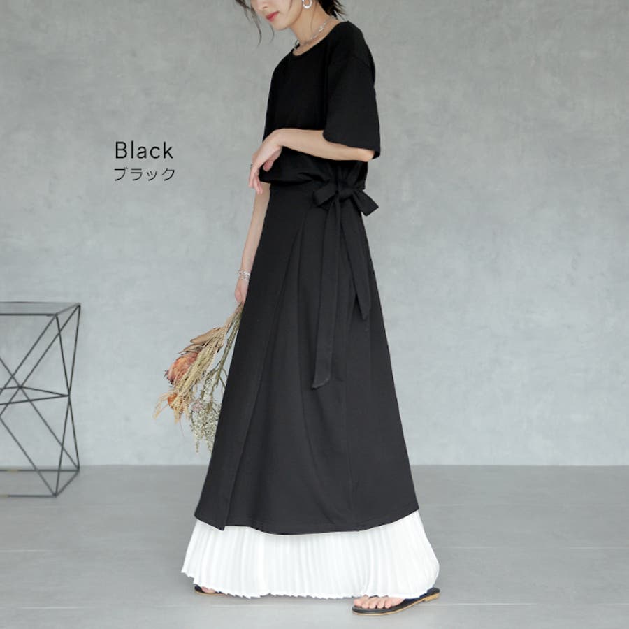 シンプルなワンピースを巻きスカート風に仕上げたデザインワンピース。