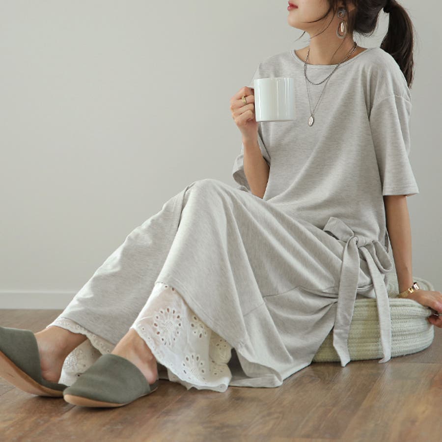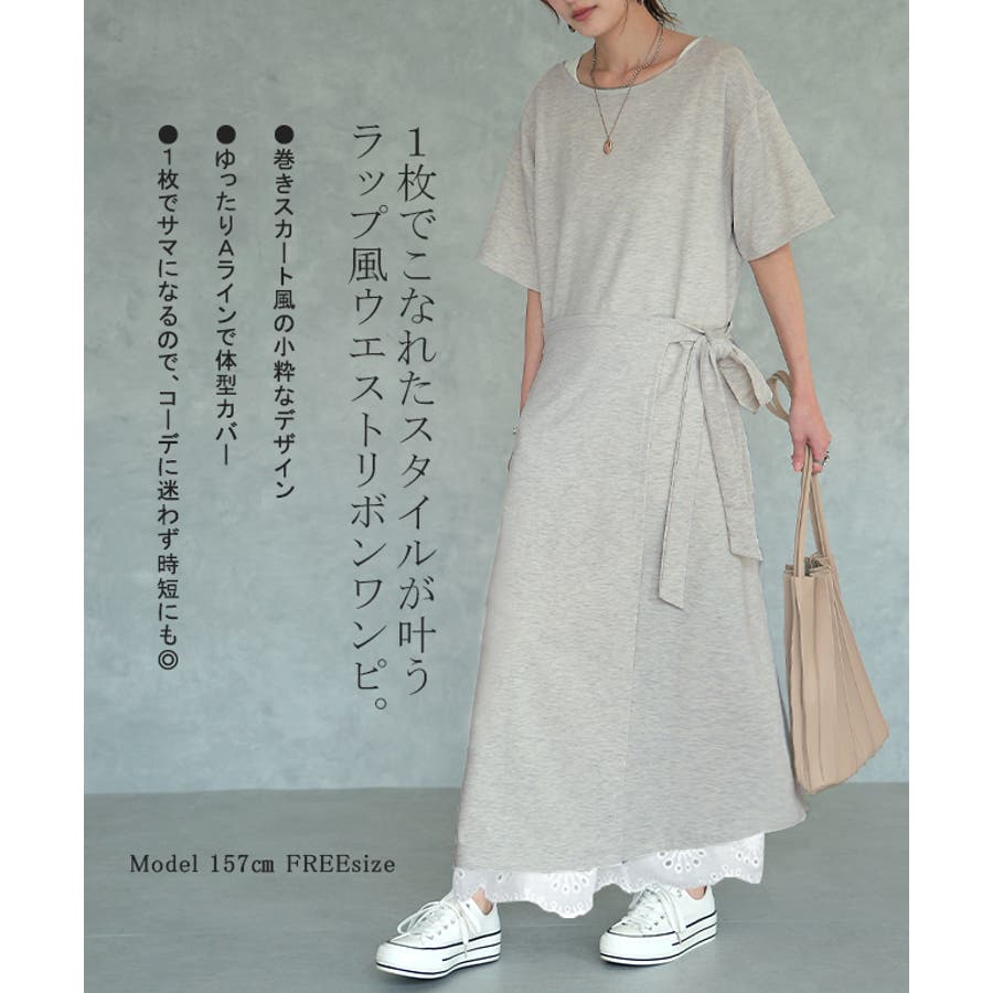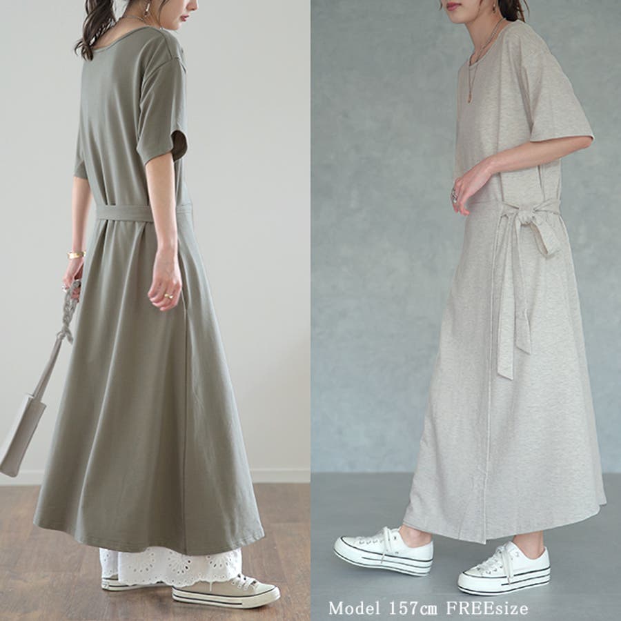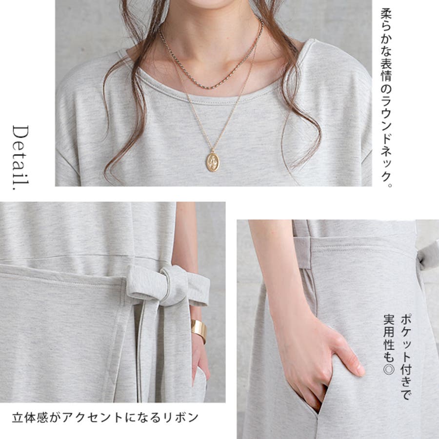 ワンピース レディース ロングワンピース ロング 半袖 丸首 ウエストリボン