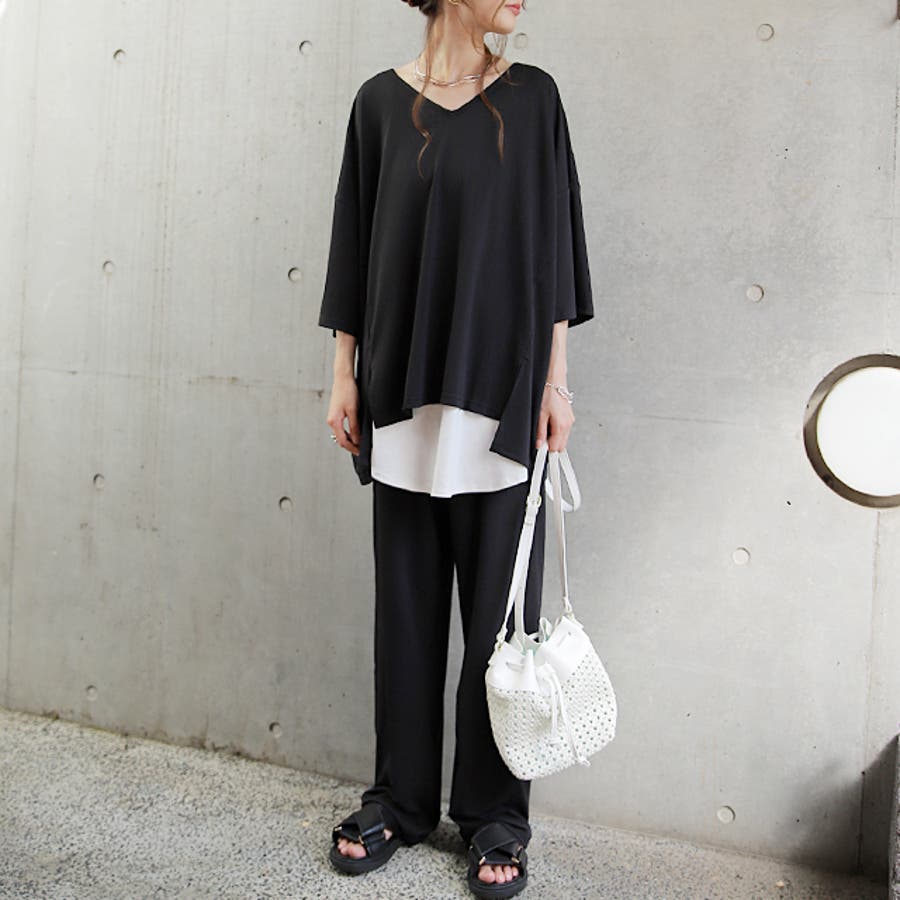 Vネック ワンマイルウエア ルームウエア プルオーバー カットソー 無地 シンプル 薄手 薄い 5分袖 7分袖 大人 チュニックお尻が隠れる ずぼん ズボン ゴムウエスト ゴムウェスト ウエストゴム ウェストゴム ゴム ゆる ゆったり 体型カバー ビッグビッグシルエット ビック ビックシルエット 楽 らくちん らく 楽ちん リラックス ビッグ ビック ビッグシルエット オーバーサイズお家で過ごそう お家時間 お泊り ブラック ストーングレー グレー チャコール チャコールグレー テラコッタ ブラウン ベージュ 黒黒色 灰色 茶 茶色 肌色 フリーサイズ M L XL XXL 2L 3L HUG.U HUGU ハグユー はぐゆー