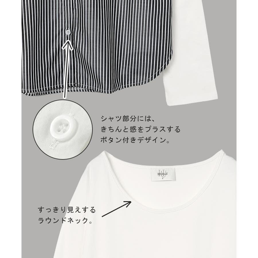 丸首 U字ネック カジュアル レイヤードシャツ レイヤードTシャツ レイヤードシャツ レイヤードトップス レイヤードカットソーフェイクレイヤード カットソー ティーシャツ ティシャツ 無地 シンプル 付け裾 裾出し ホワイト 白 白色 白黒 ボーダーモノトーン 20代 30代 40代 50代 おしゃれ お洒落 オシャレ かわいい 可愛い カワイイ フリーサイズ XL XXL 2L3L HUG.U HUGU ハグユー はぐゆー