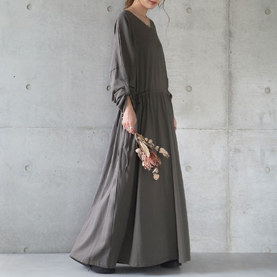 ロールアップ ドロップショルダー 体型カバー ウエストマーク Aラインワンピース Aラインワンピ フレアワンピース フレアワンピマキシワンピース マキシワンピ マキシ丈ワンピース シンプル ブラック サファリグレー チャコールグレー グレー サンドベージュベージュ イエロー 黒 黒色 灰色 肌色 フリーサイズ S M L 2L 3L XL XXL 2XL 20代 30代 40代 50代おしゃれ お洒落 オシャレ かわいい 可愛い カワイイ HUG.U HUGU ハグユー はぐゆー