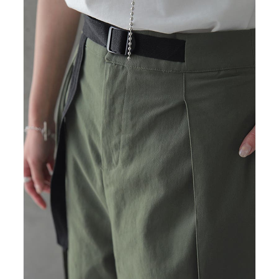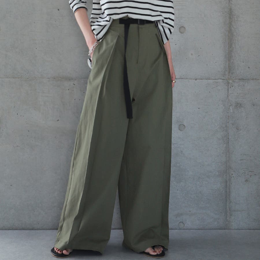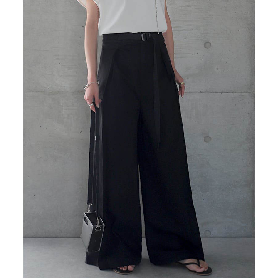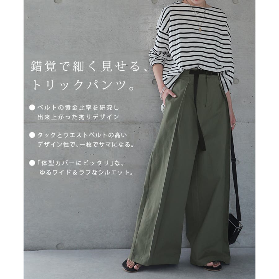 飾りベルトがアクセントになる、ゆるっとワイドパンツ。