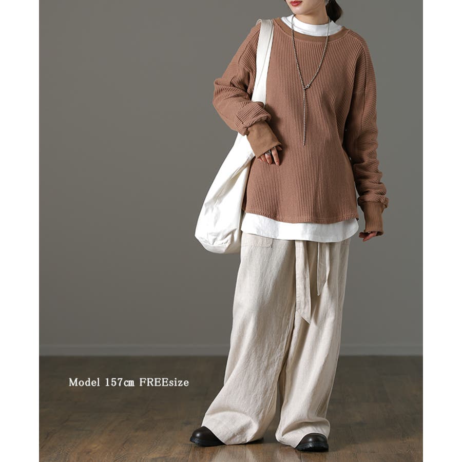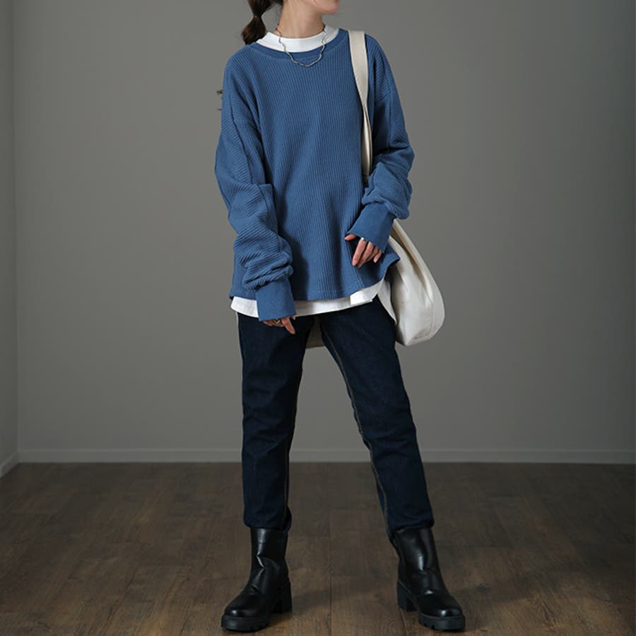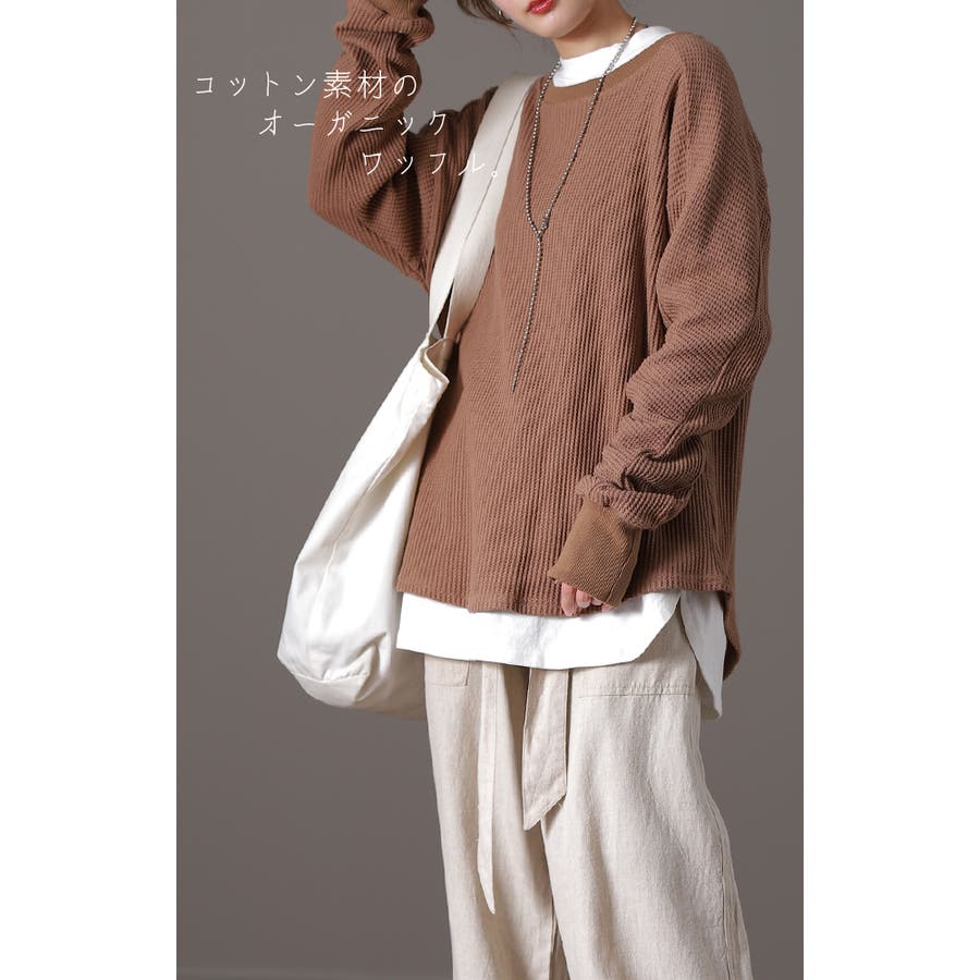 何かと着回しやすいワッフル素材のベーシックなトップス。