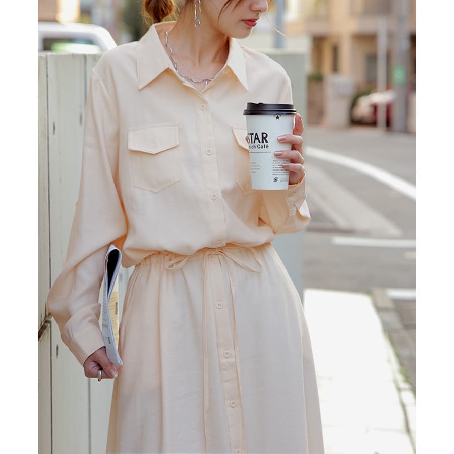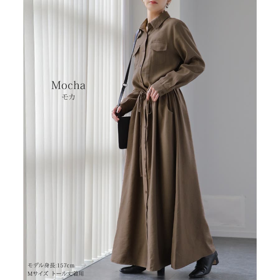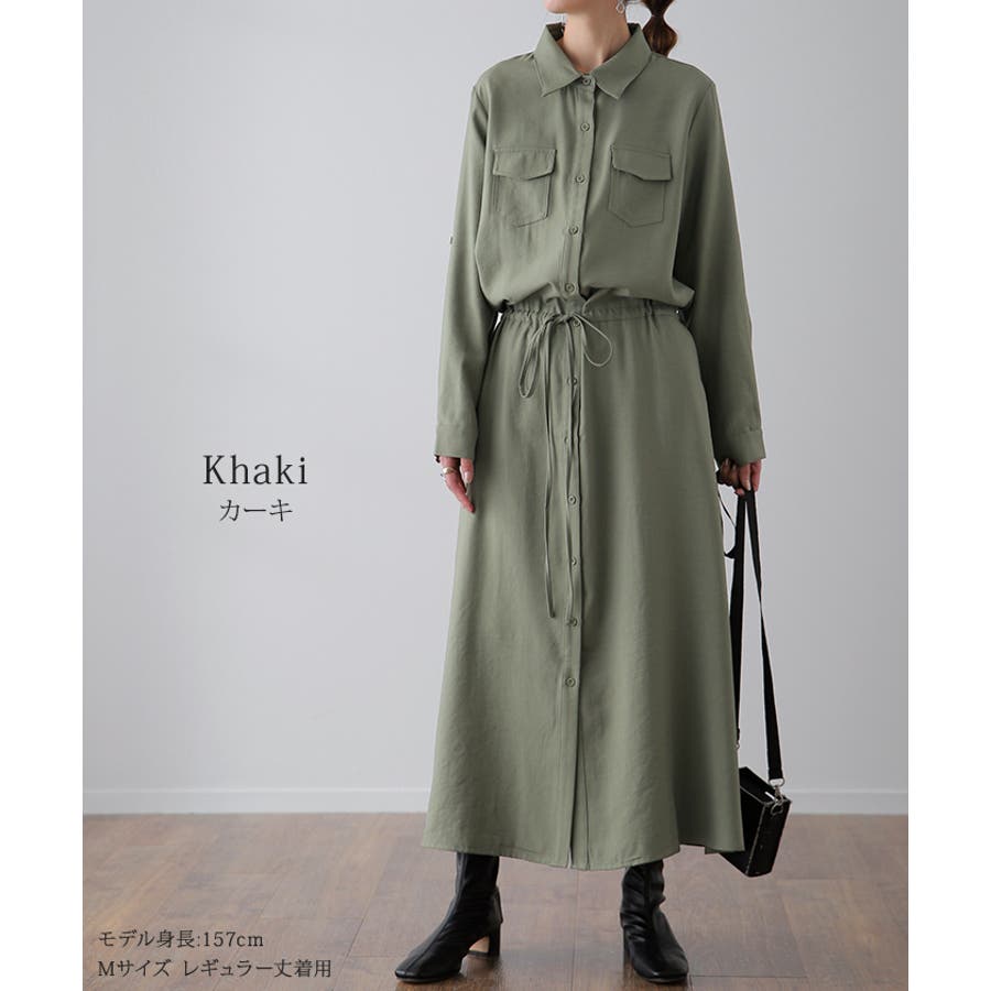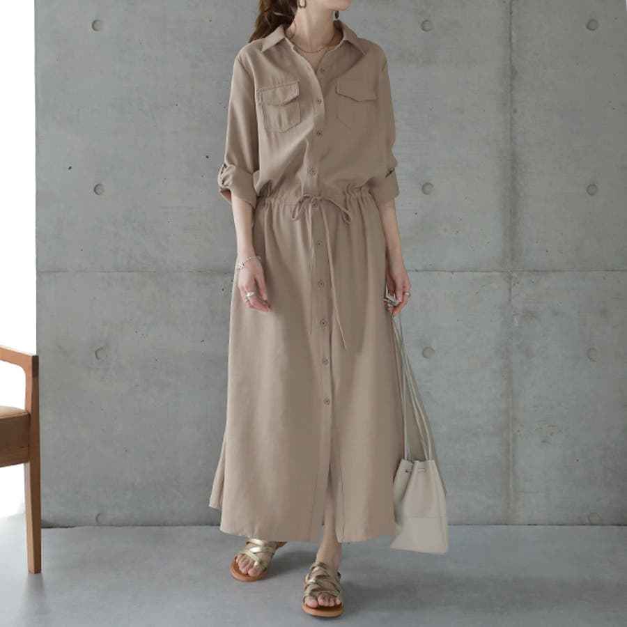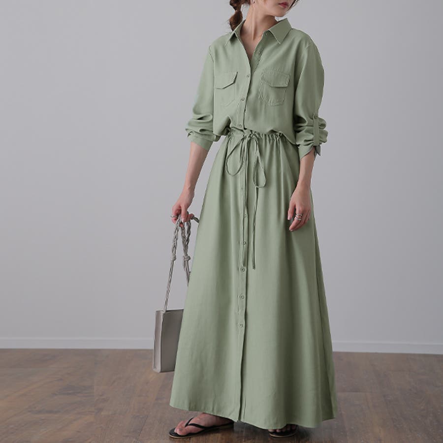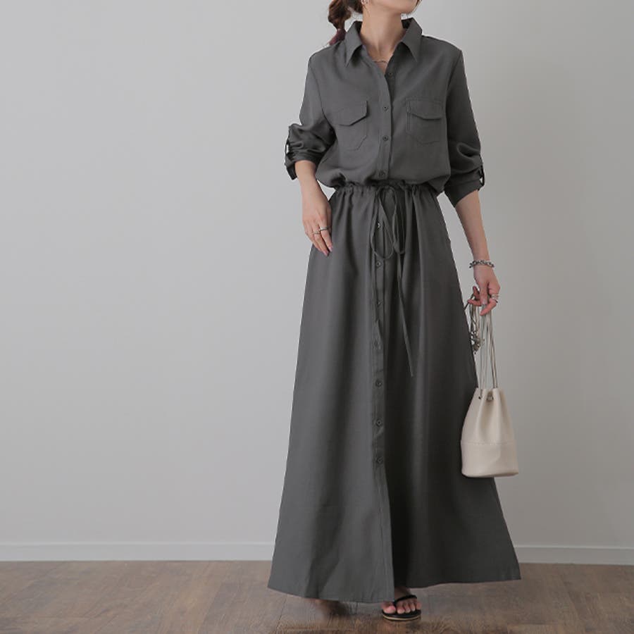 胸もとにフラップポケットをあしらったサファリテイストのロングシャツワンピース。